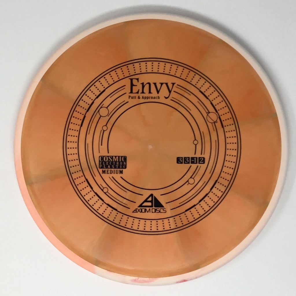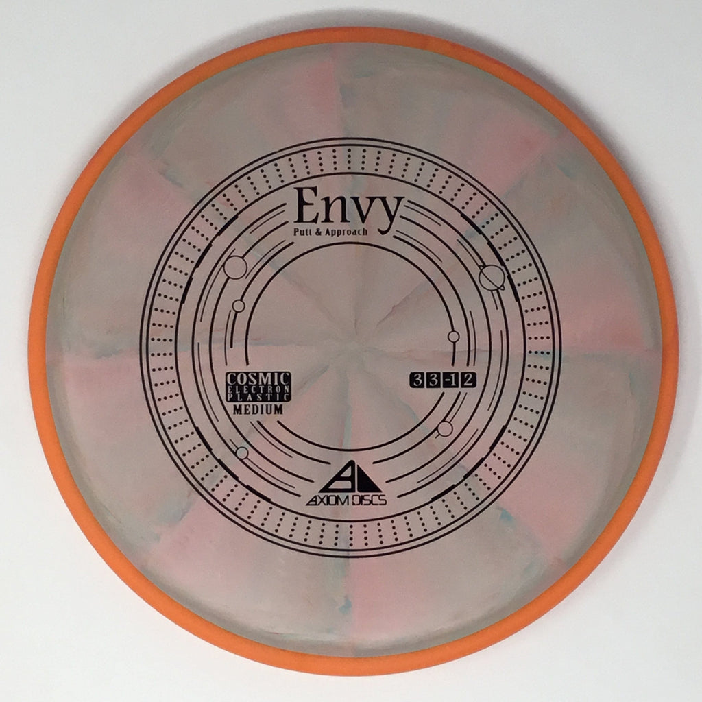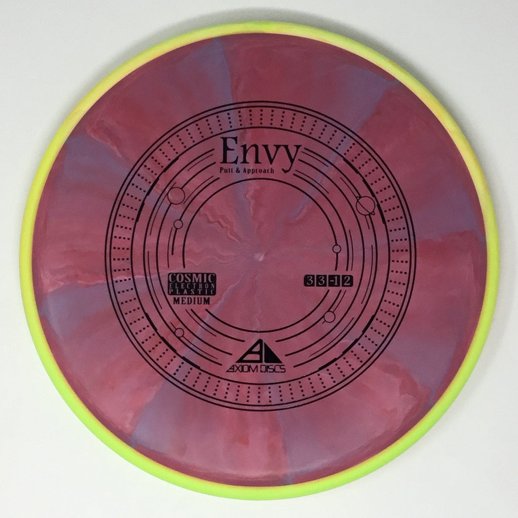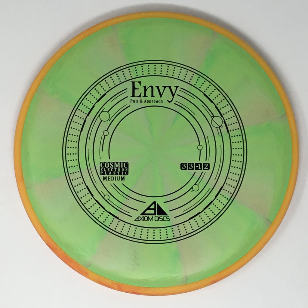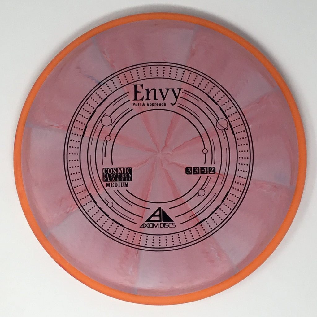 The Envy is a slightly overstable putt and approach disc. The Envy has a smooth modern feel that fits in the hand perfectly, lending confidence for both putt and approach duties. The Envy exhibits reliable high-speed stability and a minimal fade. With a slightly lower profile and cruising speed than the Ion and Anode class, the Envy is a uniquely “lid-like” stable putter. The Envy’s defining flight characteristic is its ability to hold a straight flight for power throwers, but also be a dependably stable approach disc for lower power throwers. Its medium depth offers a healthy balance of straight flight paired with an easy clean release. While its flight stability is largely similar to the MVP Ion, the Envy offers an entirely new feel. Its versatile stability on any type of shot will help the Envy find its way into every Axiom thrower’s bag.