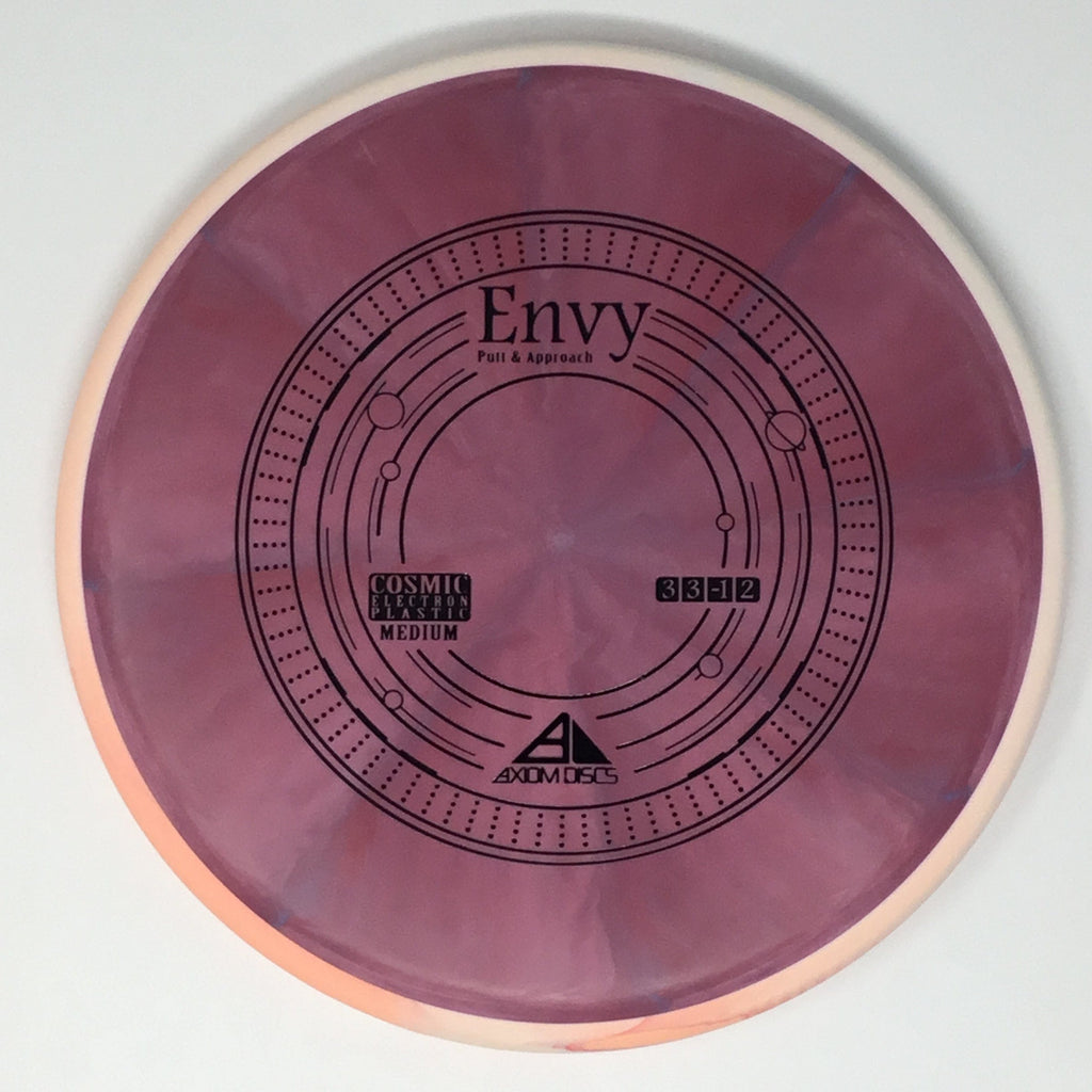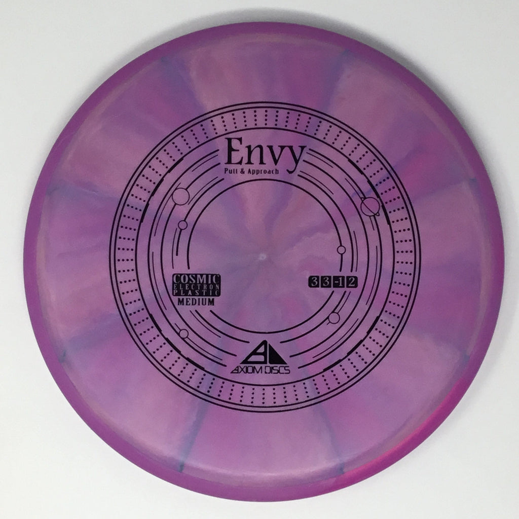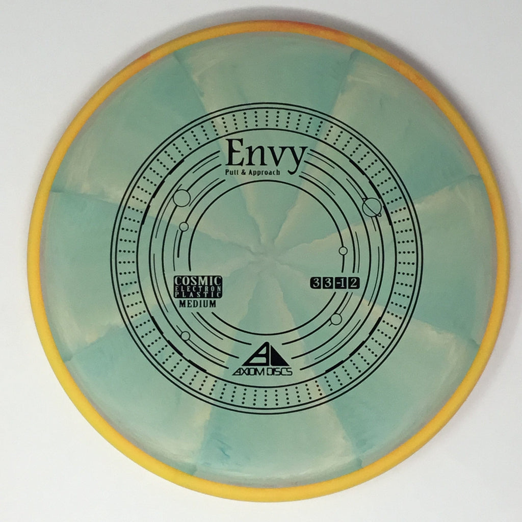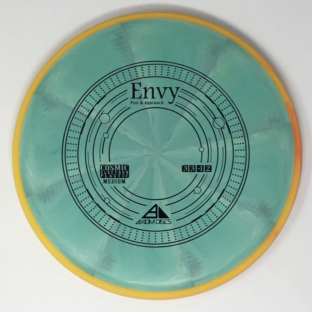 The Envy is a slightly overstable putt and approach disc. The Envy has a smooth modern feel that fits in the hand perfectly, lending confidence for both putt and approach duties. The Envy exhibits reliable high-speed stability and a minimal fade. With a slightly lower profile and cruising speed than the Ion and Anode class, the Envy is a uniquely “lid-like” stable putter. The Envy’s defining flight characteristic is its ability to hold a straight flight for power throwers, but also be a dependably stable approach disc for lower power throwers. Its medium depth offers a healthy balance of straight flight paired with an easy clean release. While its flight stability is largely similar to the MVP Ion, the Envy offers an entirely new feel. Its versatile stability on any type of shot will help the Envy find its way into every Axiom thrower’s bag.