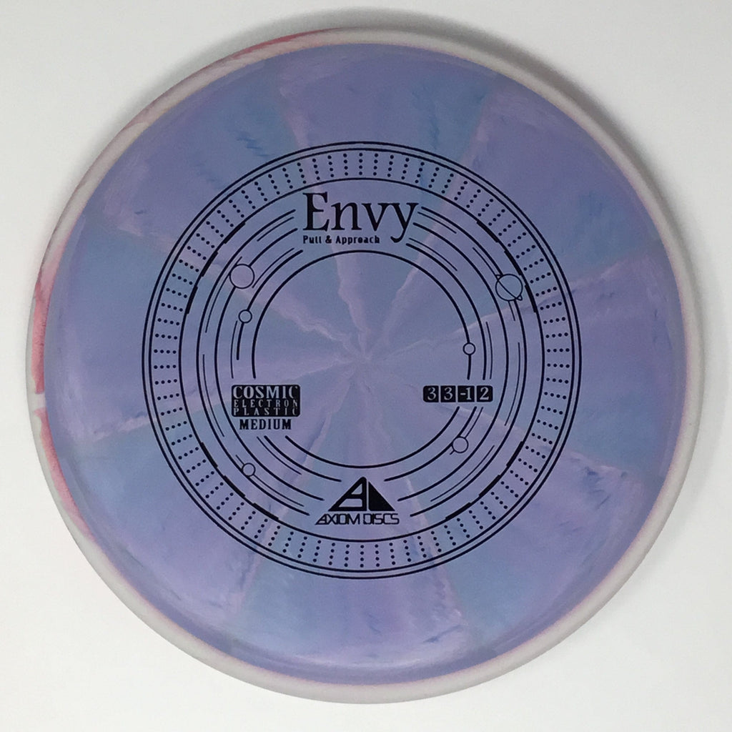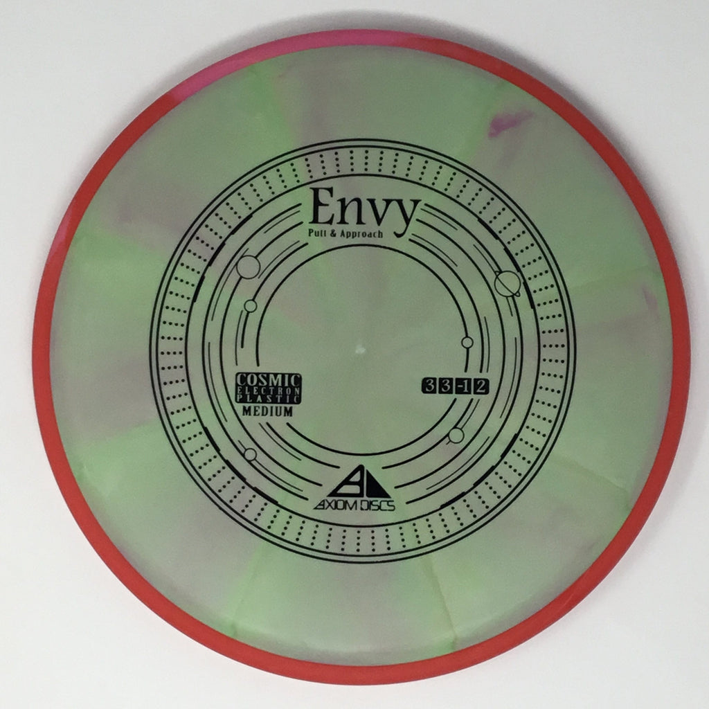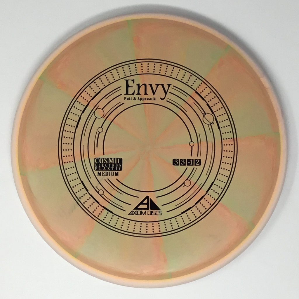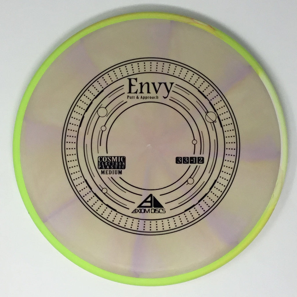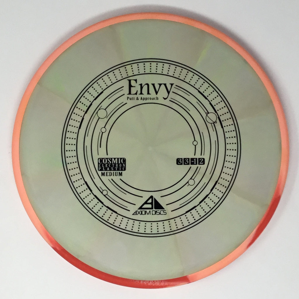 The Envy is a slightly overstable putt and approach disc. The Envy has a smooth modern feel that fits in the hand perfectly, lending confidence for both putt and approach duties. The Envy exhibits reliable high-speed stability and a minimal fade. With a slightly lower profile and cruising speed than the Ion and Anode class, the Envy is a uniquely “lid-like” stable putter. The Envy’s defining flight characteristic is its ability to hold a straight flight for power throwers, but also be a dependably stable approach disc for lower power throwers. Its medium depth offers a healthy balance of straight flight paired with an easy clean release. While its flight stability is largely similar to the MVP Ion, the Envy offers an entirely new feel. Its versatile stability on any type of shot will help the Envy find its way into every Axiom thrower’s bag.