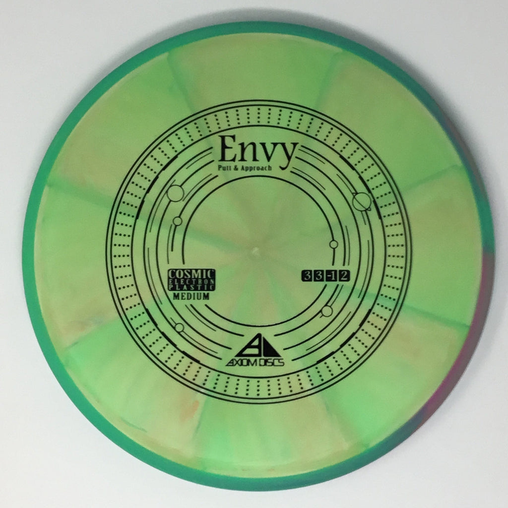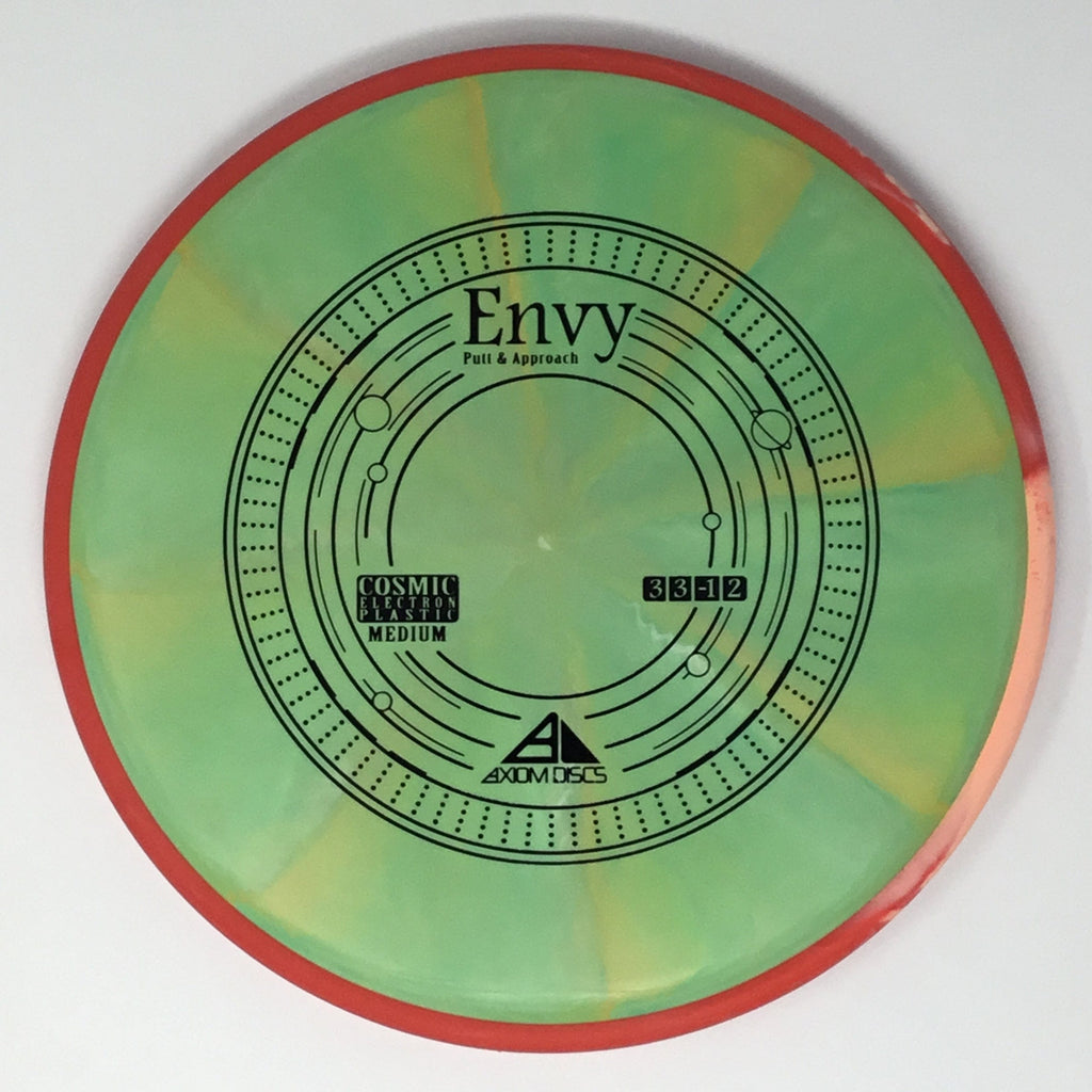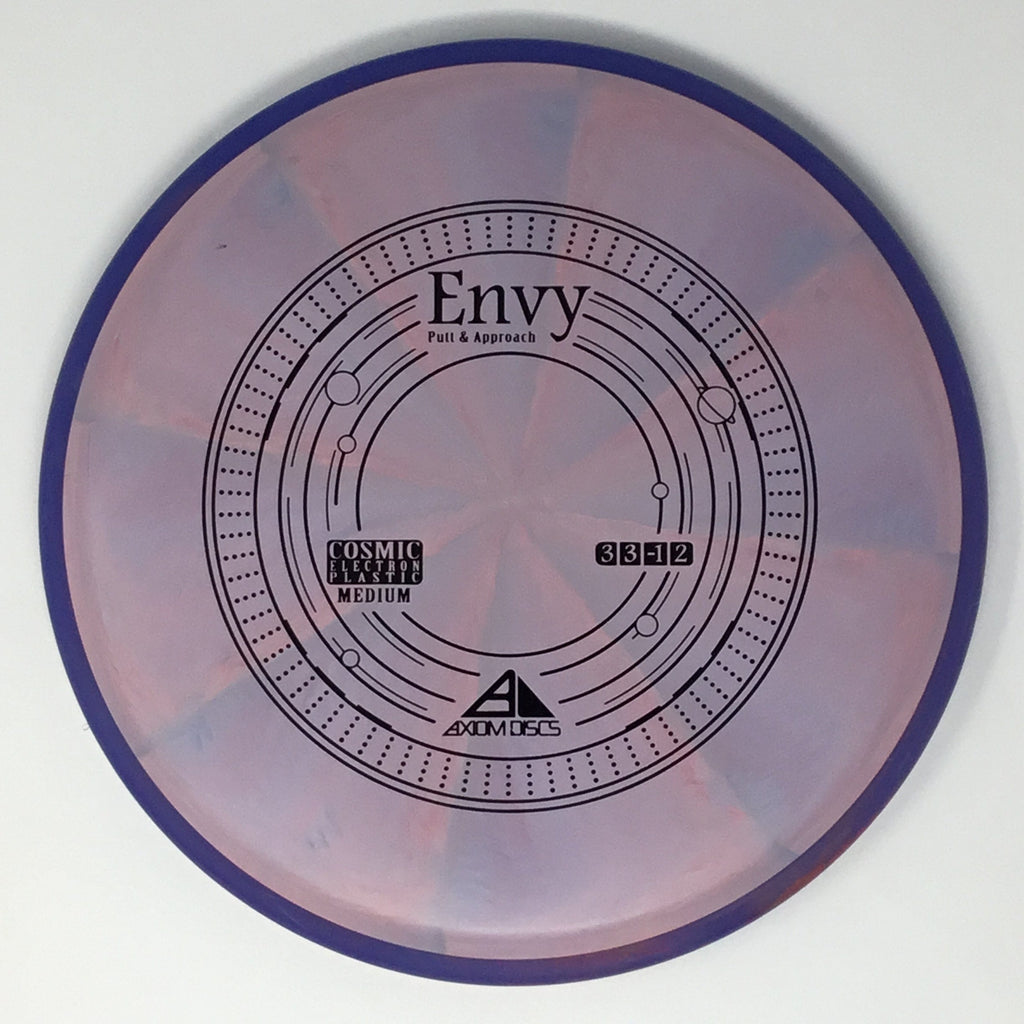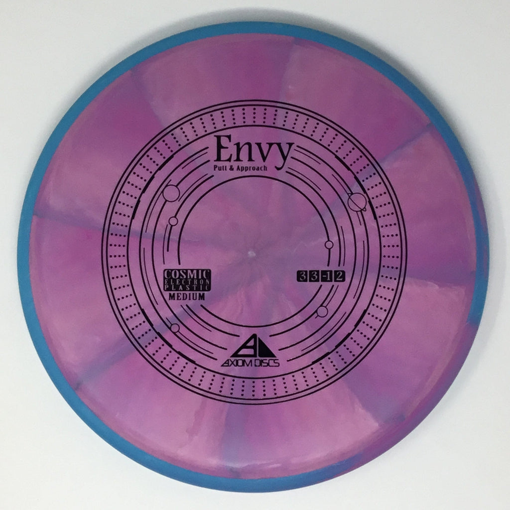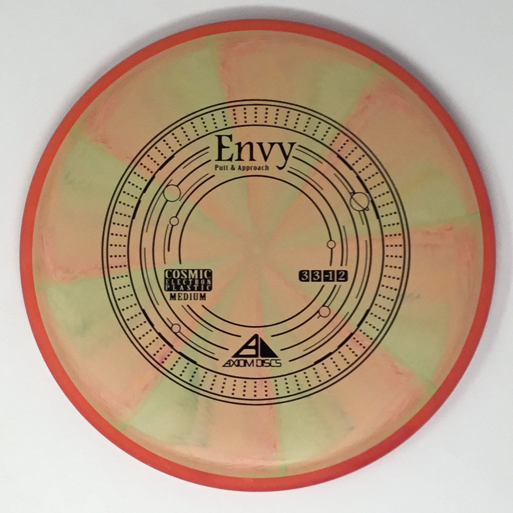 The Envy is a slightly overstable putt and approach disc. The Envy has a smooth modern feel that fits in the hand perfectly, lending confidence for both putt and approach duties. The Envy exhibits reliable high-speed stability and a minimal fade. With a slightly lower profile and cruising speed than the Ion and Anode class, the Envy is a uniquely “lid-like” stable putter. The Envy’s defining flight characteristic is its ability to hold a straight flight for power throwers, but also be a dependably stable approach disc for lower power throwers. Its medium depth offers a healthy balance of straight flight paired with an easy clean release. While its flight stability is largely similar to the MVP Ion, the Envy offers an entirely new feel. Its versatile stability on any type of shot will help the Envy find its way into every Axiom thrower’s bag.