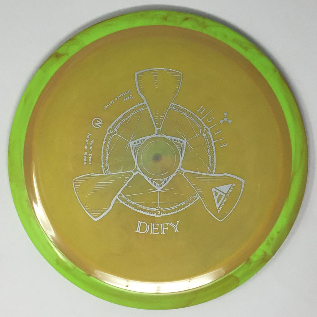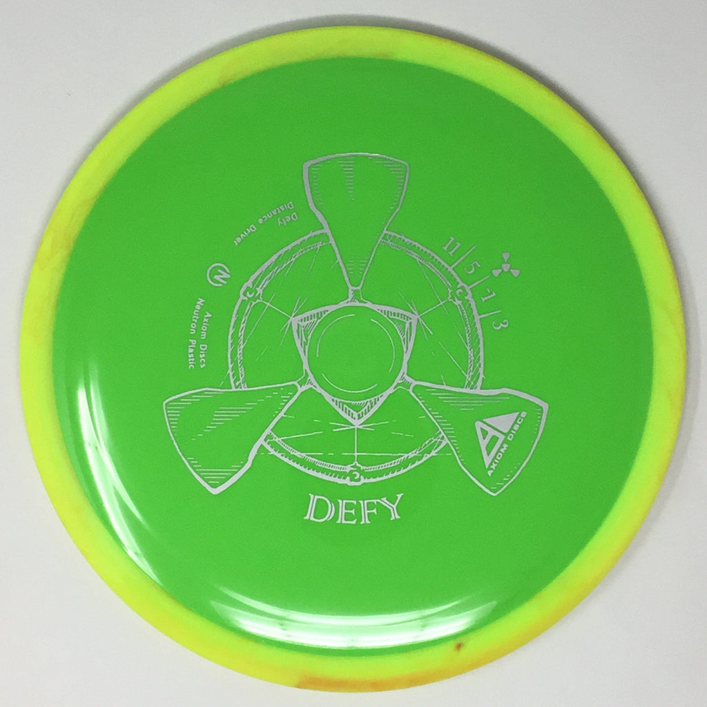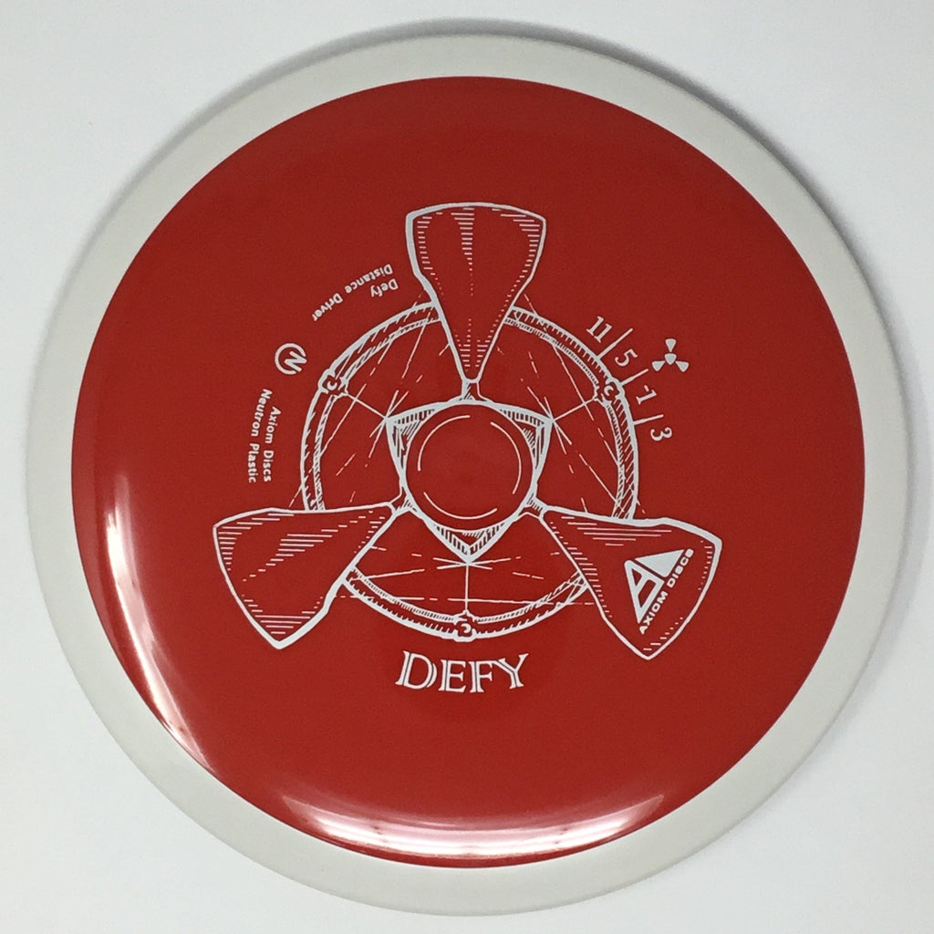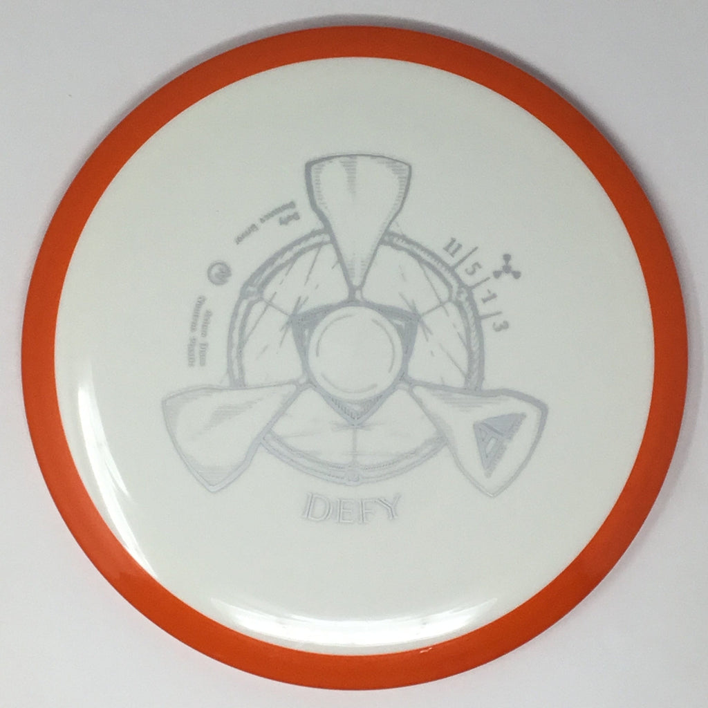 The Defy is a stable-overstable high speed distance driver. The Defy is straight with a nice bite of overstability at the end, and is best described as a more stable MVP Photon or a longer Axiom Clash. Like the Clash the Defy exhibits remarkable resistance to turnover even at high power. Players seeking a long straight power driver will appreciate the line-locking tendencies of the Defy, and throwers not fully powering the Defy will still get a highly useable long overstable disc.