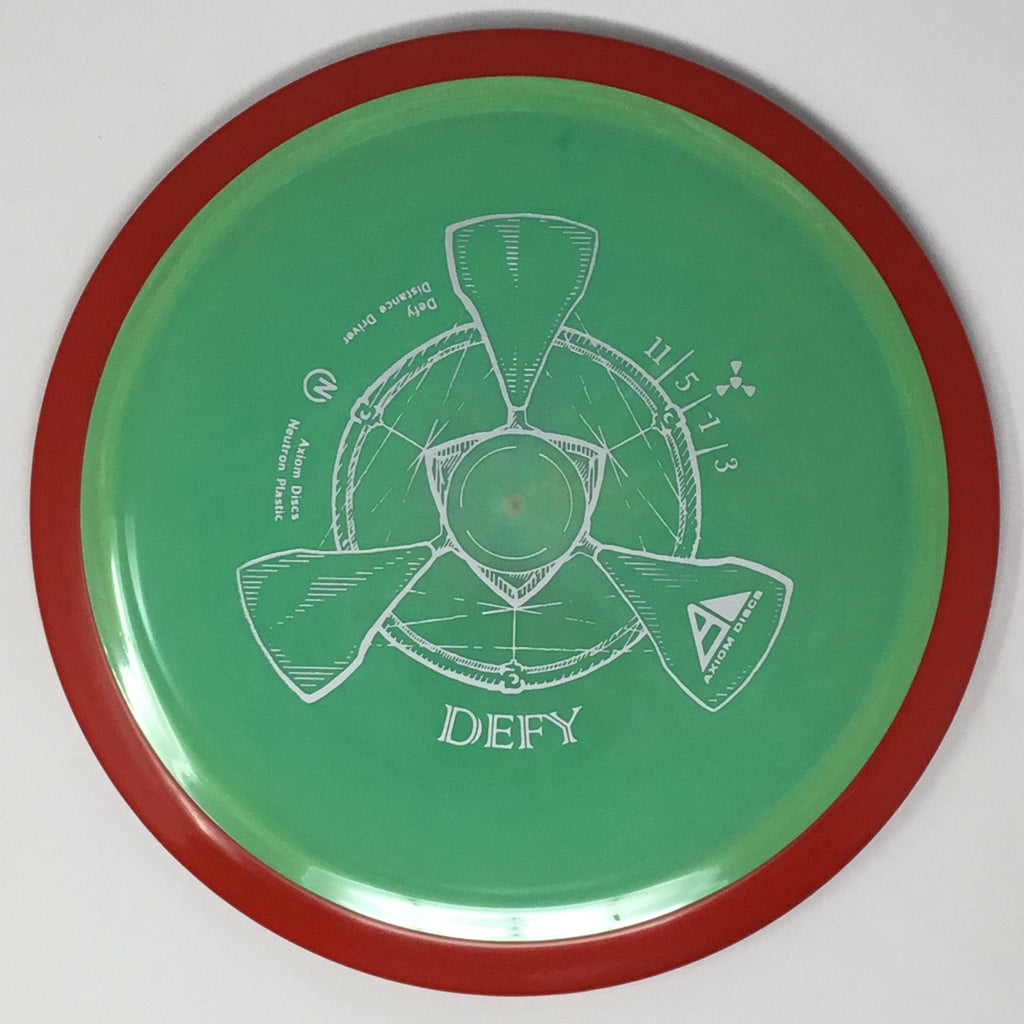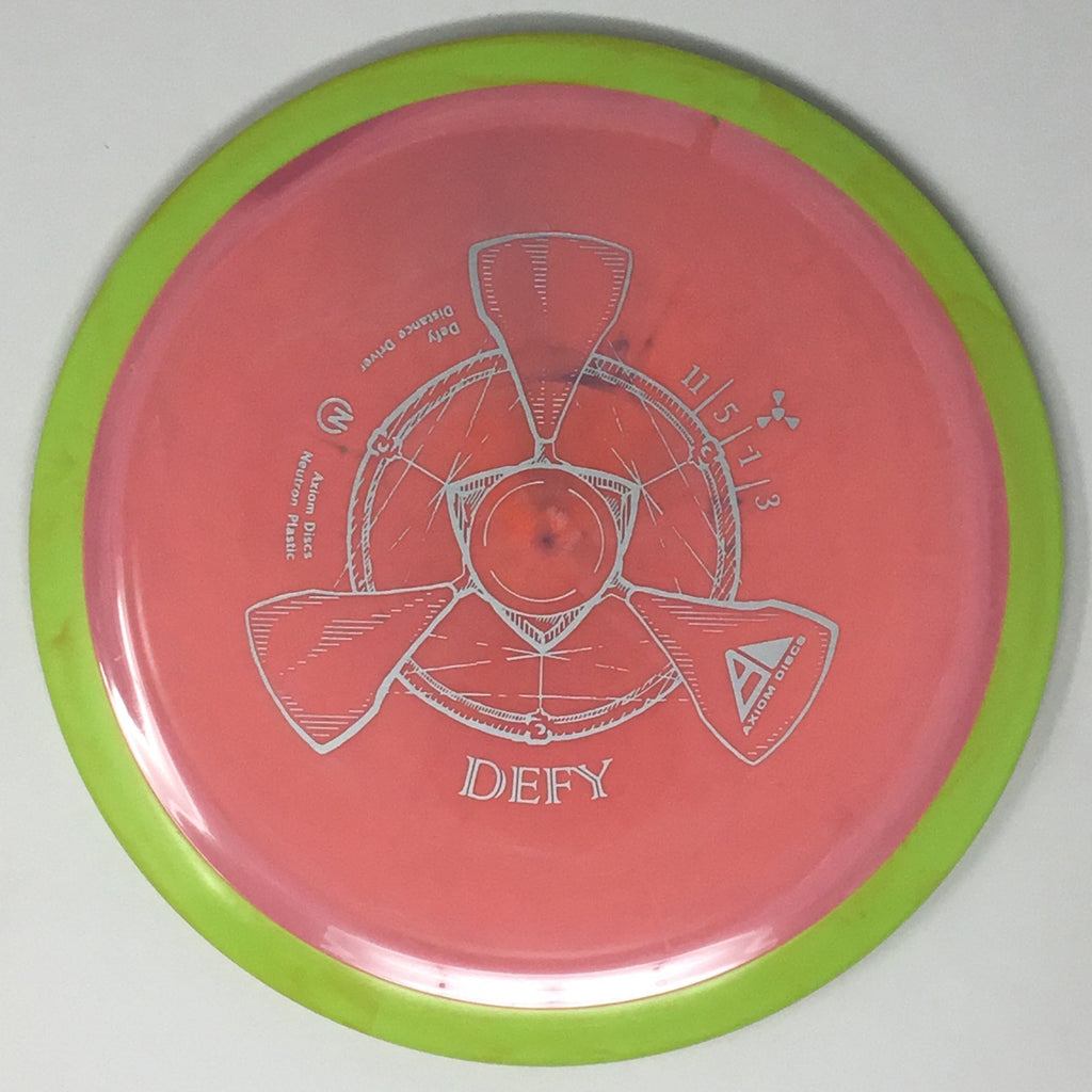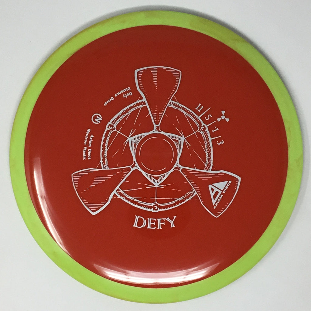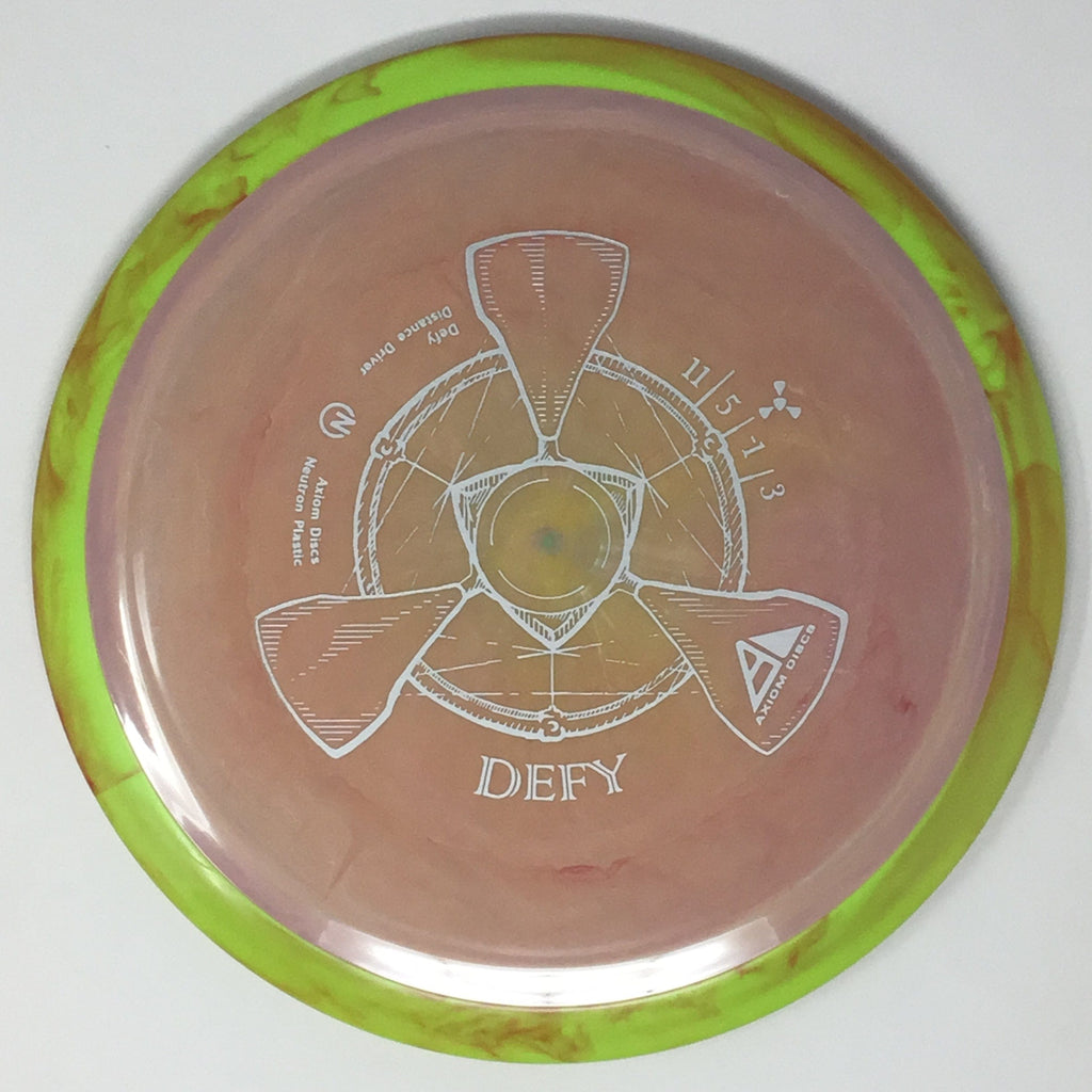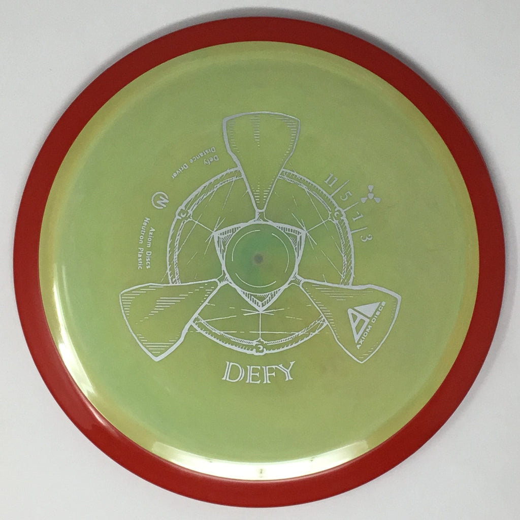 The Defy is a stable-overstable high speed distance driver. The Defy is straight with a nice bite of overstability at the end, and is best described as a more stable MVP Photon or a longer Axiom Clash. Like the Clash the Defy exhibits remarkable resistance to turnover even at high power. Players seeking a long straight power driver will appreciate the line-locking tendencies of the Defy, and throwers not fully powering the Defy will still get a highly useable long overstable disc.