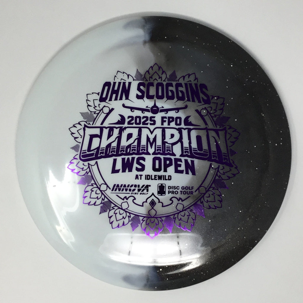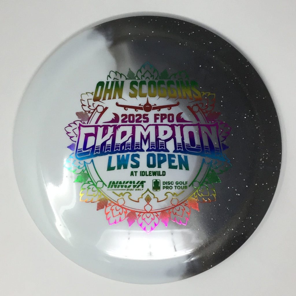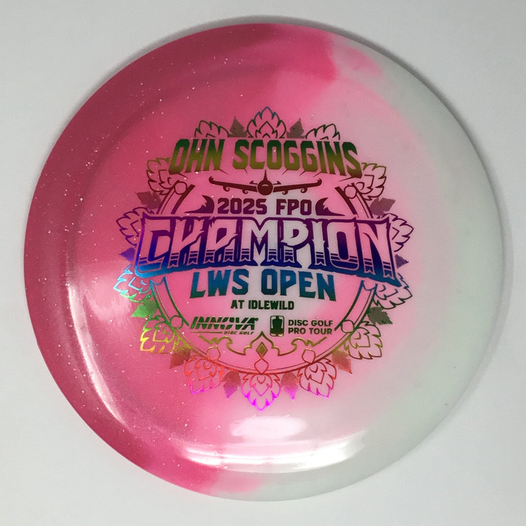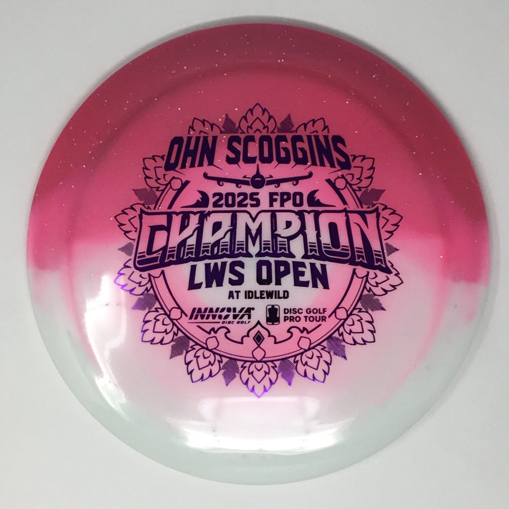 Ohn Scoggins Halo Champion Destroyer – When you watch Ohn Scoggins play it is evident that she loves to lean on the Destroyer for all of those forehand flex shots. The stability and glide that these Destroyers have is what everyone is looking for in a pure distance driver. Ohn loves to lean on the Innova Destroyer for tons of shot shapes. The Halo Champion plastic is as pretty as it gets and it has tons of durability. Ohn won the 2024 The Open at Austin and this run commemorates that awesome win. The Ohn Scoggins Halo Champion Destroyer is the perfect disc to support Ohn. Whether you are hanging it on the wall or throwing it all over the course, make sure you pick one up! A substantial portion of each sale of a Tour Series disc supports the touring efforts of Ohn Scoggins.