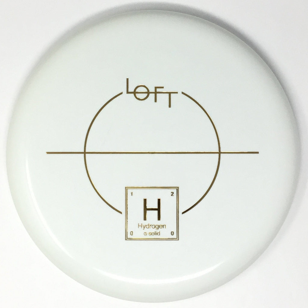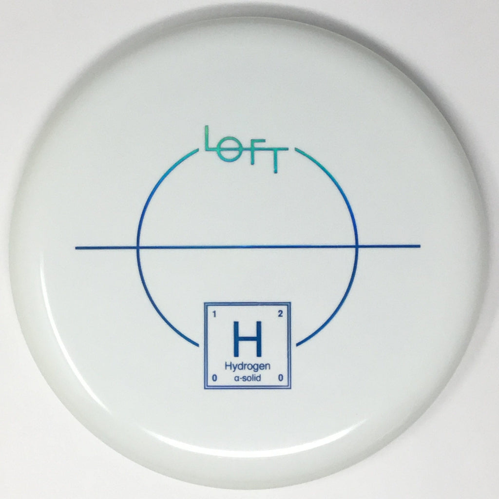 The box with the disc's name is a reference to the periodic table - also refereing to our scientific approach to disc design. Therefore we used the chemical symbol H for Hydrogen, but instead of keeping the atomic number and weight etc. we used the four conventional flight characteristics; speed (top left), glide (top right), turn (bottom left) and fade (bottom right).