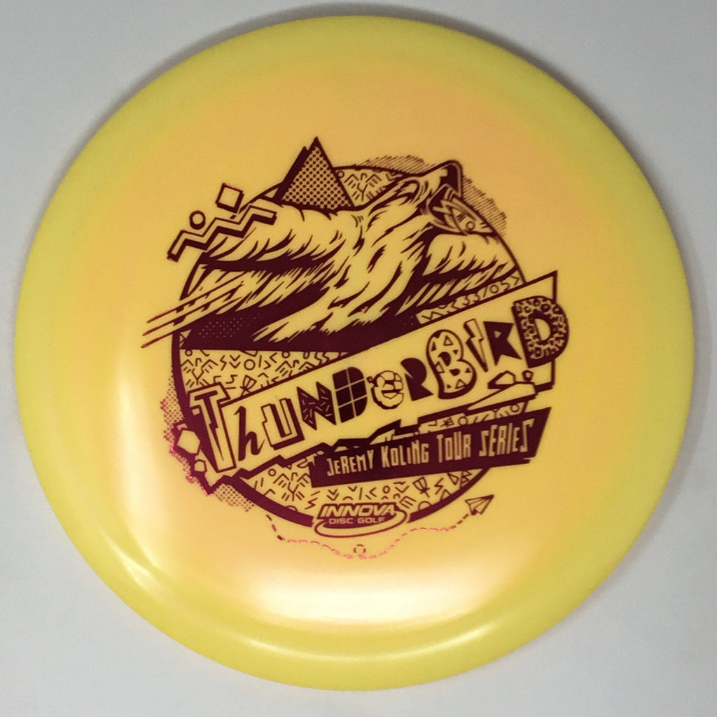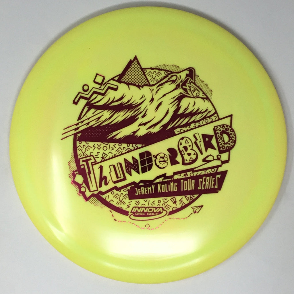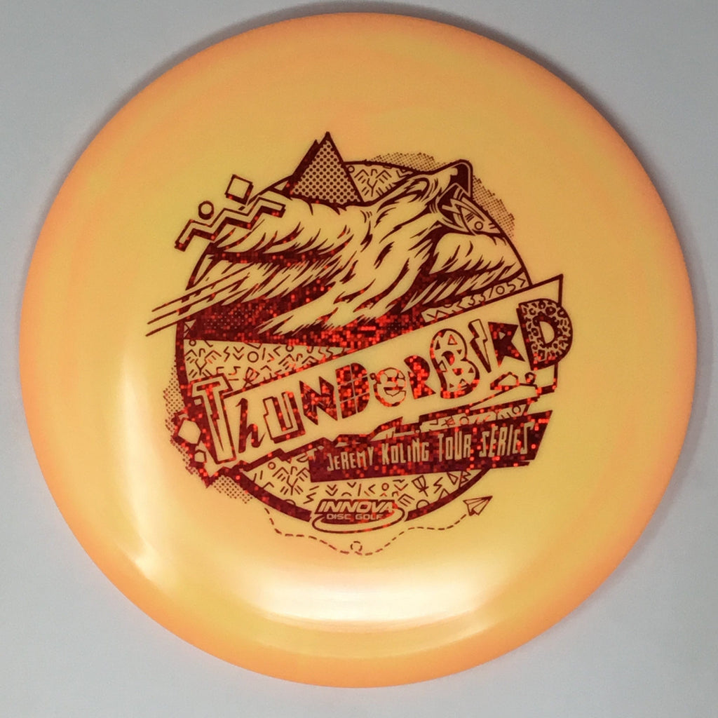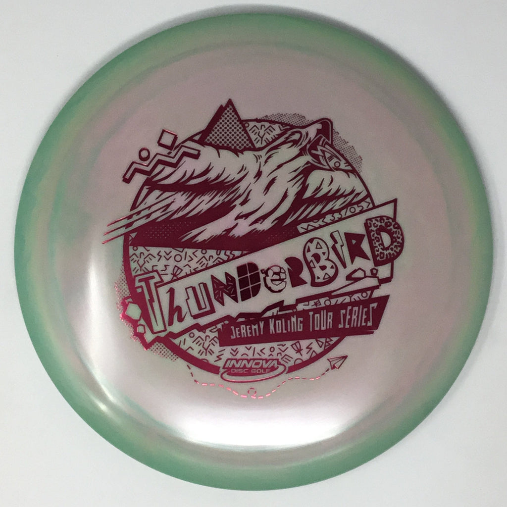 Jeremy Koling 2021 Tour Series: Big Jerm went radically retro with the Thunderbird this year. The Koling Thunderbird is just stiff enough for all the flicks while being soft enough to give you all the feel in the flight plate one would need to smash a backhand. As the Koling Thunderbird is known for, these have a bit more stability than your standard Thunderbird. A substantial portion of each sale will benefit Jeremy Koling and his touring efforts.