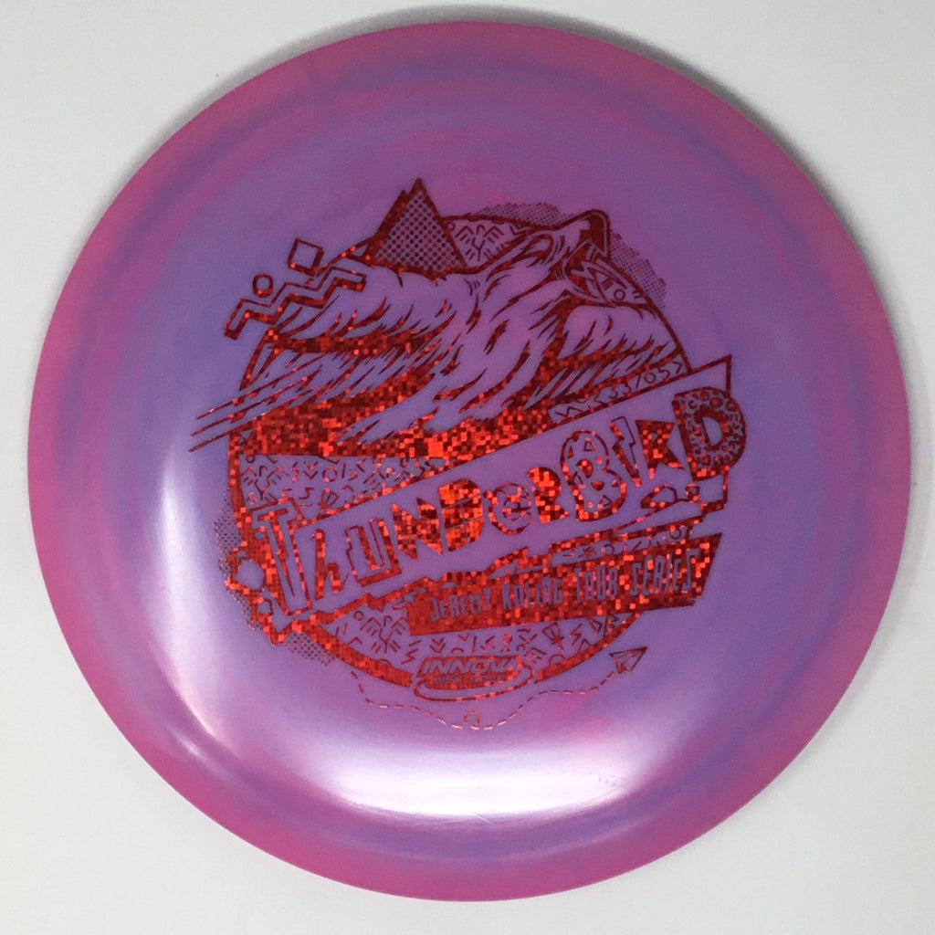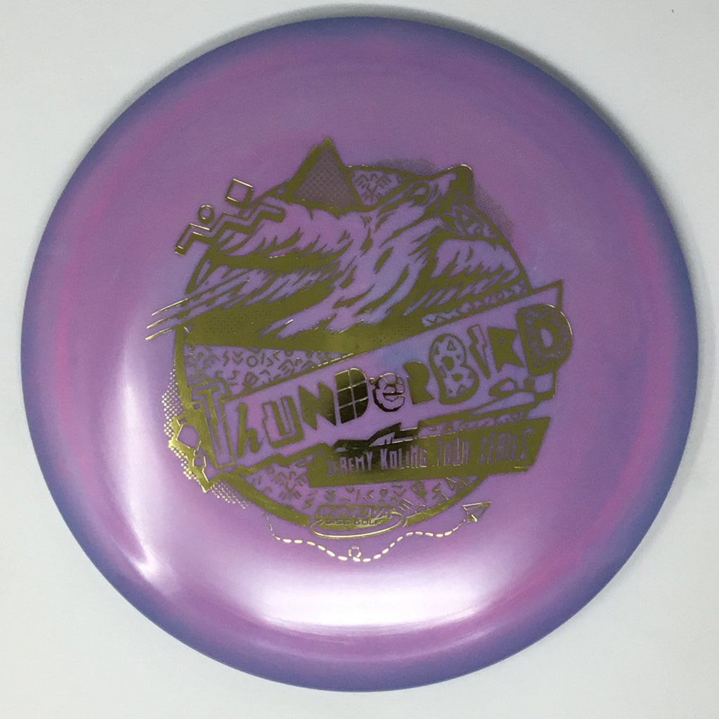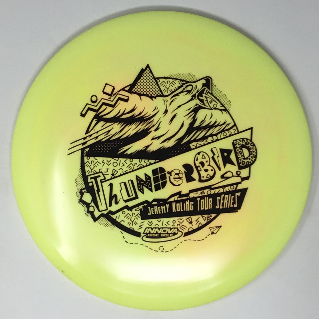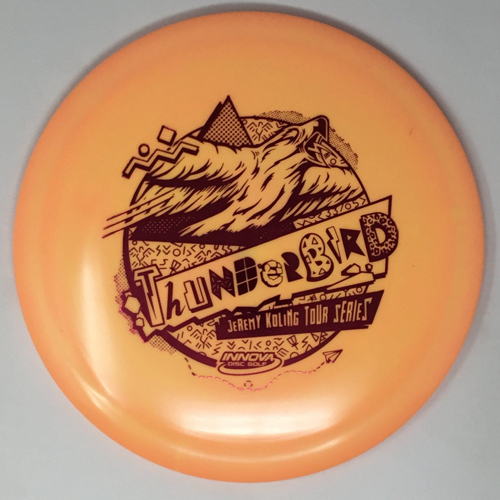 Jeremy Koling 2021 Tour Series: Big Jerm went radically retro with the Thunderbird this year. The Koling Thunderbird is just stiff enough for all the flicks while being soft enough to give you all the feel in the flight plate one would need to smash a backhand. As the Koling Thunderbird is known for, these have a bit more stability than your standard Thunderbird. A substantial portion of each sale will benefit Jeremy Koling and his touring efforts.
