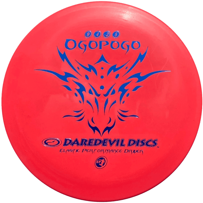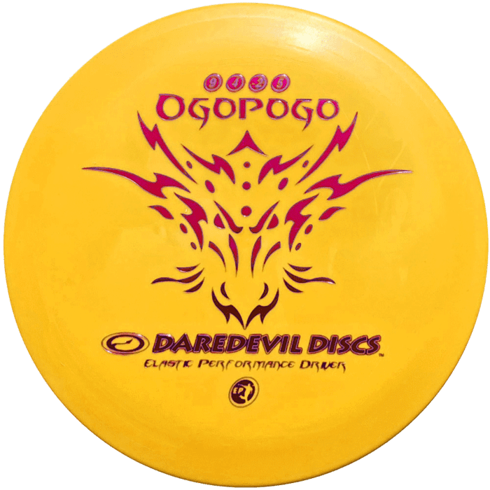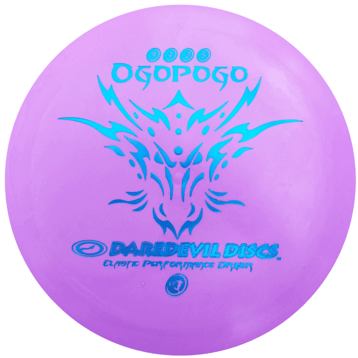 Produced in plastic usually reserved for putters, the ‘Ogopogo’ takes all the great qualities of the ‘Sabertooth/Mammoth’ and ‘Buffalo’, and gives the thrower one more thing;, stopping ability. The ‘Ogopogo’ doesn’t skip on grass, cement or dirt and when it hits a tree, it just drops and stops with no roll away, making it an awesome hill disc. Because of the nature of the ‘Elastic Performance’ plastic, this is not a disc for power throwers, it performs best at about 85% arm speed and is great in the cold.
