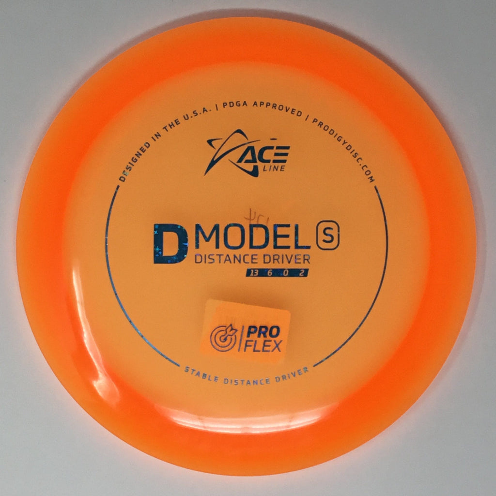 The D Model S is one of the first discs released in the Prodigy Ace Line. In the naming of this disc, the D stands for Distance while the S stands for Stable. The D Model S is described as having a slow turn with a soft fade when thrown with power. Prodigy's Ace Line discs are designed by Prodigy in the USA