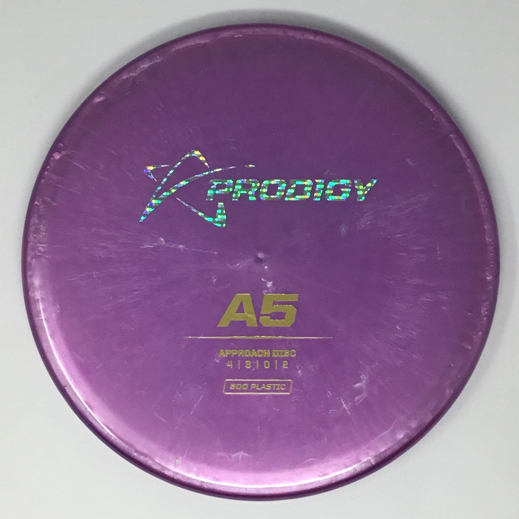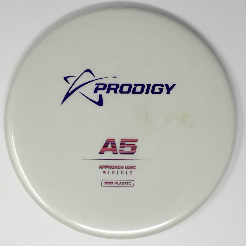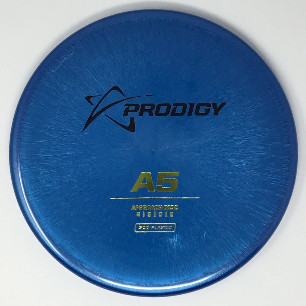 The Prodigy A5 is a slightly overstable approach disc that will work in to be a straight flyer. It has a nice, smooth feel with a shallow profile and flat top, which makes it ideal for sidearm approaches. It can handle torque well and has a mild finish on the end, so it won't skip too far from where it lands.