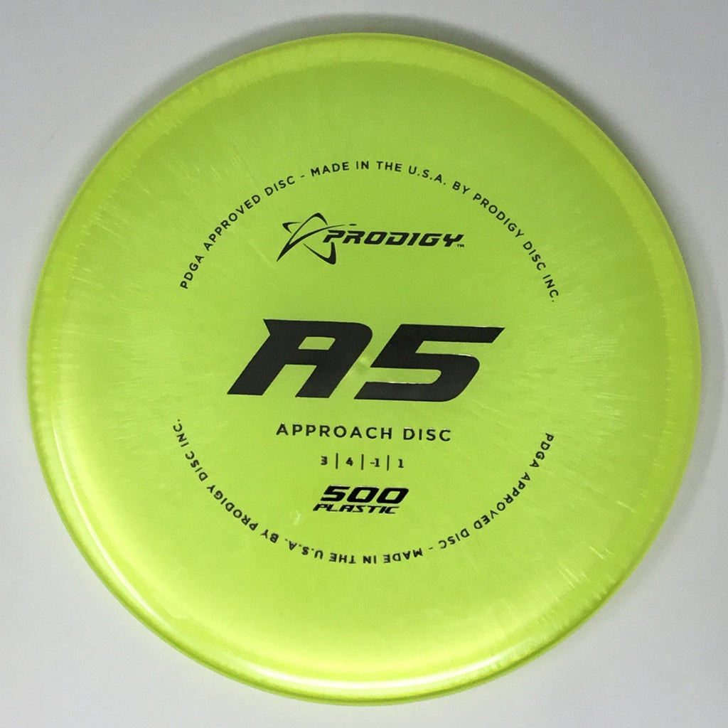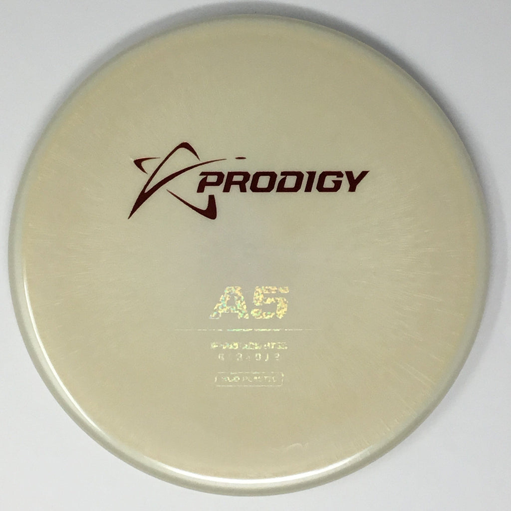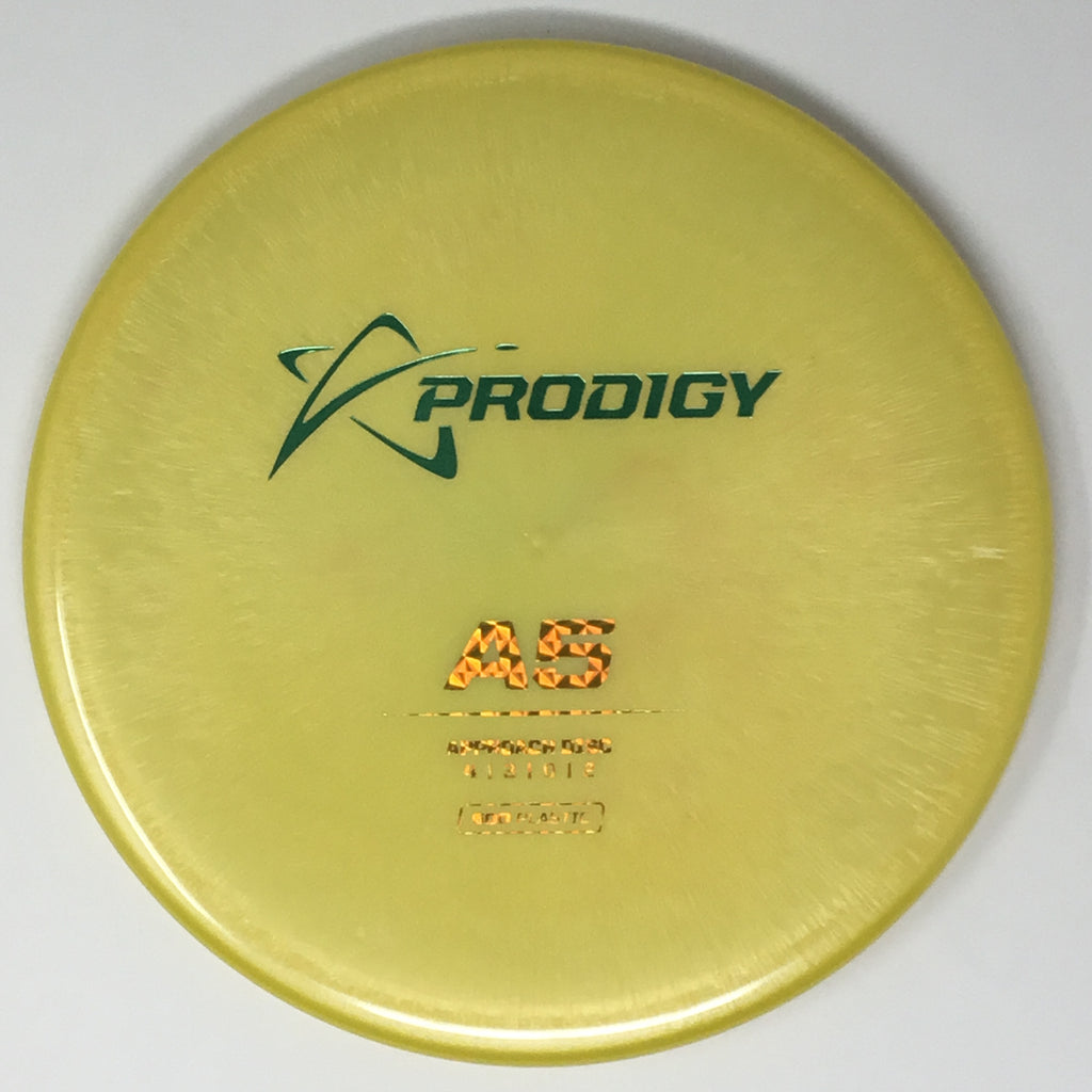 The Prodigy A5 is a slightly overstable approach disc that will work in to be a straight flyer. It has a nice, smooth feel with a shallow profile and flat top, which makes it ideal for sidearm approaches. It can handle torque well and has a mild finish on the end, so it won't skip too far from where it lands.