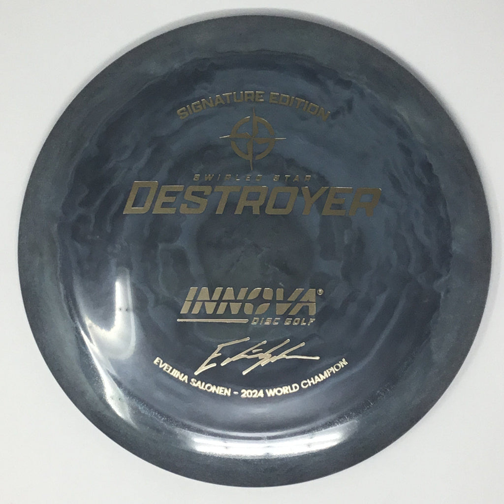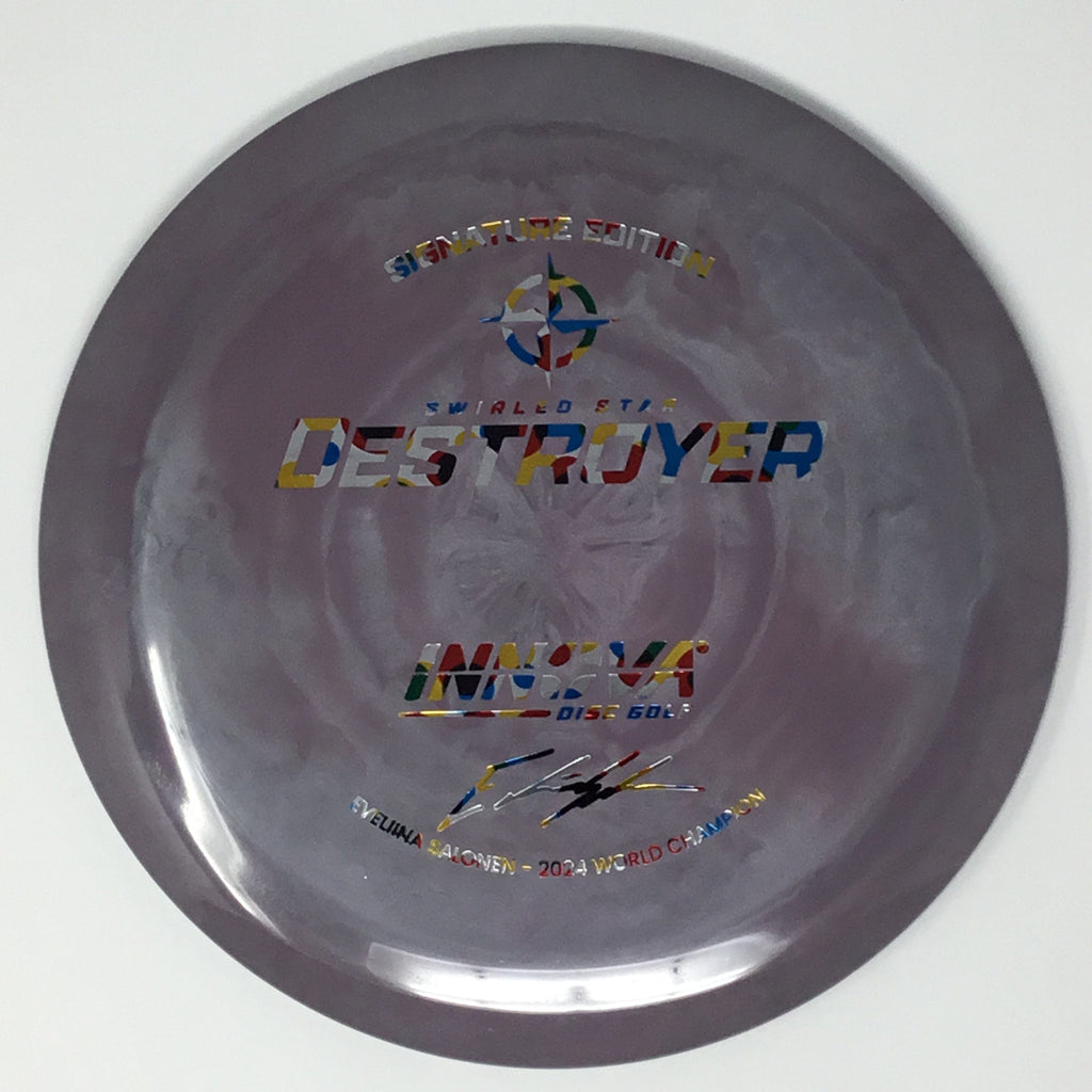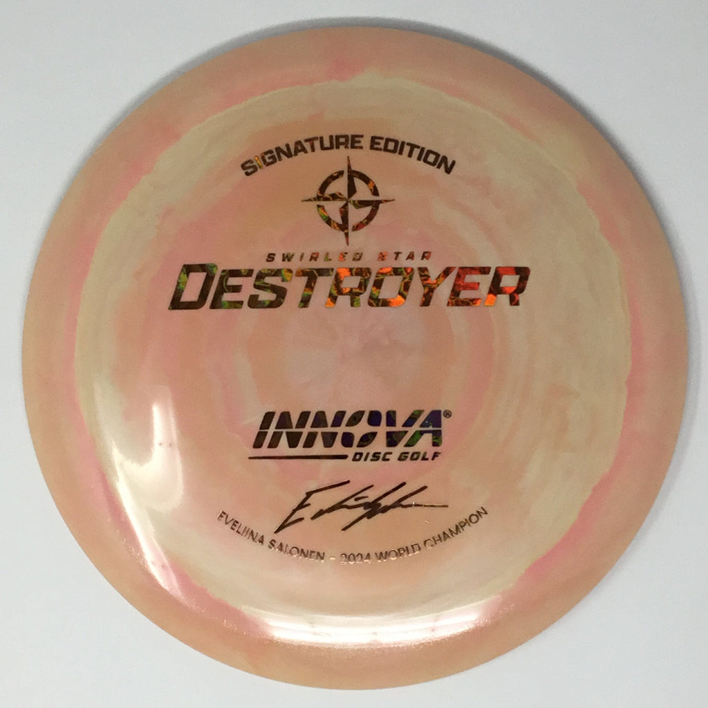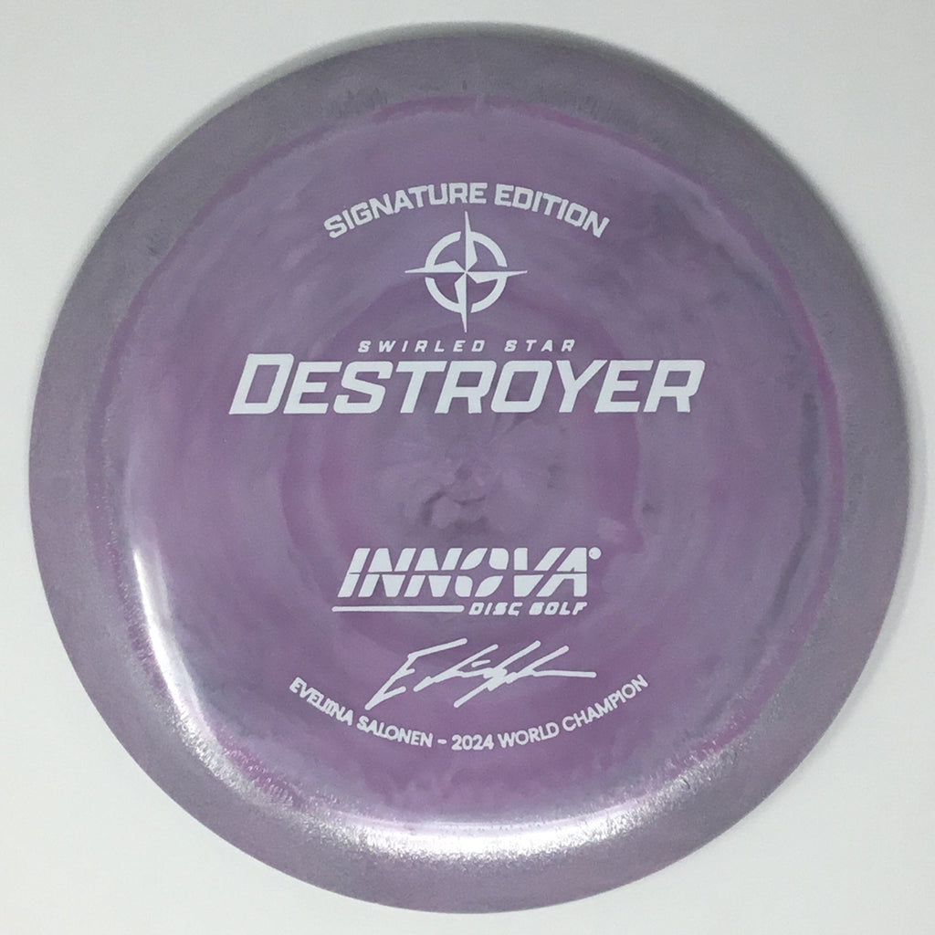 Eveliina Salonen Signature Edition Swirled Star Destroyer - Introducing the Eveliina Salonen Signature Swirled Star Destroyer—honoring her victory at the 2024 PDGA Pro World Championships. Featuring our gold-standard Distance Driver molded in a vibrant, swirled-Star blend with a minimalist, text-driven stamp. Available in <150g to 175g and endless material colors, swirl patterns, and foils—there’s a perfect disc for every player.