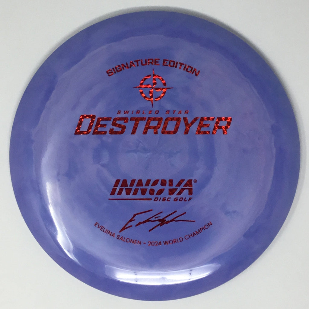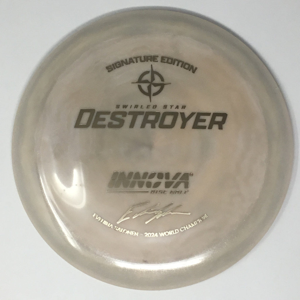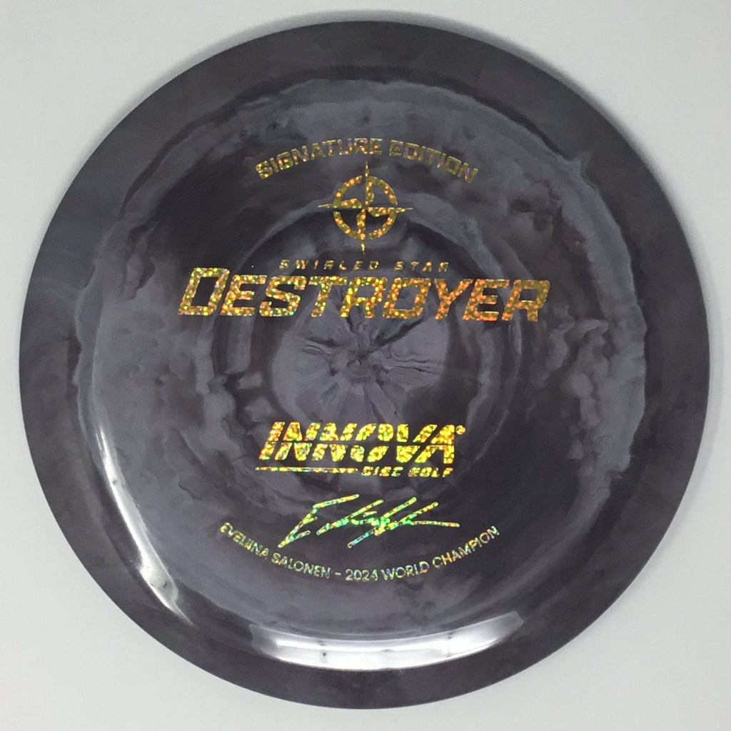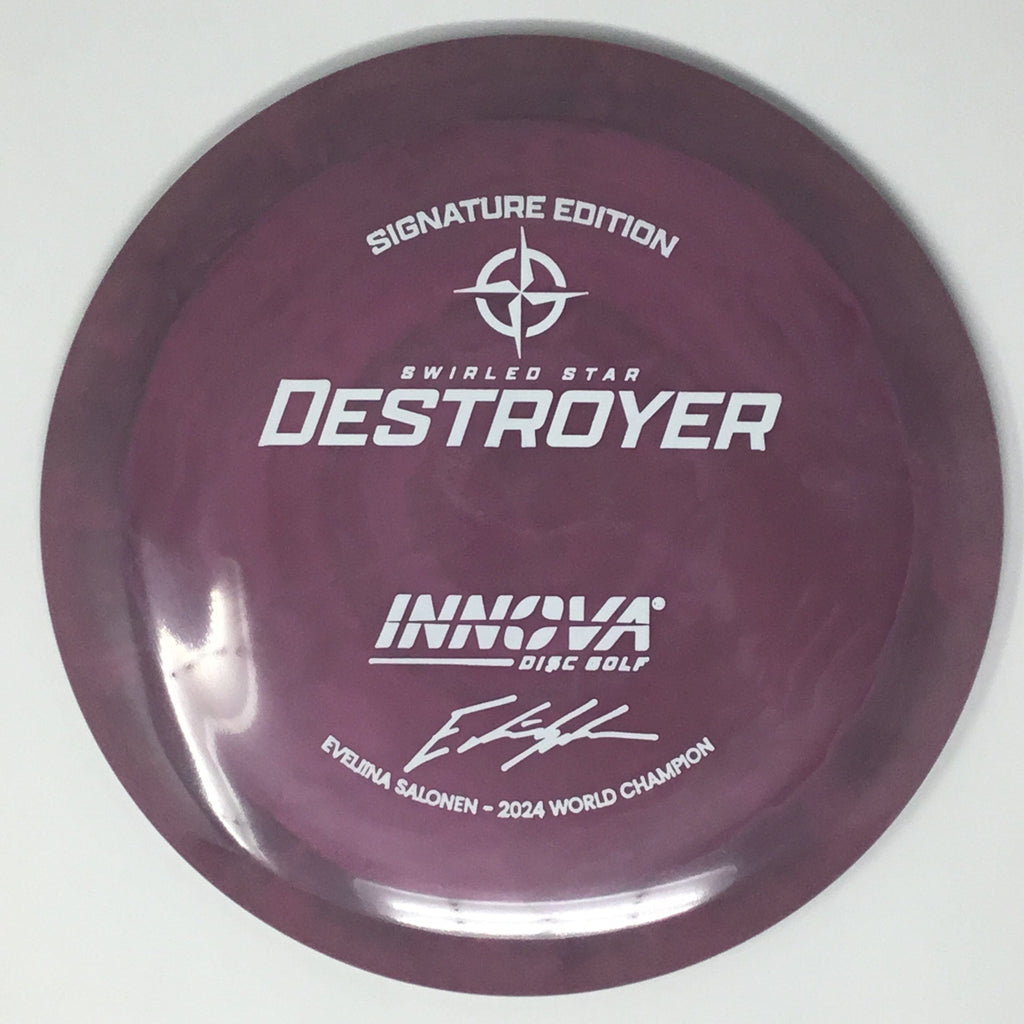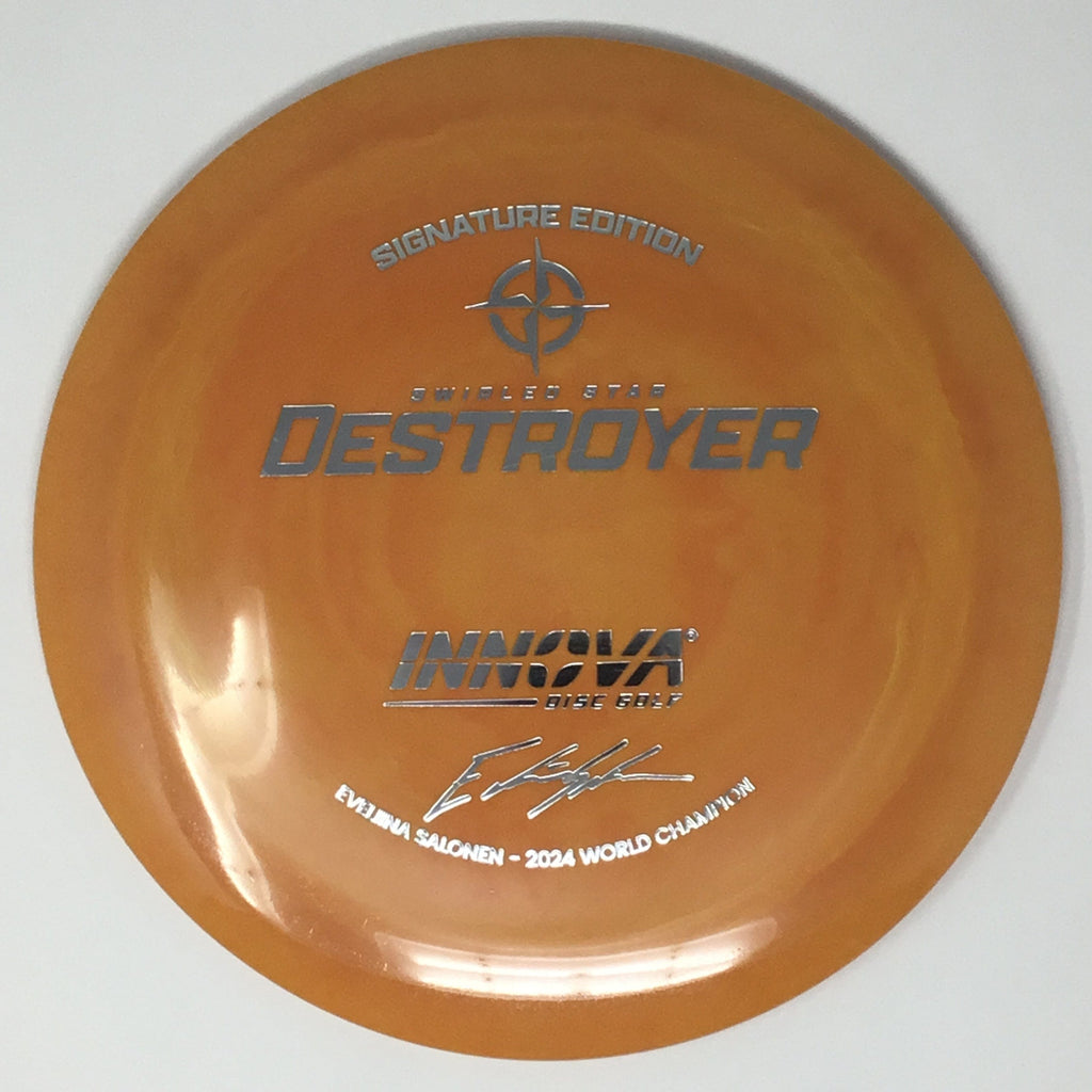Eveliina Salonen Signature Edition Swirled Star Destroyer - Introducing the Eveliina Salonen Signature Swirled Star Destroyer—honoring her victory at the 2024 PDGA Pro World Championships. Featuring our gold-standard Distance Driver molded in a vibrant, swirled-Star blend with a minimalist, text-driven stamp. Available in <150g to 175g and endless material colors, swirl patterns, and foils—there’s a perfect disc for every player.