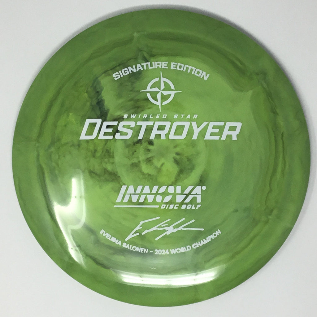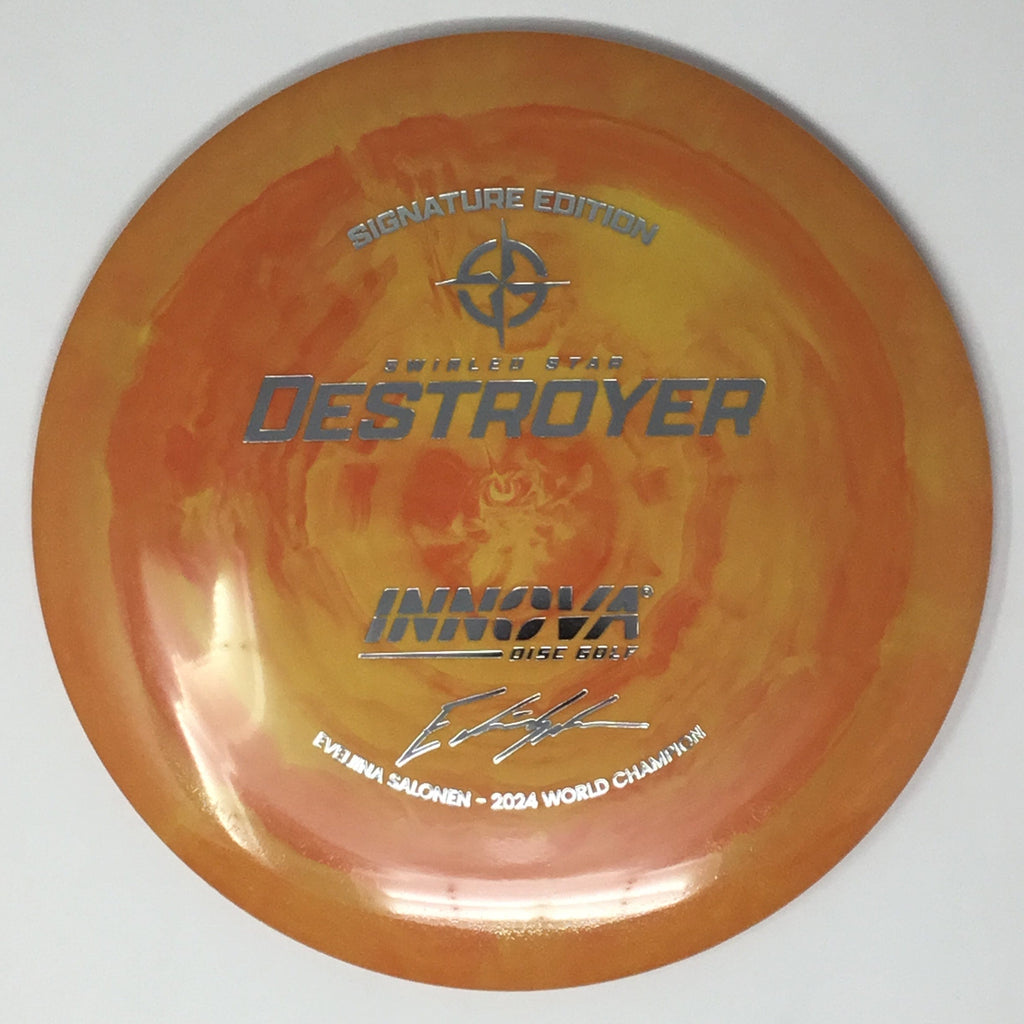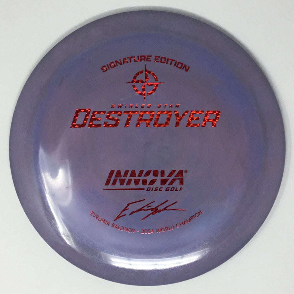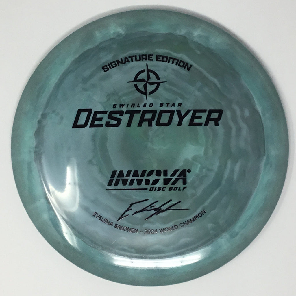 Eveliina Salonen Signature Edition Swirled Star Destroyer - Introducing the Eveliina Salonen Signature Swirled Star Destroyer—honoring her victory at the 2024 PDGA Pro World Championships. Featuring our gold-standard Distance Driver molded in a vibrant, swirled-Star blend with a minimalist, text-driven stamp. Available in <150g to 175g and endless material colors, swirl patterns, and foils—there’s a perfect disc for every player.