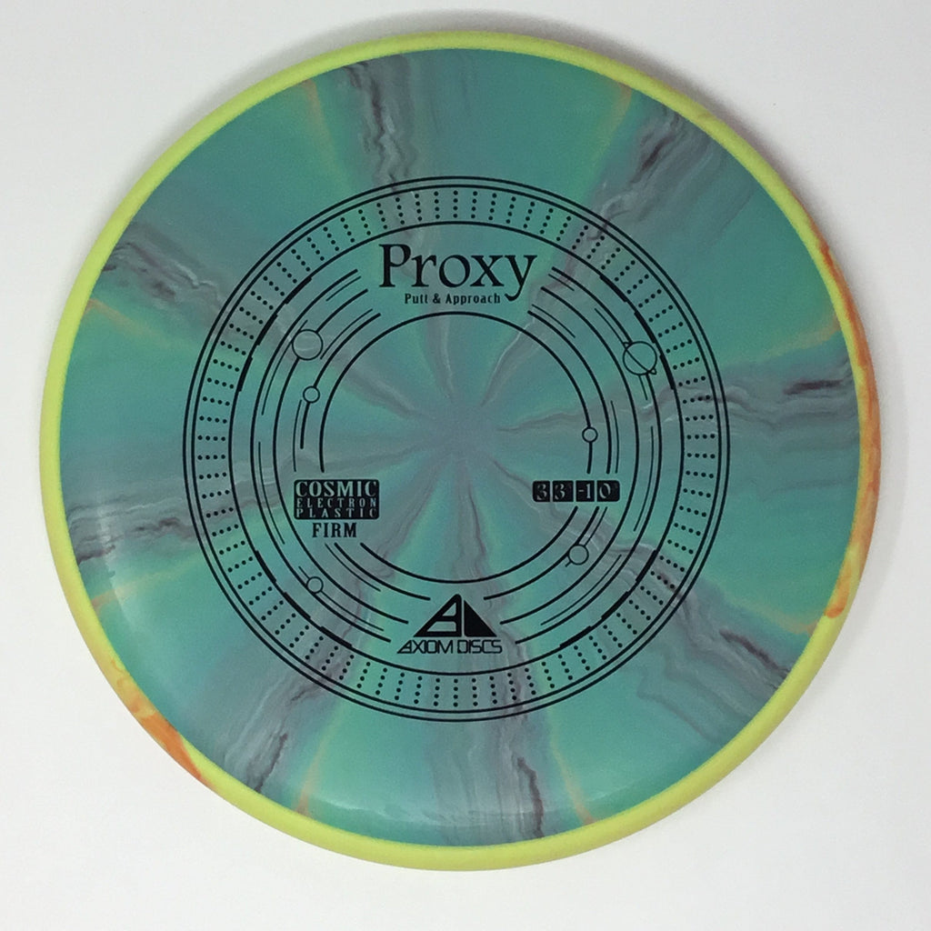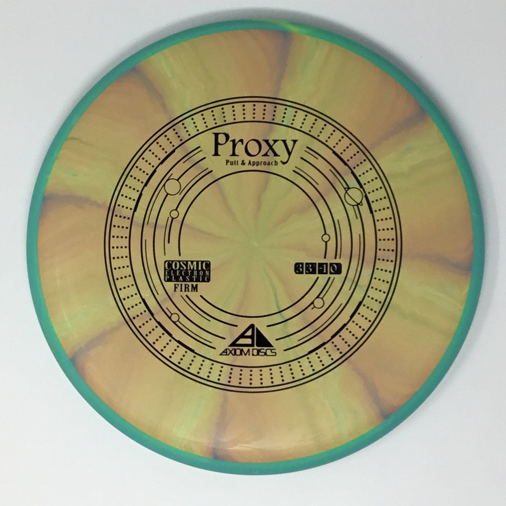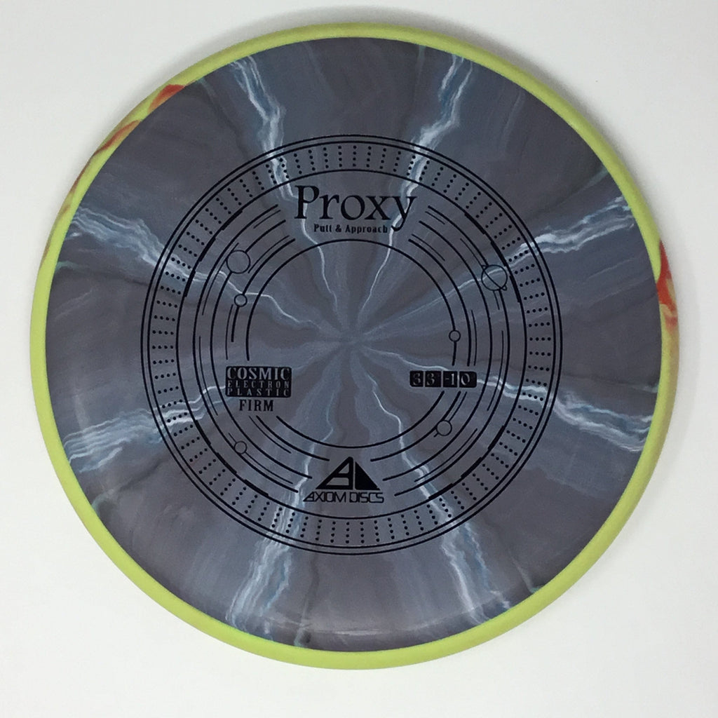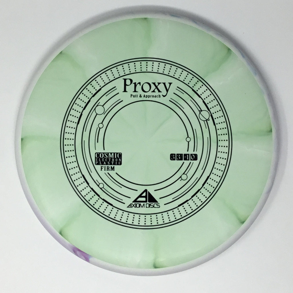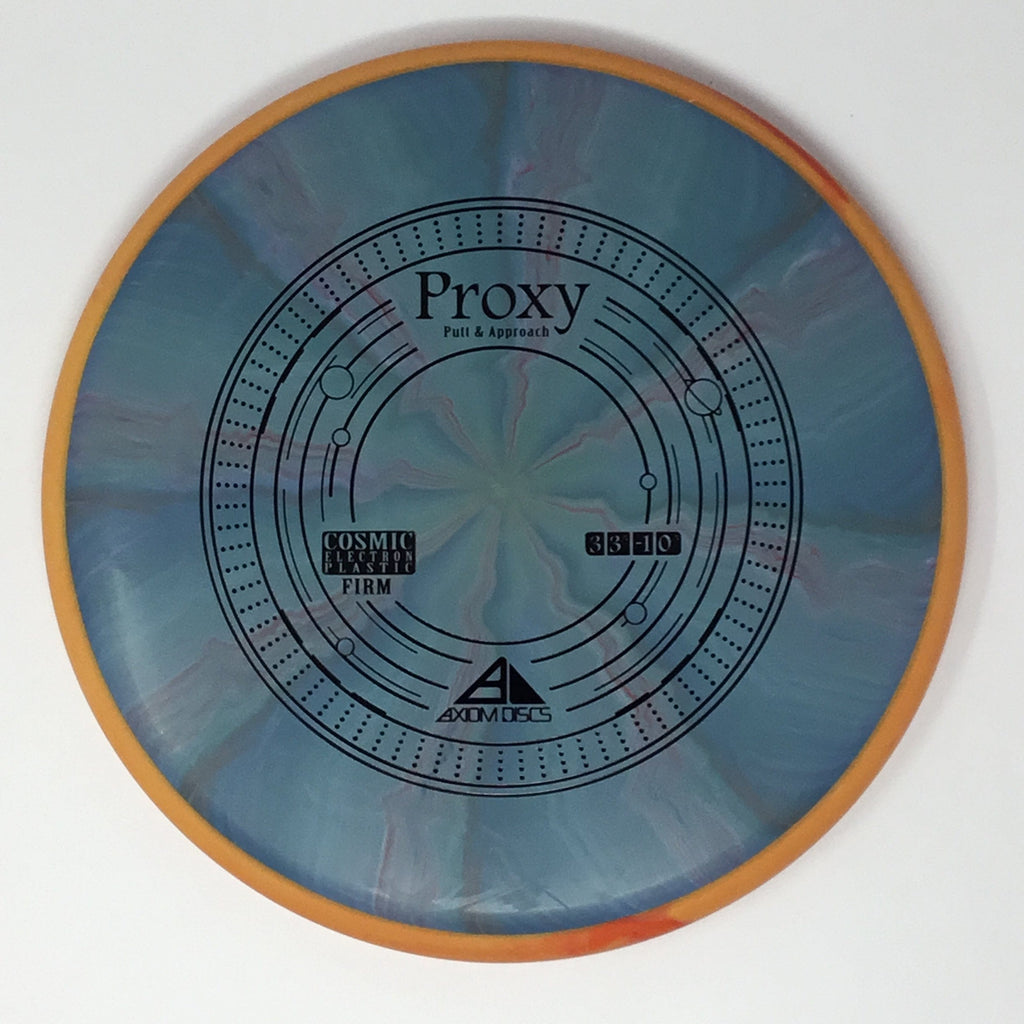 The Proxy is a straight-stable putt and approach disc. The Proxy shares the Envy mold’s core, lending the same low-profile feel and solid grip, along with a short wing width and wide flight plate diameter for superior glide. The Proxy sets itself apart from the Envy with a remarkably straight forward-fading finish. A bit of high-speed turn potential allows the Proxy’s lines to be manipulated over a broad range of power and helps less powerful throwers achieve straight putter drives. The Proxy’s defining flight characteristic is its ability to hold a straight flight at high speeds, but demonstrate the low-speed straight properties of a much more understable model’s ending stage. The Proxy is designed to exhibit the neutral straight-flying characteristic of classic “main” putters. Rather than requiring an extra wind-resistant overstable complement solely for harder throws, the Proxy is able to lock in with a similar high-speed stability as the Envy. Its neutral stability at a wide range of speeds will help the Proxy find its way into every Axiom thrower’s bag.