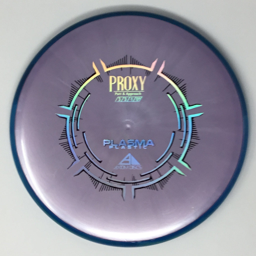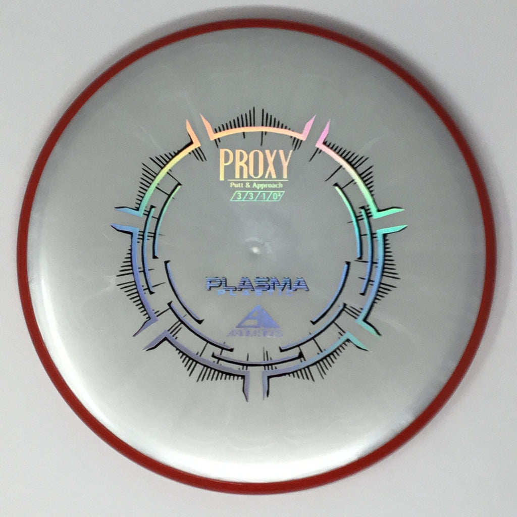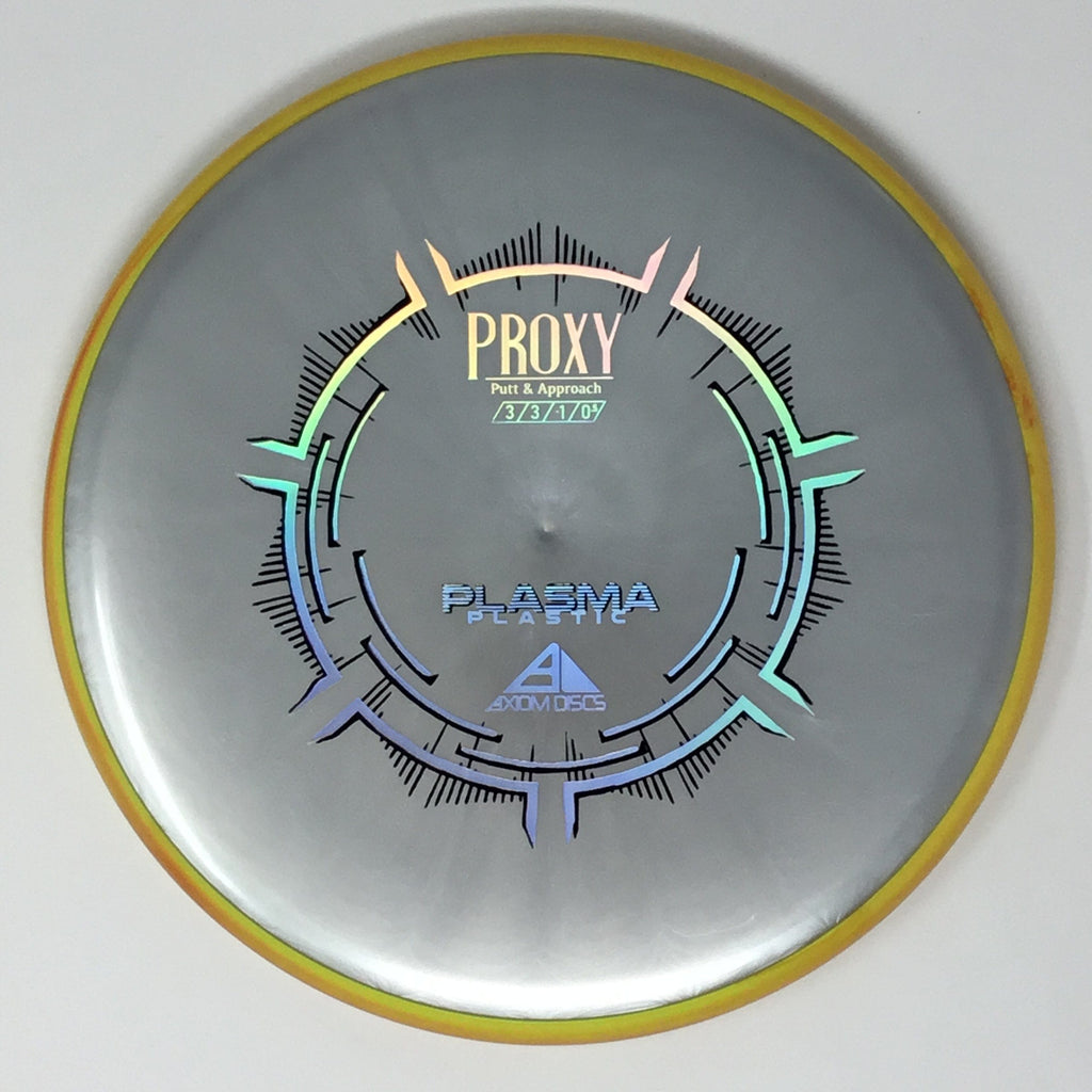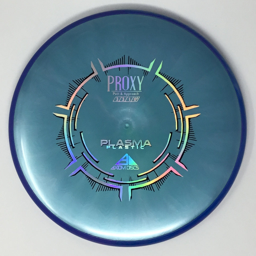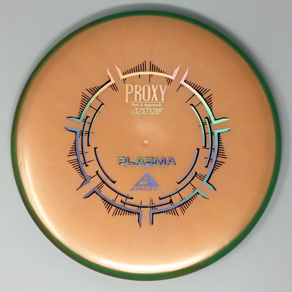 The Proxy is a straight-stable putt and approach disc. The Proxy shares the Envy mold’s core, lending the same low-profile feel and solid grip, along with a short wing width and wide flight plate diameter for superior glide. The Proxy sets itself apart from the Envy with a remarkably straight forward-fading finish. A bit of high-speed turn potential allows the Proxy’s lines to be manipulated over a broad range of power and helps less powerful throwers achieve straight putter drives. The Proxy’s defining flight characteristic is its ability to hold a straight flight at high speeds, but demonstrate the low-speed straight properties of a much more understable model’s ending stage. The Proxy is designed to exhibit the neutral straight-flying characteristic of classic “main” putters. Rather than requiring an extra wind-resistant overstable complement solely for harder throws, the Proxy is able to lock in with a similar high-speed stability as the Envy. Its neutral stability at a wide range of speeds will help the Proxy find its way into every Axiom thrower’s bag.