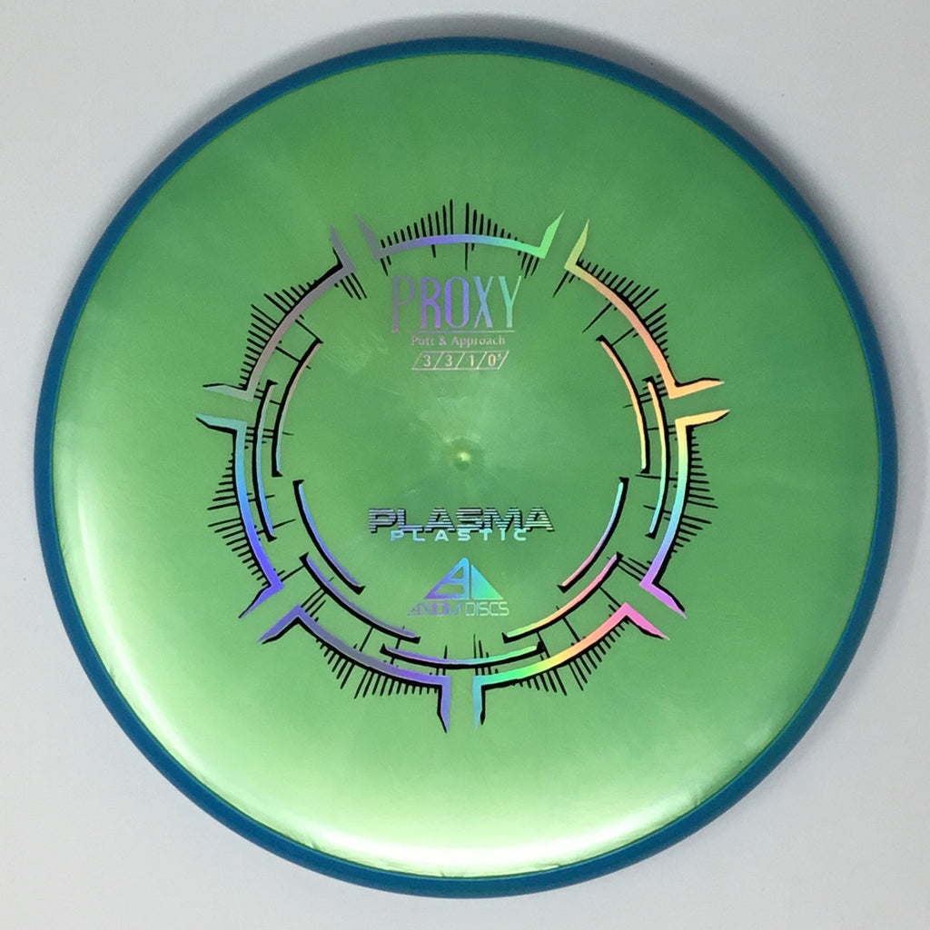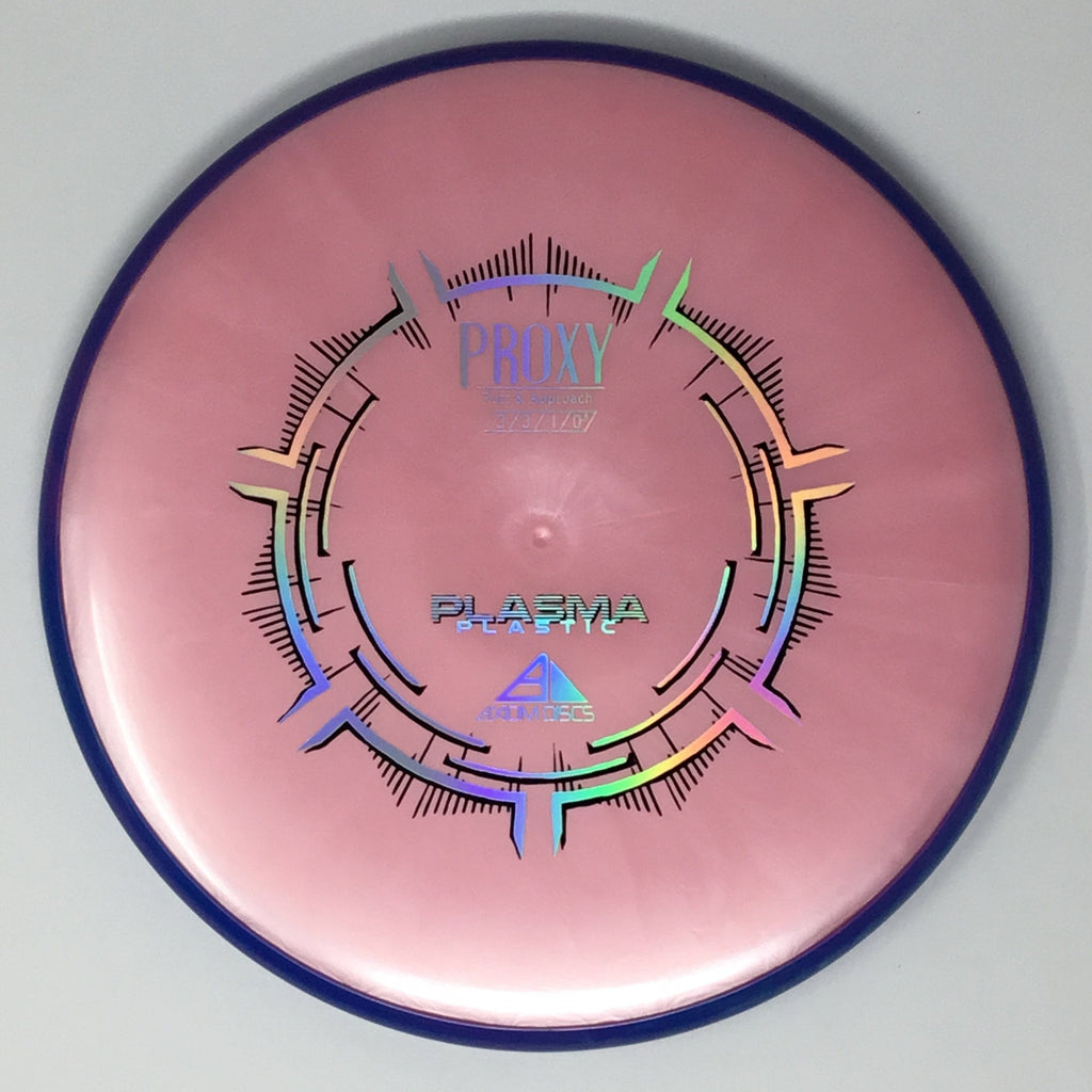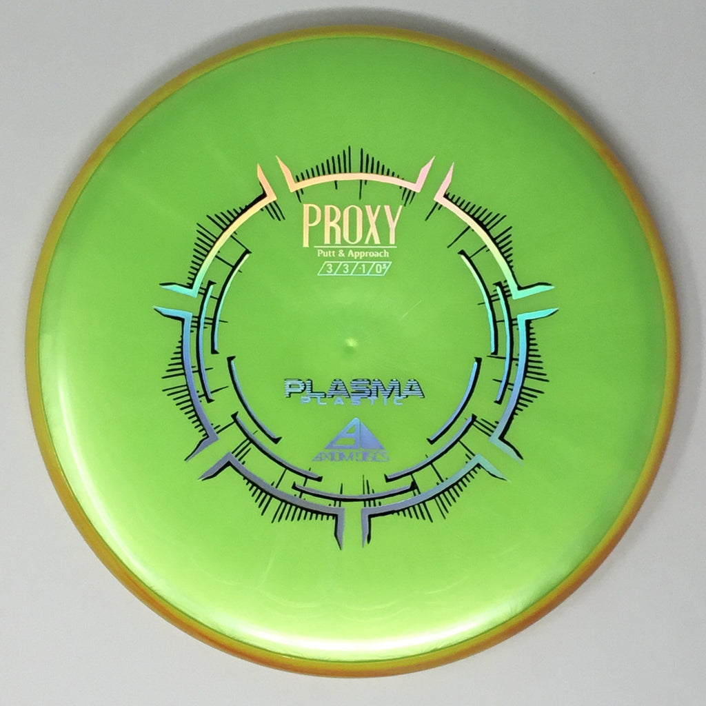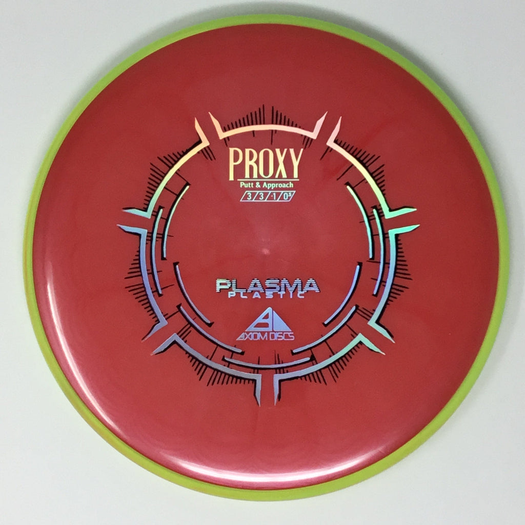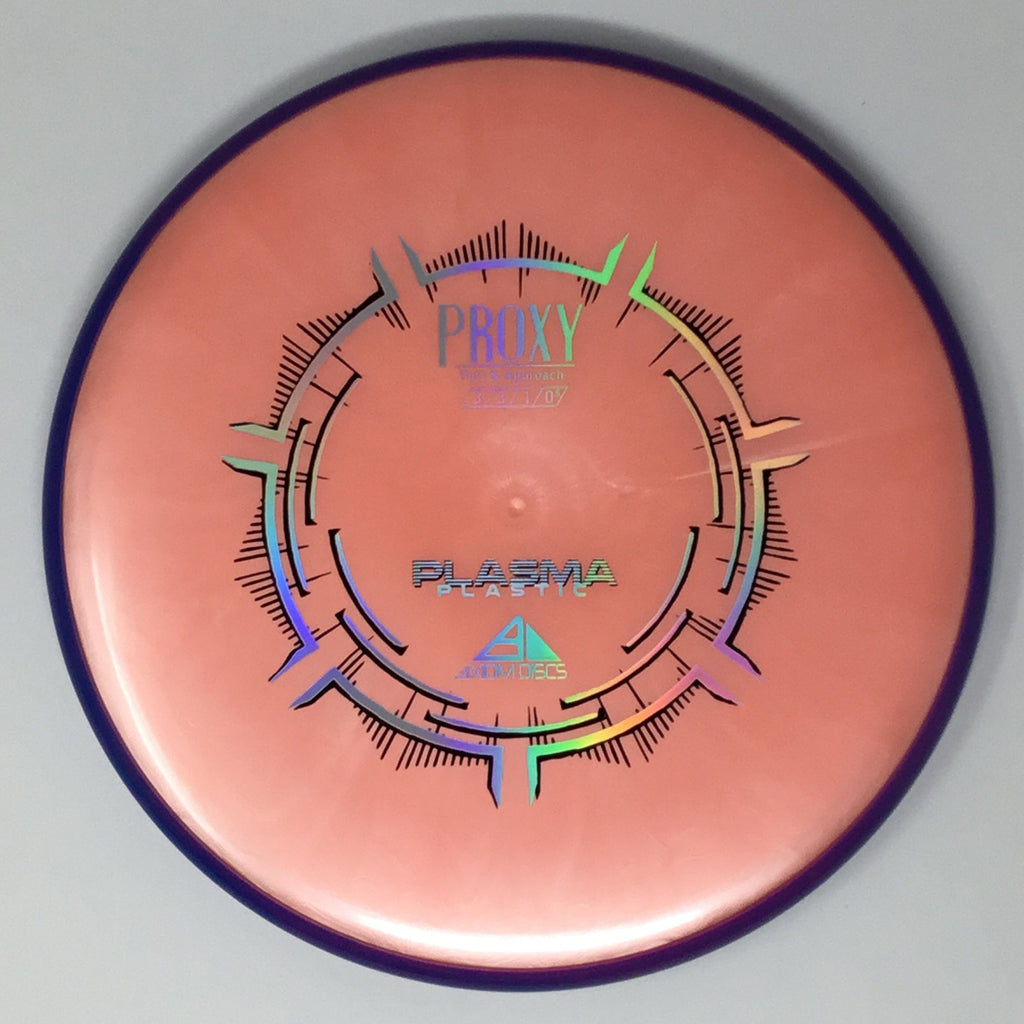 The Proxy is a straight-stable putt and approach disc. The Proxy shares the Envy mold’s core, lending the same low-profile feel and solid grip, along with a short wing width and wide flight plate diameter for superior glide. The Proxy sets itself apart from the Envy with a remarkably straight forward-fading finish. A bit of high-speed turn potential allows the Proxy’s lines to be manipulated over a broad range of power and helps less powerful throwers achieve straight putter drives. The Proxy’s defining flight characteristic is its ability to hold a straight flight at high speeds, but demonstrate the low-speed straight properties of a much more understable model’s ending stage. The Proxy is designed to exhibit the neutral straight-flying characteristic of classic “main” putters. Rather than requiring an extra wind-resistant overstable complement solely for harder throws, the Proxy is able to lock in with a similar high-speed stability as the Envy. Its neutral stability at a wide range of speeds will help the Proxy find its way into every Axiom thrower’s bag.