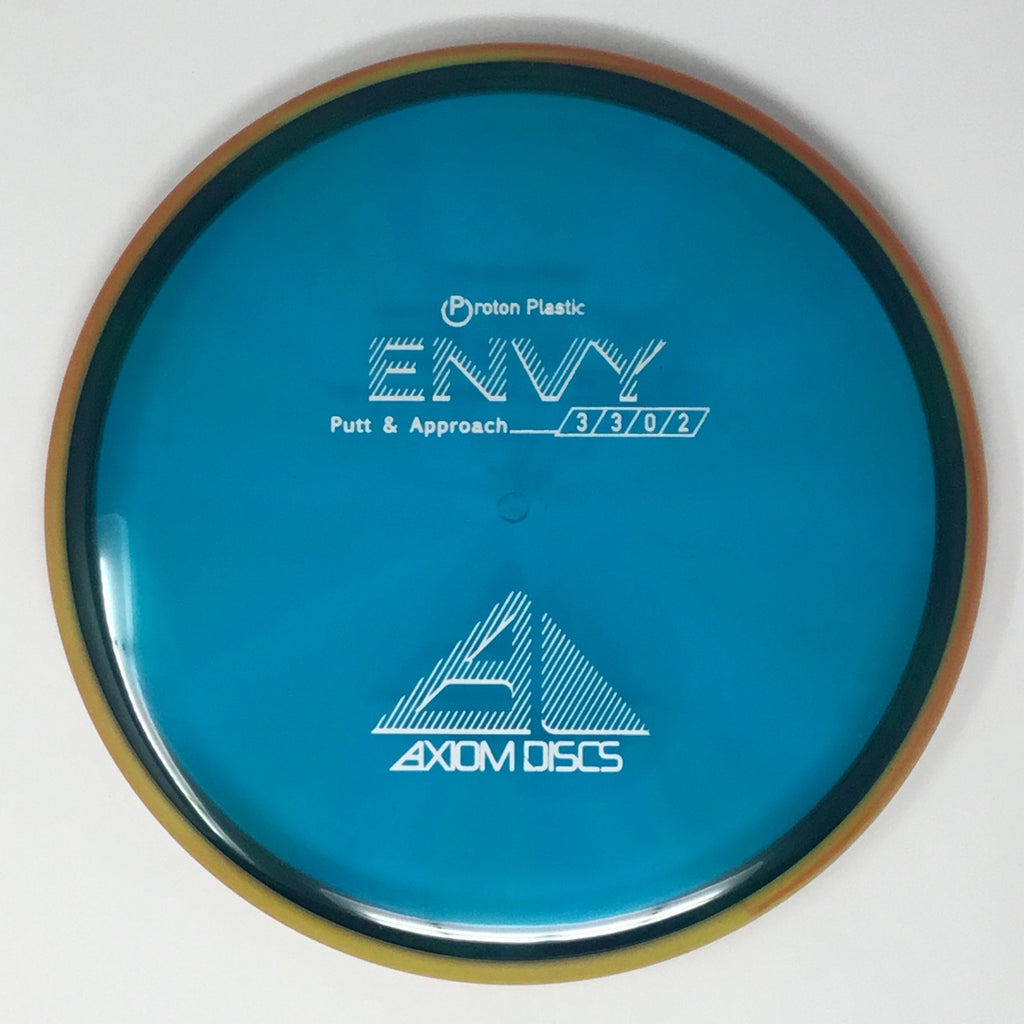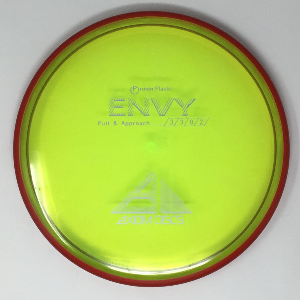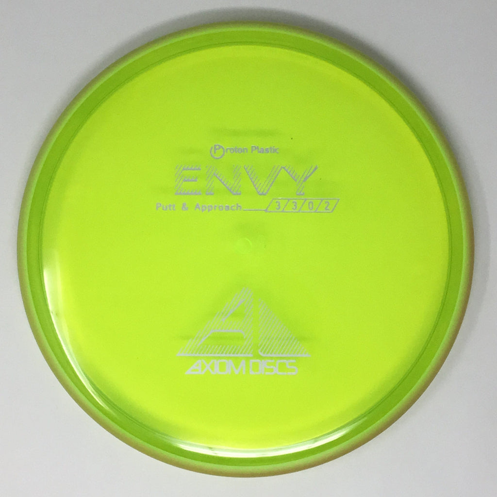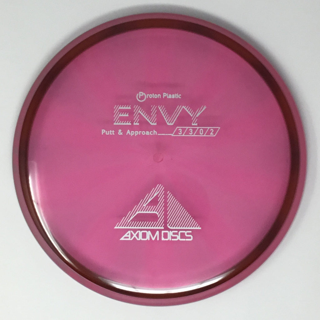 The Envy is a slightly overstable putt and approach disc. The Envy has a smooth modern feel that fits in the hand perfectly, lending confidence for both putt and approach duties. The Envy exhibits reliable high-speed stability and a minimal fade. With a slightly lower profile and cruising speed than the Ion and Anode class, the Envy is a uniquely “lid-like” stable putter. The Envy’s defining flight characteristic is its ability to hold a straight flight for power throwers, but also be a dependably stable approach disc for lower power throwers. Its medium depth offers a healthy balance of straight flight paired with an easy clean release. While its flight stability is largely similar to the MVP Ion, the Envy offers an entirely new feel. Its versatile stability on any type of shot will help the Envy find its way into every Axiom thrower’s bag.