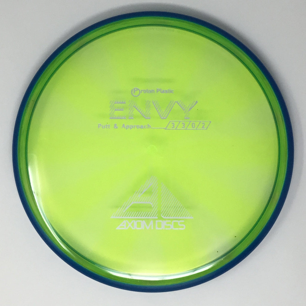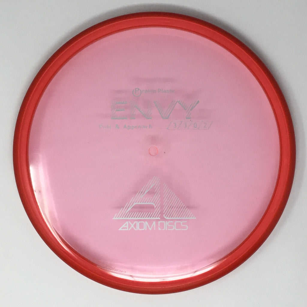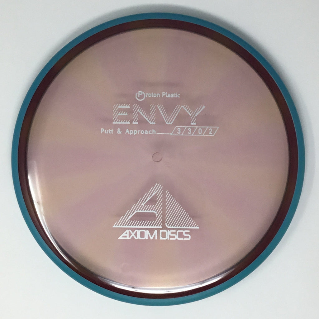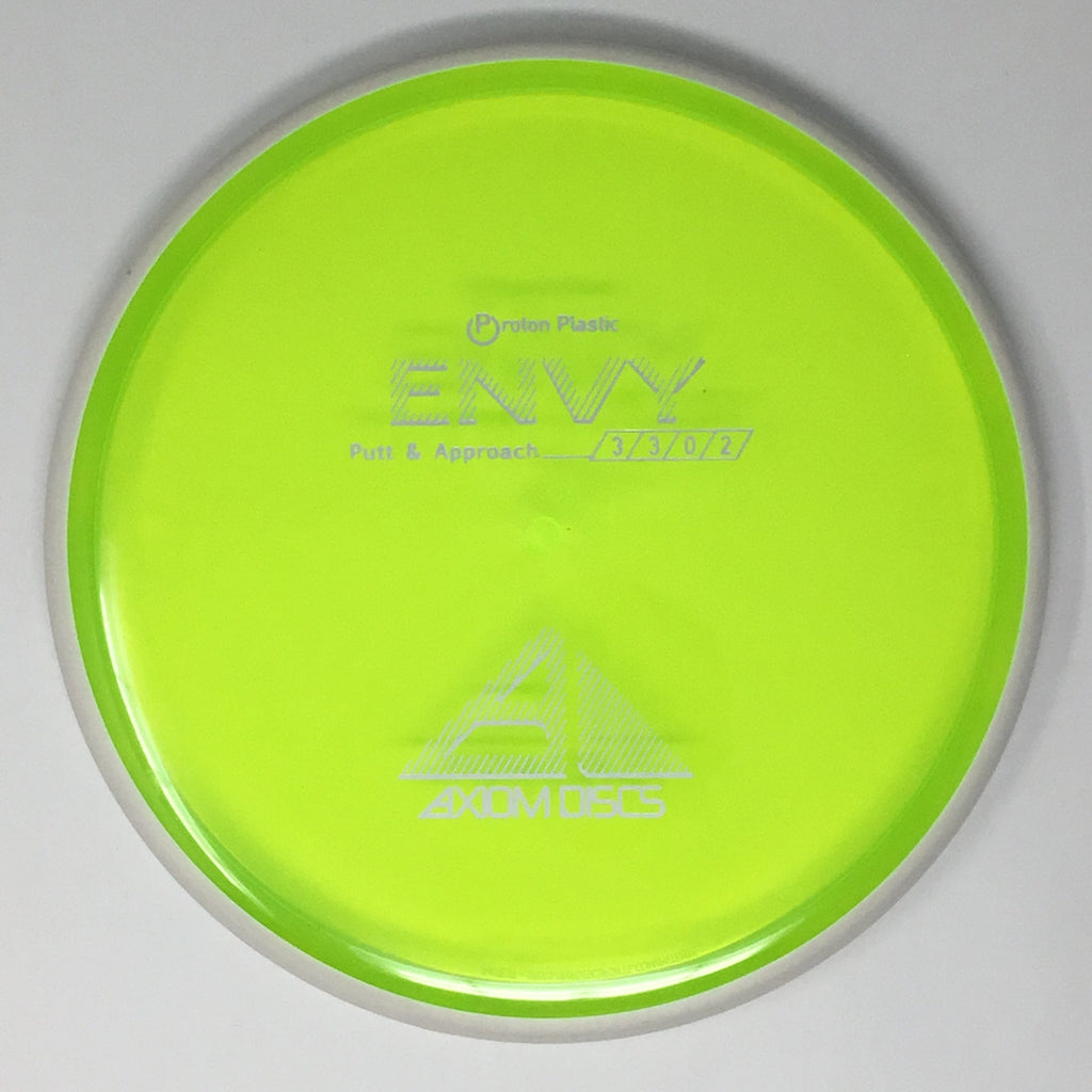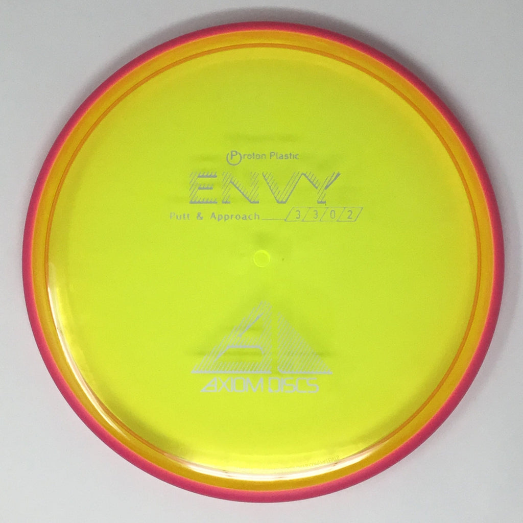 The Envy is a slightly overstable putt and approach disc. The Envy has a smooth modern feel that fits in the hand perfectly, lending confidence for both putt and approach duties. The Envy exhibits reliable high-speed stability and a minimal fade. With a slightly lower profile and cruising speed than the Ion and Anode class, the Envy is a uniquely “lid-like” stable putter. The Envy’s defining flight characteristic is its ability to hold a straight flight for power throwers, but also be a dependably stable approach disc for lower power throwers. Its medium depth offers a healthy balance of straight flight paired with an easy clean release. While its flight stability is largely similar to the MVP Ion, the Envy offers an entirely new feel. Its versatile stability on any type of shot will help the Envy find its way into every Axiom thrower’s bag.