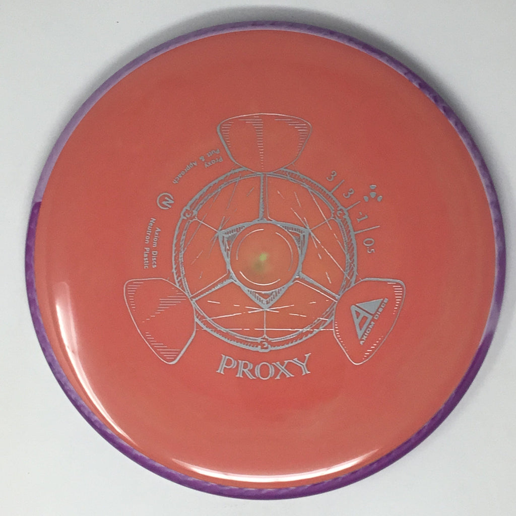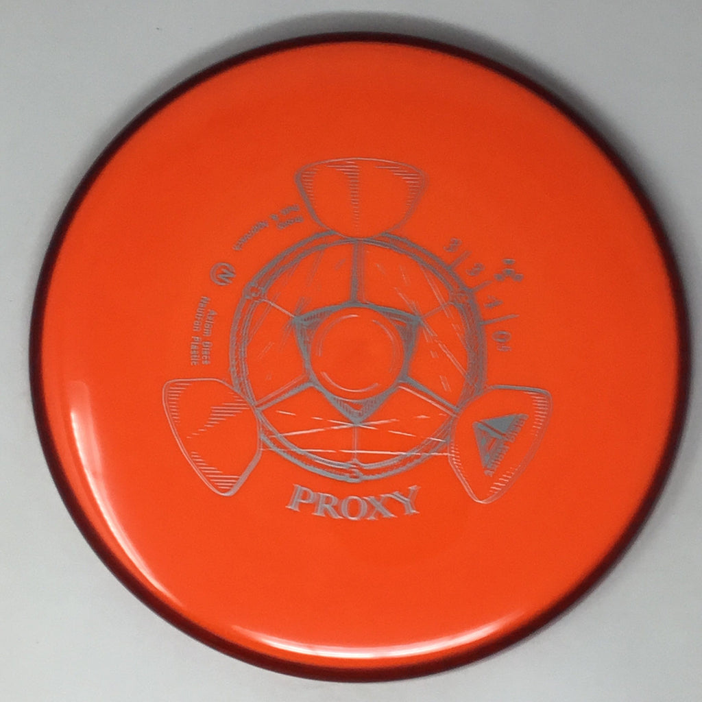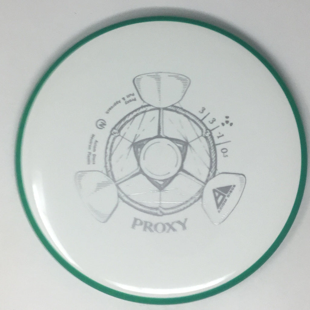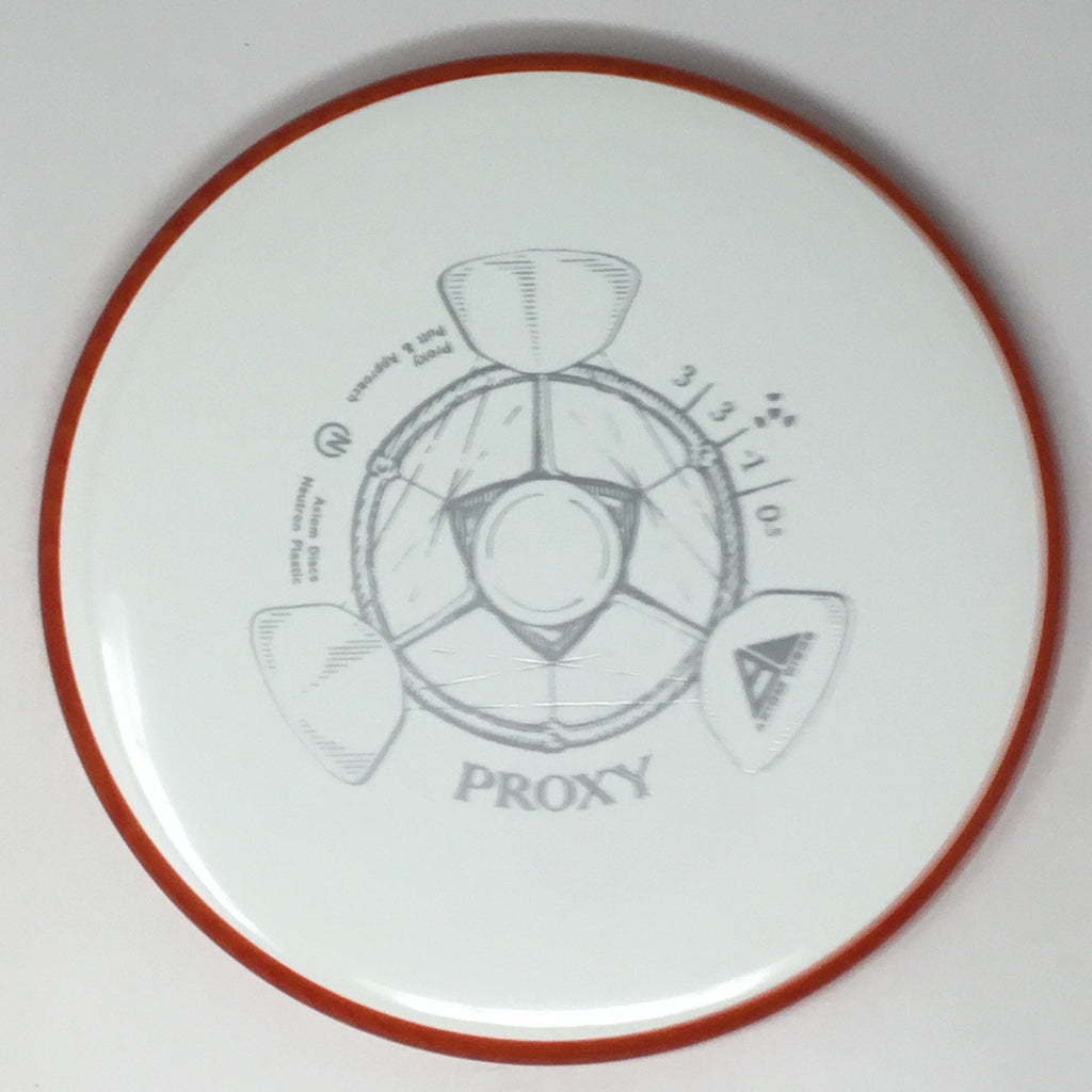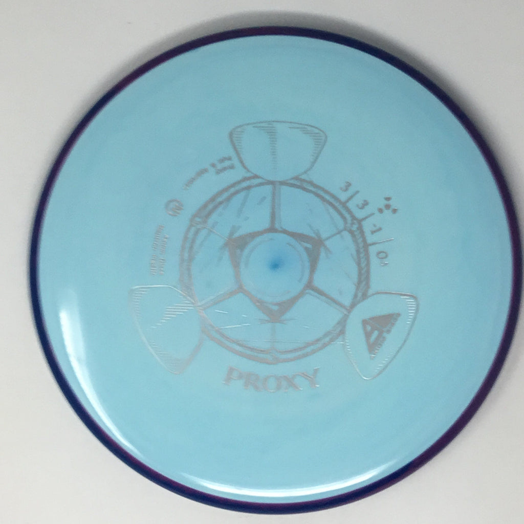 The Proxy is a straight-stable putt and approach disc. The Proxy shares the Envy mold’s core, lending the same low-profile feel and solid grip, along with a short wing width and wide flight plate diameter for superior glide. The Proxy sets itself apart from the Envy with a remarkably straight forward-fading finish. A bit of high-speed turn potential allows the Proxy’s lines to be manipulated over a broad range of power and helps less powerful throwers achieve straight putter drives. The Proxy’s defining flight characteristic is its ability to hold a straight flight at high speeds, but demonstrate the low-speed straight properties of a much more understable model’s ending stage. The Proxy is designed to exhibit the neutral straight-flying characteristic of classic “main” putters. Rather than requiring an extra wind-resistant overstable complement solely for harder throws, the Proxy is able to lock in with a similar high-speed stability as the Envy. Its neutral stability at a wide range of speeds will help the Proxy find its way into every Axiom thrower’s bag.
