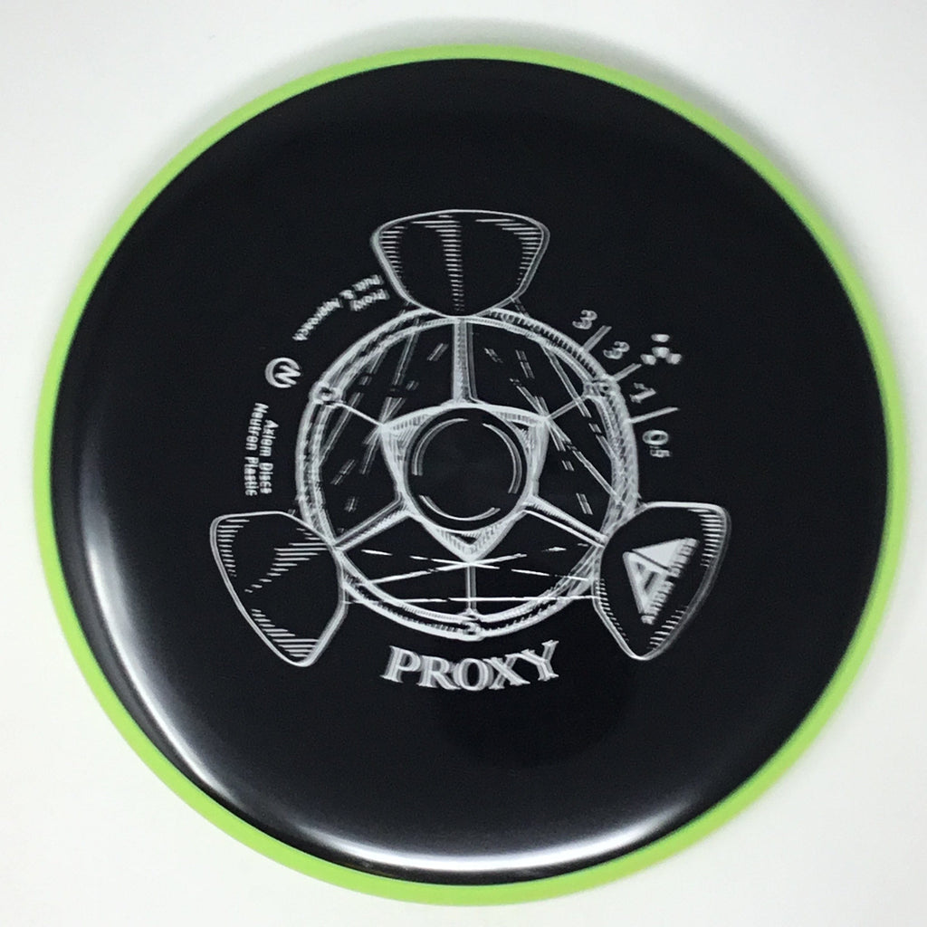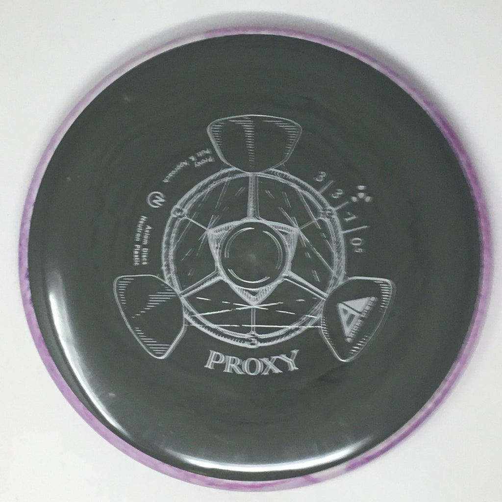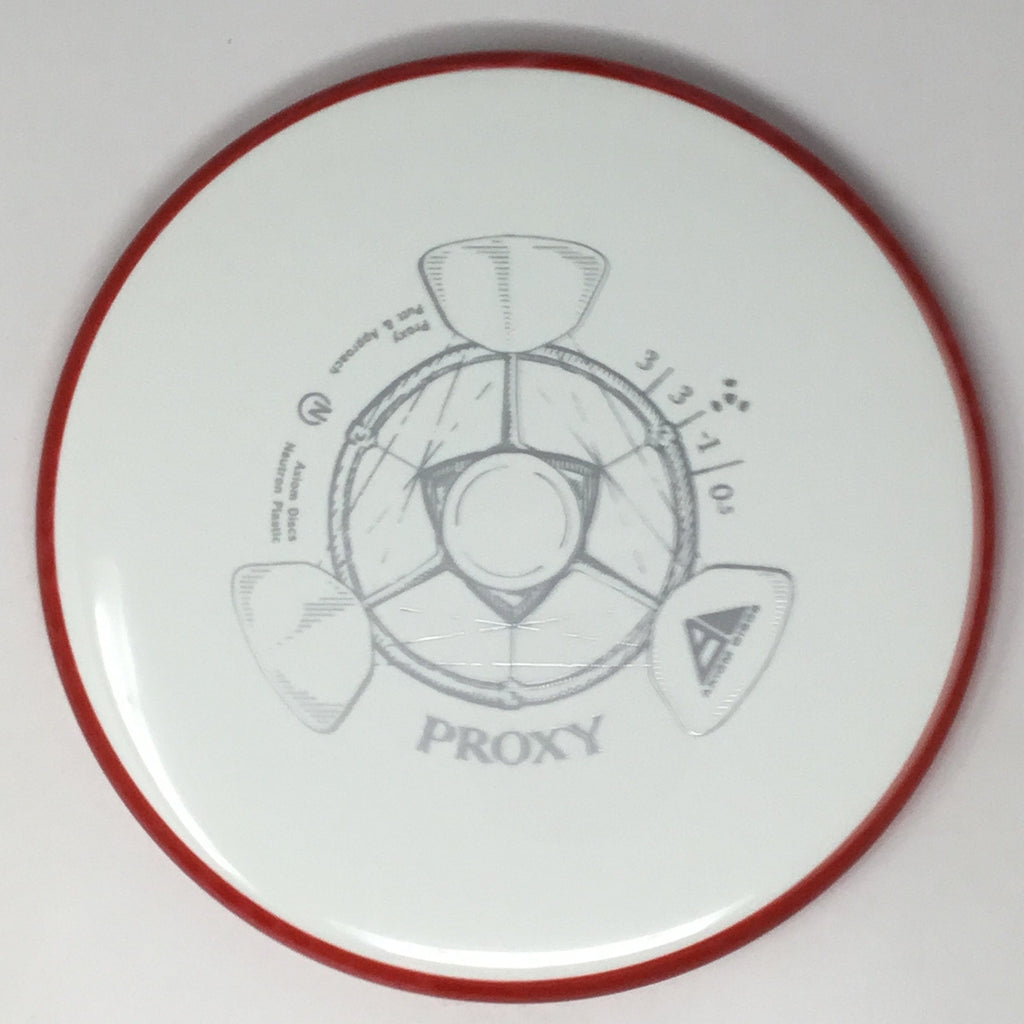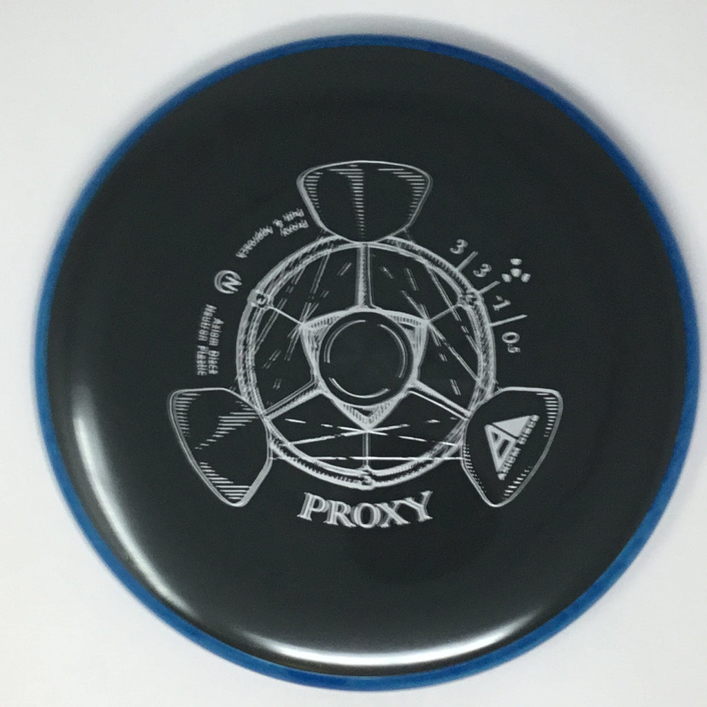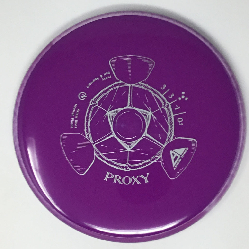 The Proxy is a straight-stable putt and approach disc. The Proxy shares the Envy mold’s core, lending the same low-profile feel and solid grip, along with a short wing width and wide flight plate diameter for superior glide. The Proxy sets itself apart from the Envy with a remarkably straight forward-fading finish. A bit of high-speed turn potential allows the Proxy’s lines to be manipulated over a broad range of power and helps less powerful throwers achieve straight putter drives. The Proxy’s defining flight characteristic is its ability to hold a straight flight at high speeds, but demonstrate the low-speed straight properties of a much more understable model’s ending stage. The Proxy is designed to exhibit the neutral straight-flying characteristic of classic “main” putters. Rather than requiring an extra wind-resistant overstable complement solely for harder throws, the Proxy is able to lock in with a similar high-speed stability as the Envy. Its neutral stability at a wide range of speeds will help the Proxy find its way into every Axiom thrower’s bag.