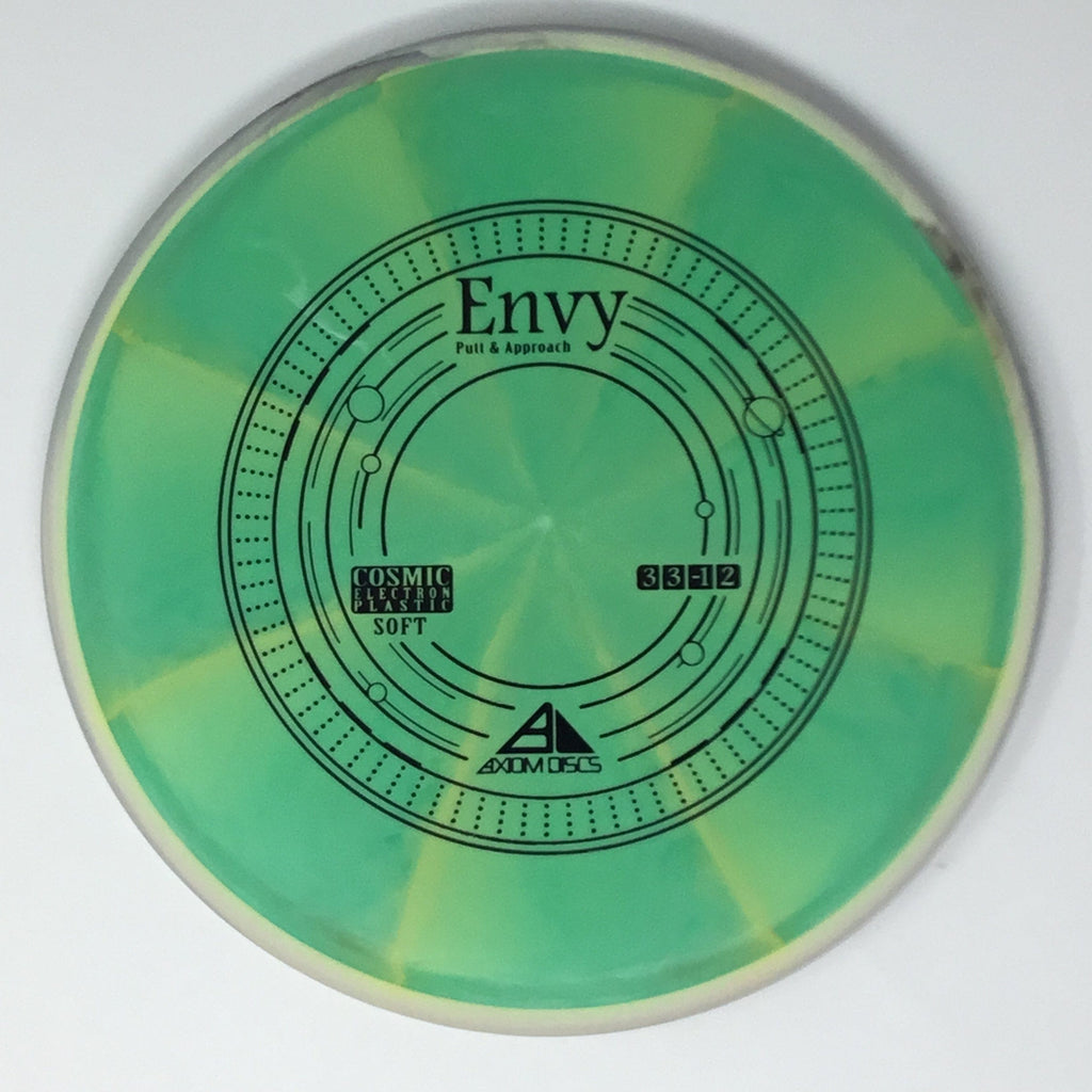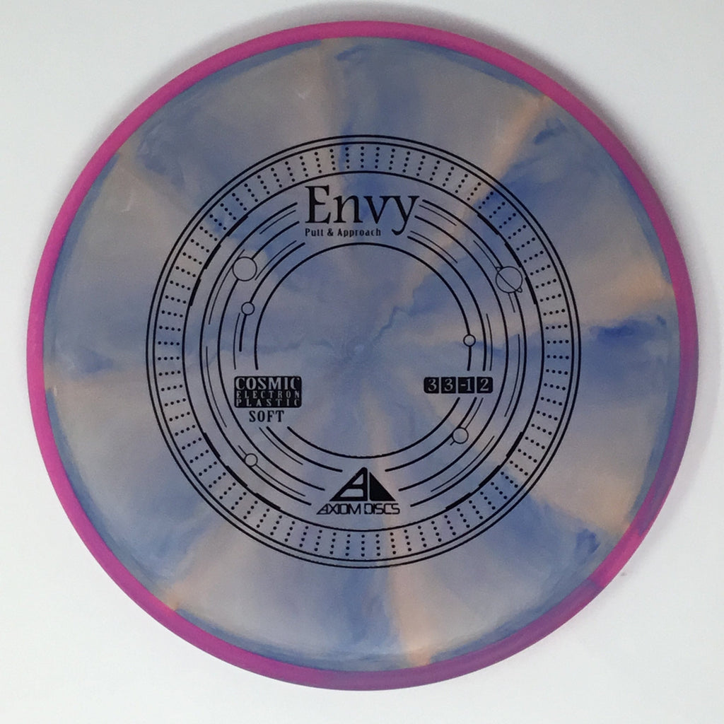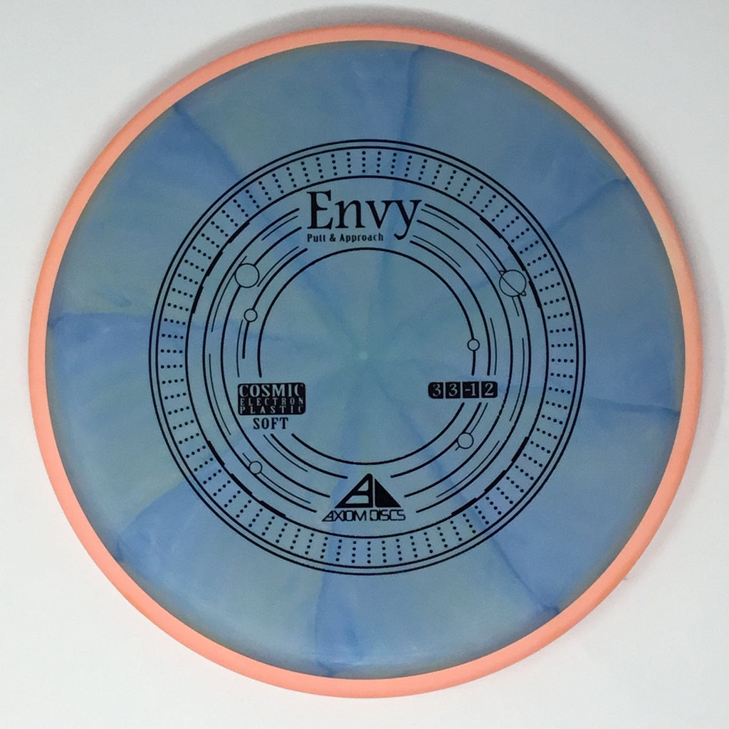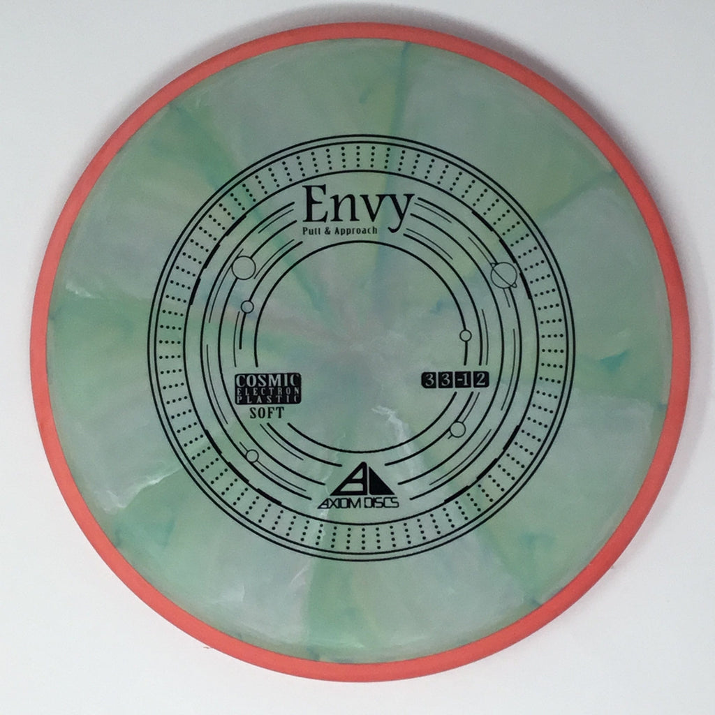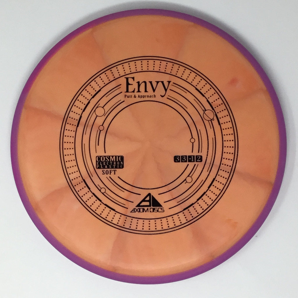 The Envy is a slightly overstable putt and approach disc. The Envy has a smooth modern feel that fits in the hand perfectly, lending confidence for both putt and approach duties. The Envy exhibits reliable high-speed stability and a minimal fade. With a slightly lower profile and cruising speed than the Ion and Anode class, the Envy is a uniquely “lid-like” stable putter. The Envy’s defining flight characteristic is its ability to hold a straight flight for power throwers, but also be a dependably stable approach disc for lower power throwers. Its medium depth offers a healthy balance of straight flight paired with an easy clean release. While its flight stability is largely similar to the MVP Ion, the Envy offers an entirely new feel. Its versatile stability on any type of shot will help the Envy find its way into every Axiom thrower’s bag.