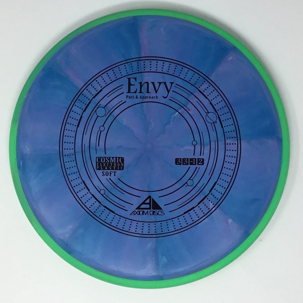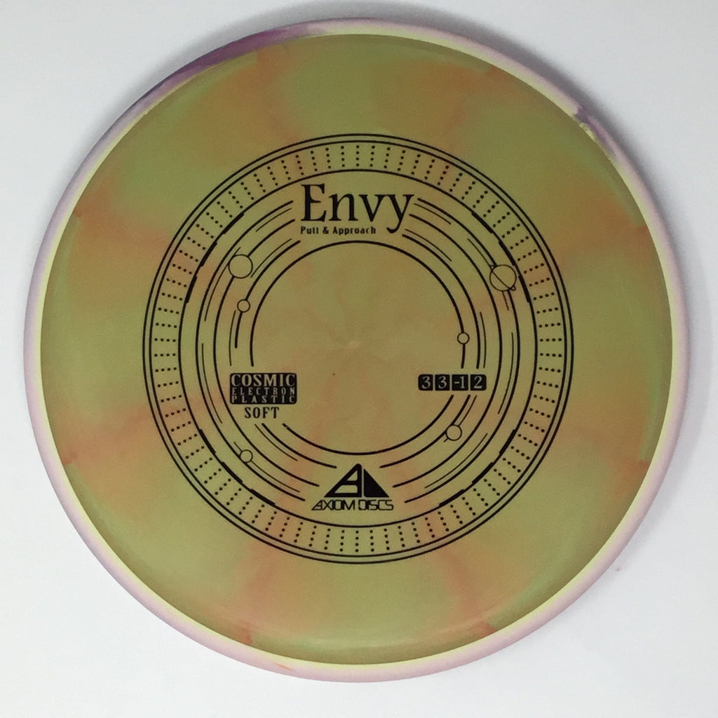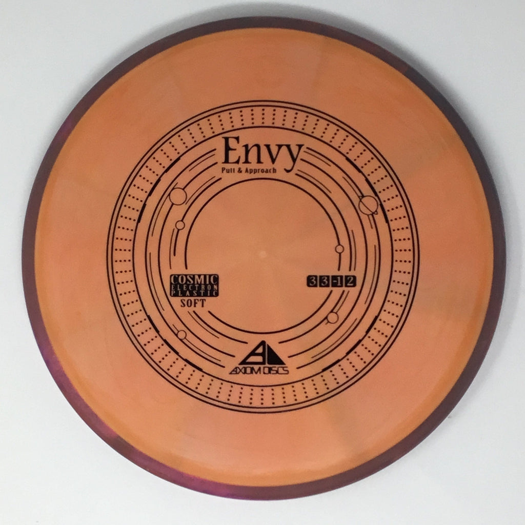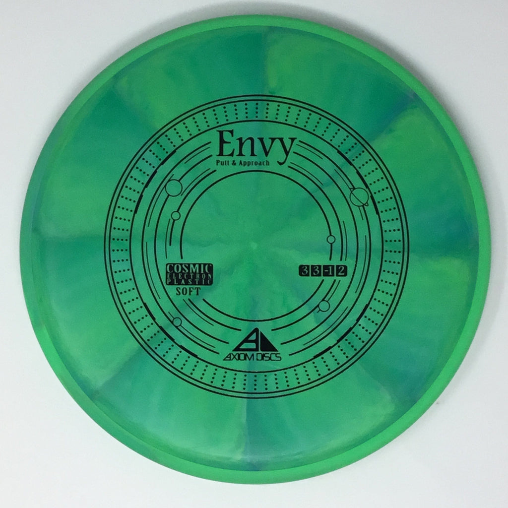 The Envy is a slightly overstable putt and approach disc. The Envy has a smooth modern feel that fits in the hand perfectly, lending confidence for both putt and approach duties. The Envy exhibits reliable high-speed stability and a minimal fade. With a slightly lower profile and cruising speed than the Ion and Anode class, the Envy is a uniquely “lid-like” stable putter. The Envy’s defining flight characteristic is its ability to hold a straight flight for power throwers, but also be a dependably stable approach disc for lower power throwers. Its medium depth offers a healthy balance of straight flight paired with an easy clean release. While its flight stability is largely similar to the MVP Ion, the Envy offers an entirely new feel. Its versatile stability on any type of shot will help the Envy find its way into every Axiom thrower’s bag.