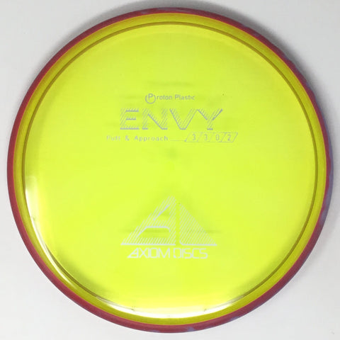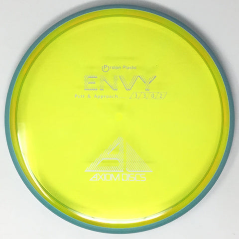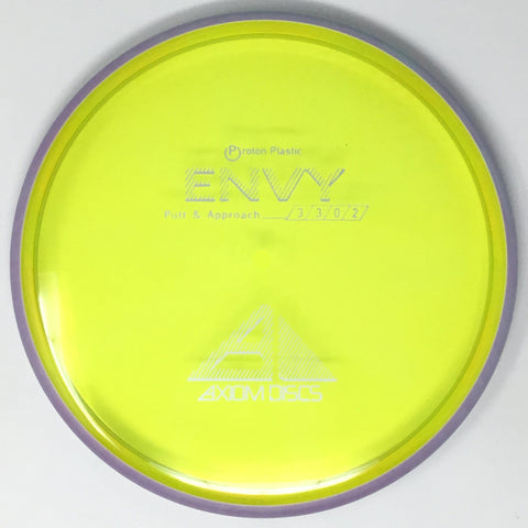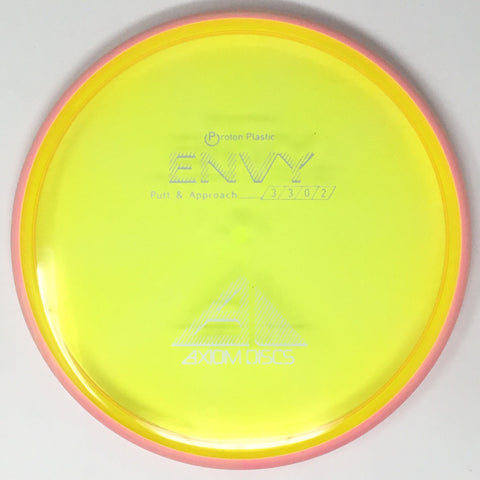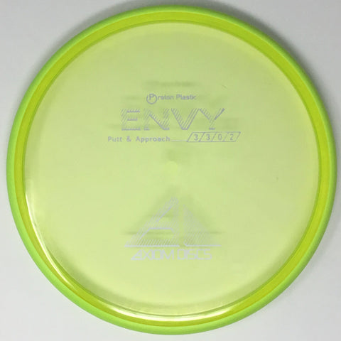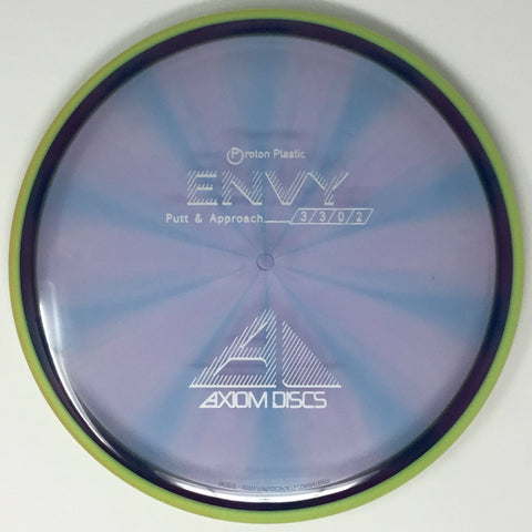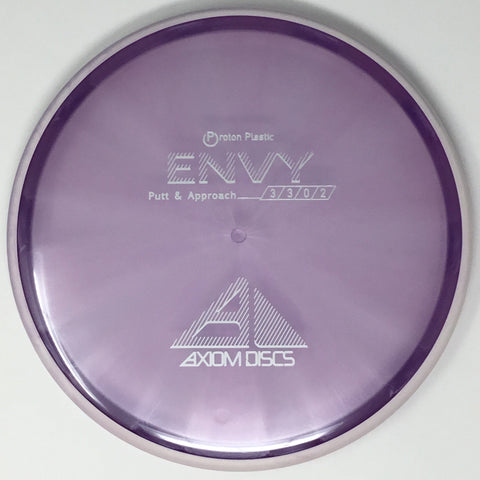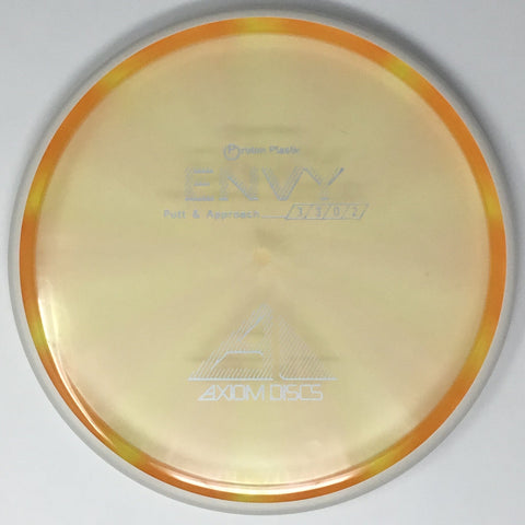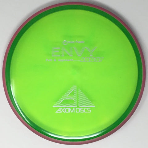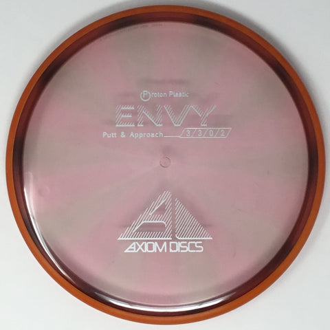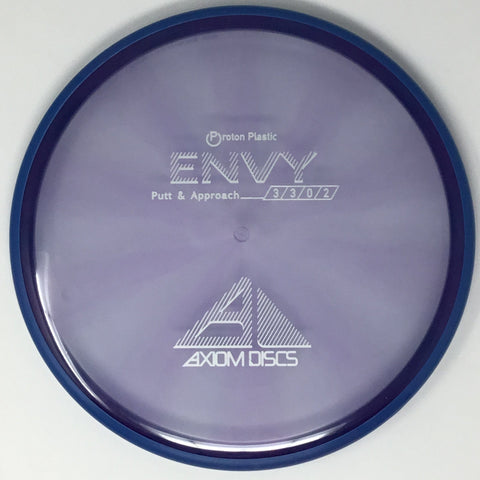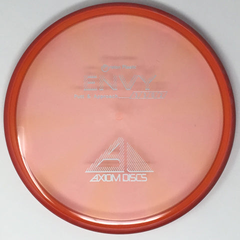 The Envy is a slightly overstable putt and approach disc. The Envy has a smooth modern feel that fits in the hand perfectly, lending confidence for both putt and approach duties. The Envy exhibits reliable high-speed stability and a minimal fade. With a slightly lower profile and cruising speed than the Ion and Anode class, the Envy is a uniquely “lid-like” stable putter. The Envy’s defining flight characteristic is its ability to hold a straight flight for power throwers, but also be a dependably stable approach disc for lower power throwers. Its medium depth offers a healthy balance of straight flight paired with an easy clean release. While its flight stability is largely similar to the MVP Ion, the Envy offers an entirely new feel. Its versatile stability on any type of shot will help the Envy find its way into every Axiom thrower’s bag.