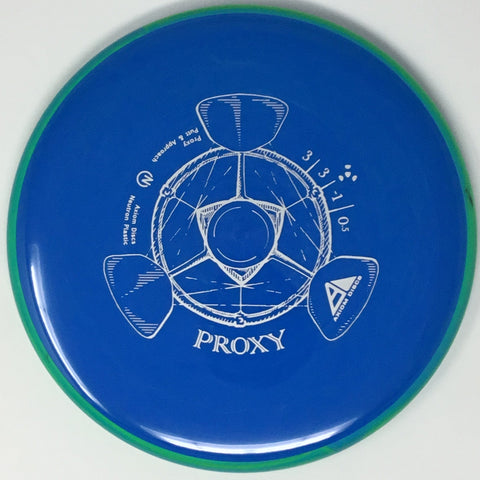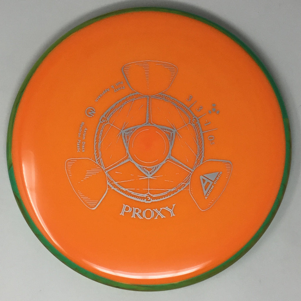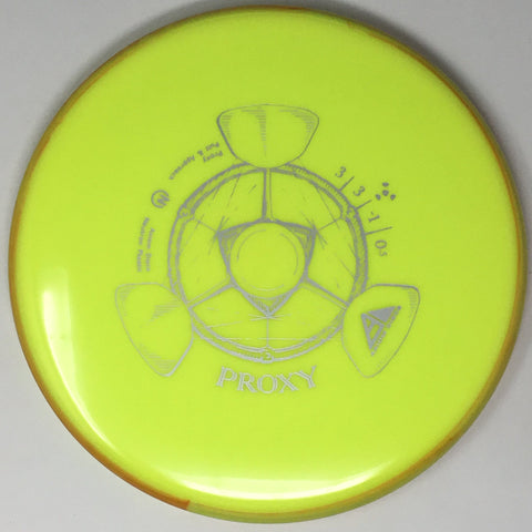 The Proxy is a straight-stable putt and approach disc. The Proxy shares the Envy mold’s core, lending the same low-profile feel and solid grip, along with a short wing width and wide flight plate diameter for superior glide. The Proxy sets itself apart from the Envy with a remarkably straight forward-fading finish. A bit of high-speed turn potential allows the Proxy’s lines to be manipulated over a broad range of power and helps less powerful throwers achieve straight putter drives. The Proxy’s defining flight characteristic is its ability to hold a straight flight at high speeds, but demonstrate the low-speed straight properties of a much more understable model’s ending stage. The Proxy is designed to exhibit the neutral straight-flying characteristic of classic “main” putters. Rather than requiring an extra wind-resistant overstable complement solely for harder throws, the Proxy is able to lock in with a similar high-speed stability as the Envy. Its neutral stability at a wide range of speeds will help the Proxy find its way into every Axiom thrower’s bag.