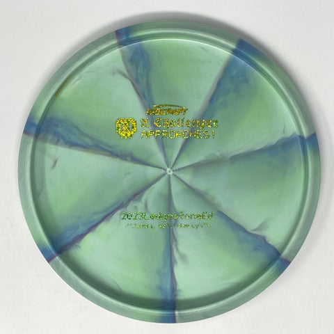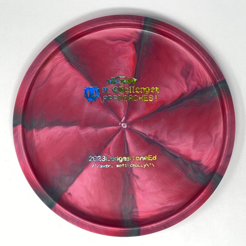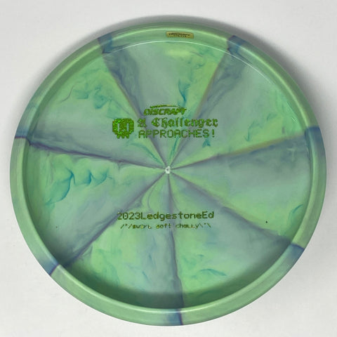 ESP Swirl Soft - 2023 Ledgestone Edition - The Challenger is a beaded, slightly overstable putter with a deep rim. The smooth, rounded rim gives the disc a comfortable feel in the hand while the flat flight plate allows for an easy release. This run of Challenger beats in quickly in the soft plastic. Expect a more neutral flight with this release. The soft plastic also increases grip, making this run easy to throw and release with pinpoint accuracy. The deep, pastel-colored swirls in this run are beautiful and are kept extra clean with a blank flight plate. The bottom stamp features an old-school, Atari-style font with a nod to the next level Challenger approaching.