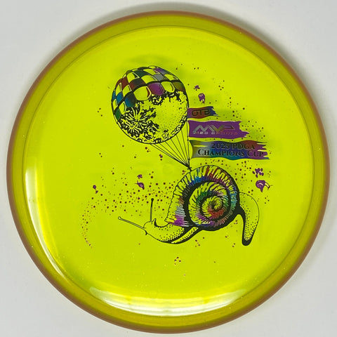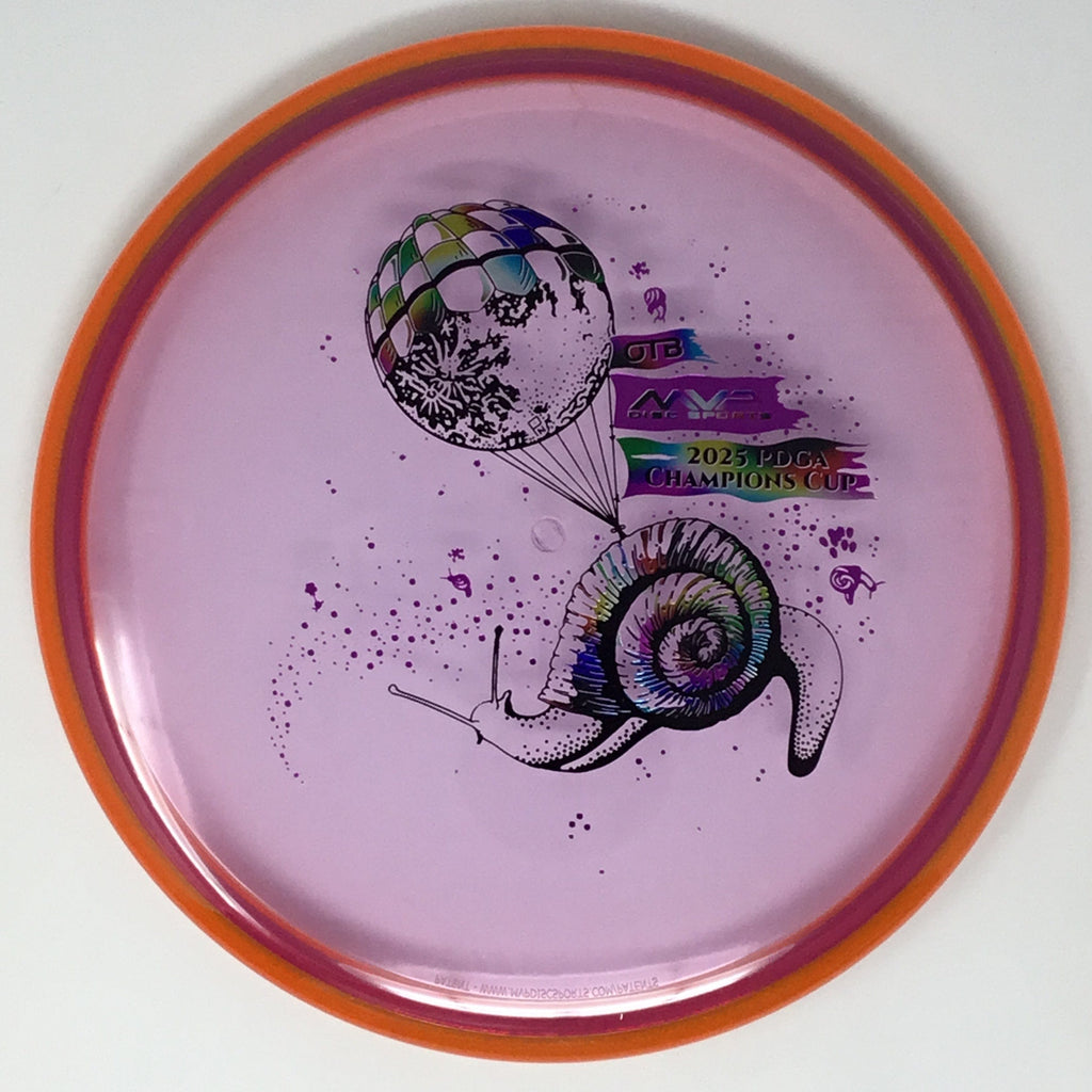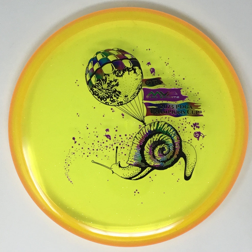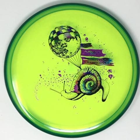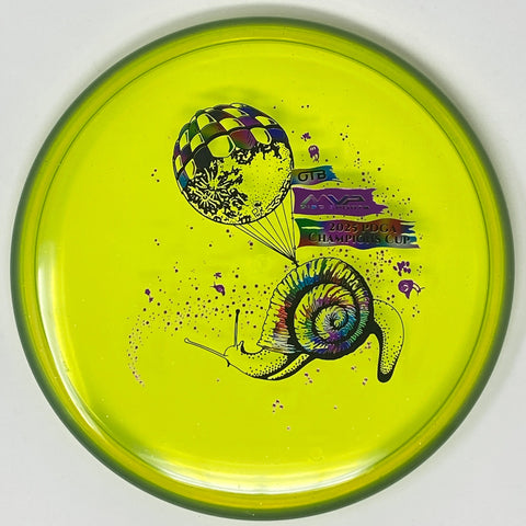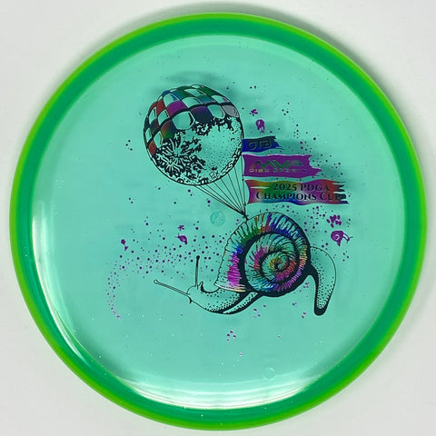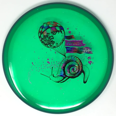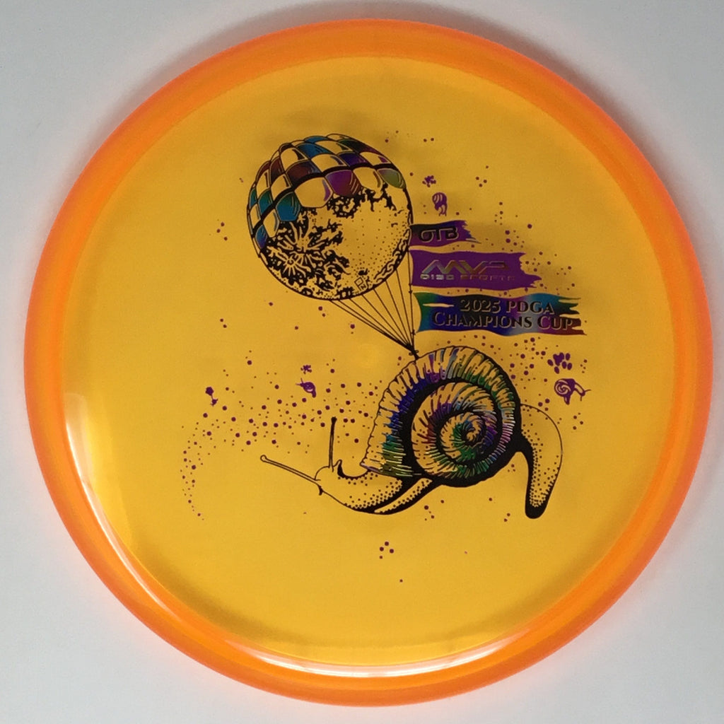 2025 Champions Cup Edition: It took a while, but snails always catch up eventually. Returning this year – along with many of his friends – is “Snail Mail” by Pirate Nate, on the Prism Proton Soft Envy! One of the most popular throwing putters in the MVP family of discs, the dependable straight to overstable flight of the Envy will get your shot right where you want it – chains.