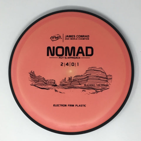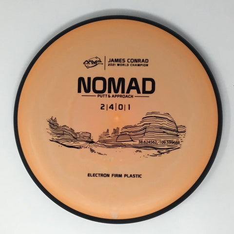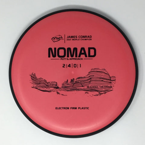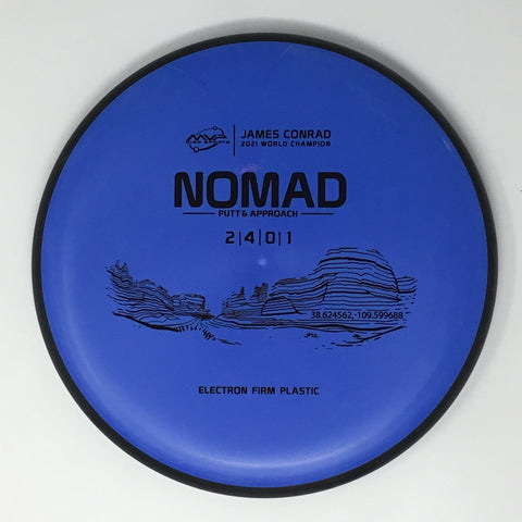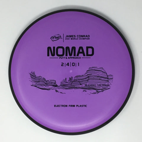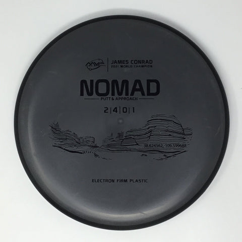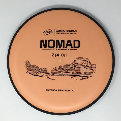 Designed by the World Champion himself - the Nomad has everything James Conrad desires in a putter. From the depth and shoulder height, all the way down to the size of the small bead - the Electron Nomad is James’ vision of an ideal putter. Expect a neutral flight inside the circle, with some fade kicking in at circle two - making the Nomad great at holding anhyzer or hyzer angles when need be. The Nomad is exactly how James wants a putter to feel in his hand, and exactly how he wants them to fly. Comfortable, with a clean and consistent release, the Nomad is ready for your disc golf journey - how far will you take it?