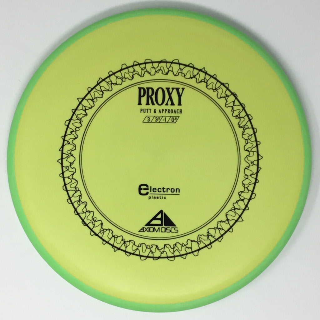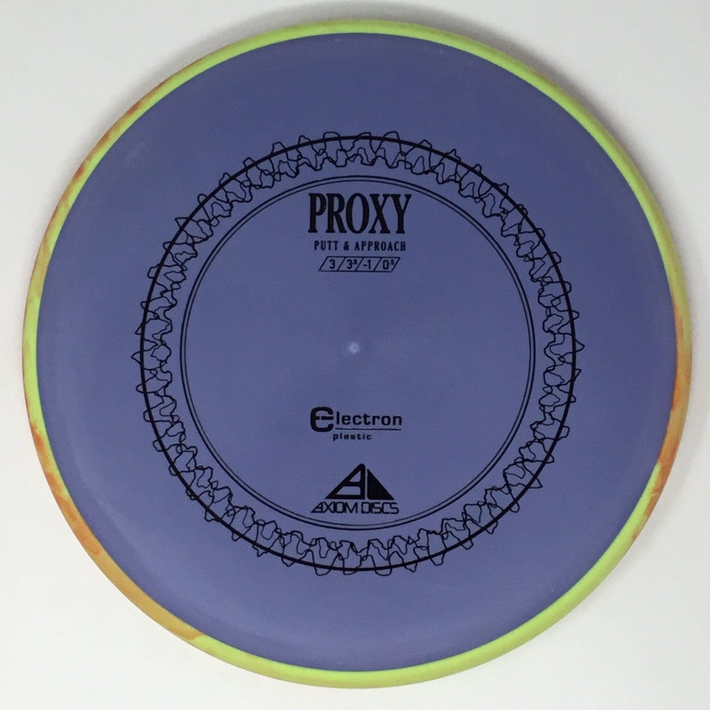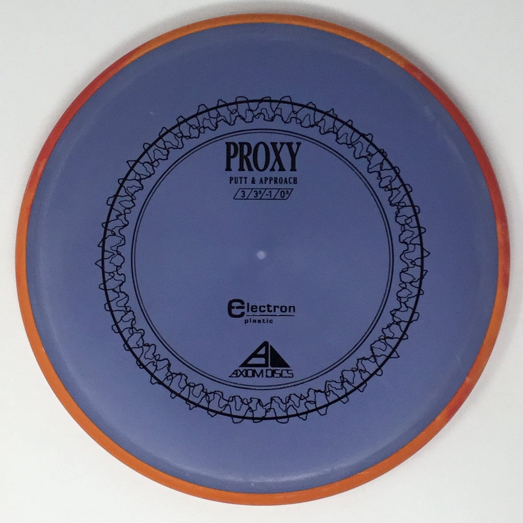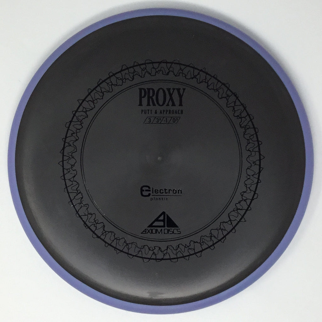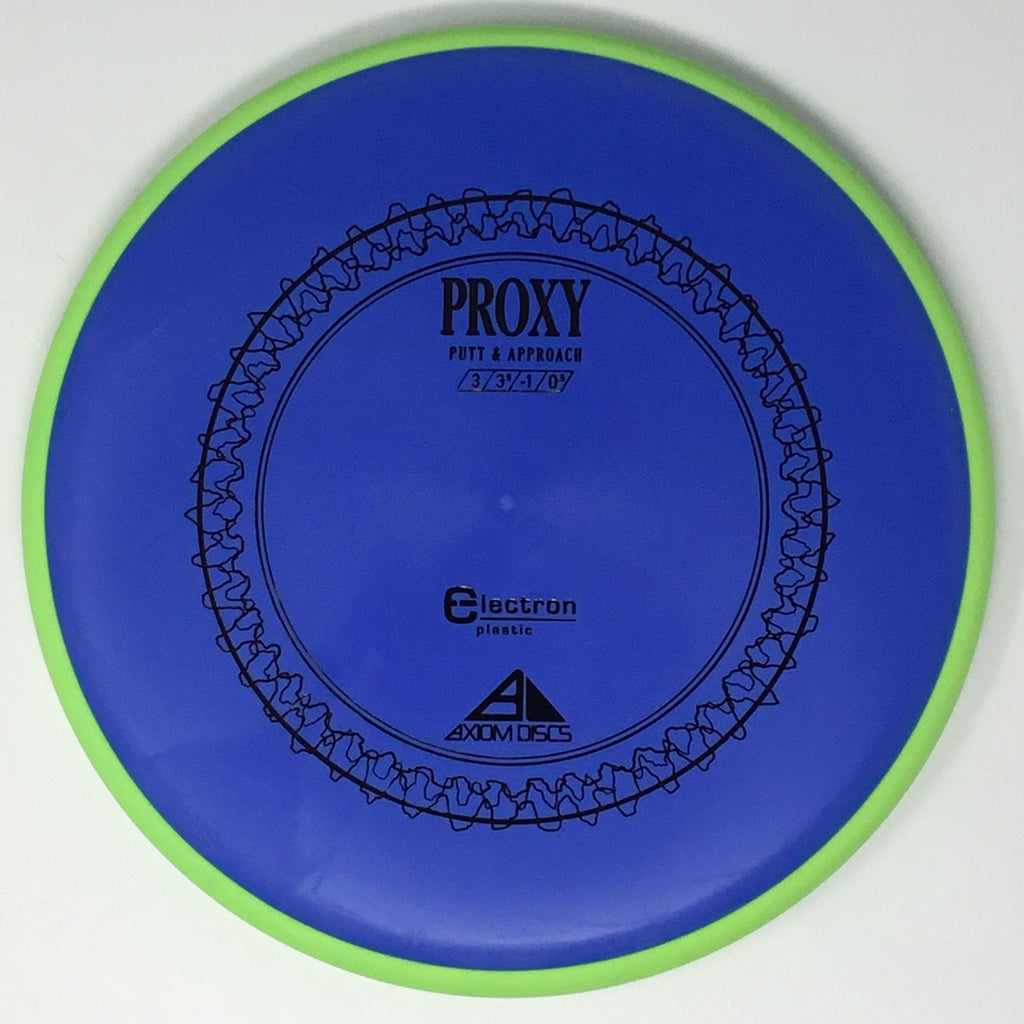 The Proxy is a straight-stable putt and approach disc. The Proxy shares the Envy mold’s core, lending the same low-profile feel and solid grip, along with a short wing width and wide flight plate diameter for superior glide. The Proxy sets itself apart from the Envy with a remarkably straight forward-fading finish. A bit of high-speed turn potential allows the Proxy’s lines to be manipulated over a broad range of power and helps less powerful throwers achieve straight putter drives. The Proxy’s defining flight characteristic is its ability to hold a straight flight at high speeds, but demonstrate the low-speed straight properties of a much more understable model’s ending stage. The Proxy is designed to exhibit the neutral straight-flying characteristic of classic “main” putters. Rather than requiring an extra wind-resistant overstable complement solely for harder throws, the Proxy is able to lock in with a similar high-speed stability as the Envy. Its neutral stability at a wide range of speeds will help the Proxy find its way into every Axiom thrower’s bag.