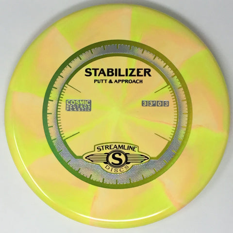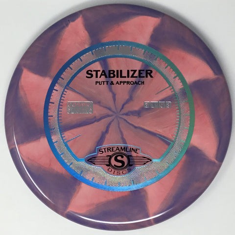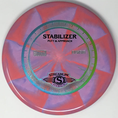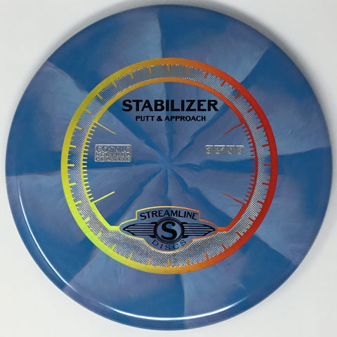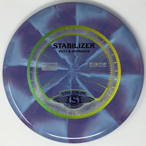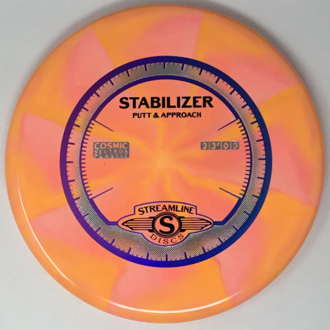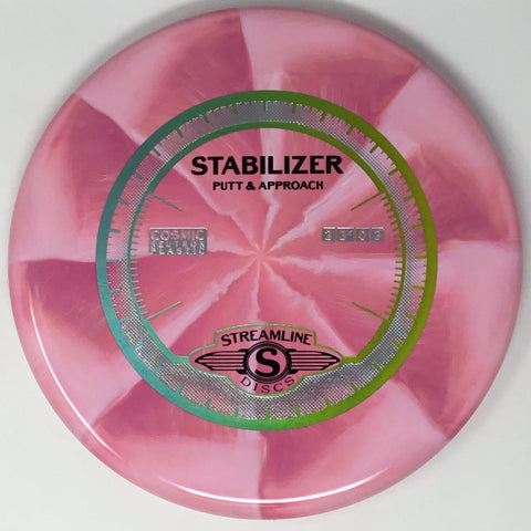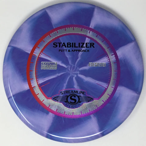 The Stabilizer is a new overstable putter from Streamline Discs, making its debut in Streamline Neutron and Cosmic Neutron plastic. This is the second putter from Streamline Discs and is the overstable compliment to the Streamline Pilot. The Stabilizer has a similar hand feel and depth as the Neutron Pilot, but with a slightly raised shoulder and more pointed nose that produces a flatter and more stable putter. The Stabilizers defining flight characteristic is straight flights with minimal turn, into a strong finishing fade for point and shoot accuracy on the approach.