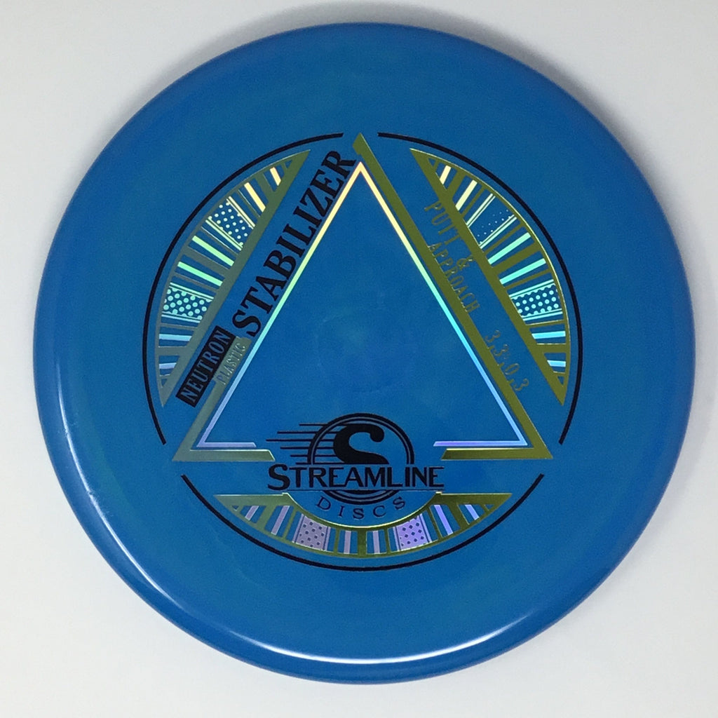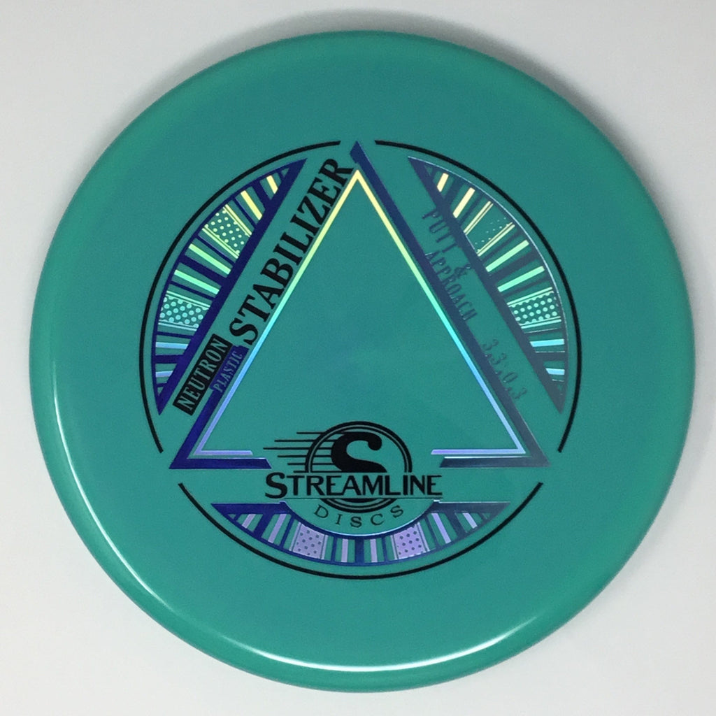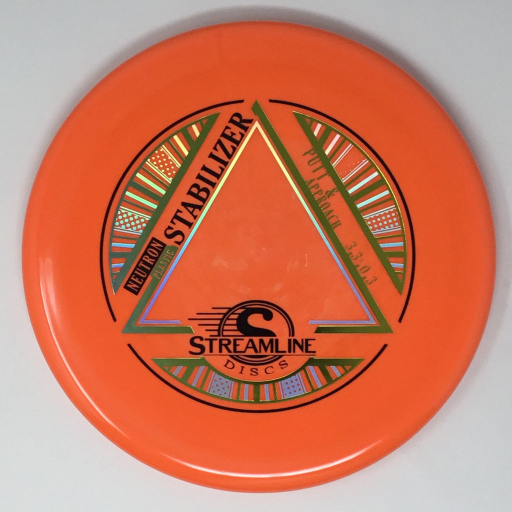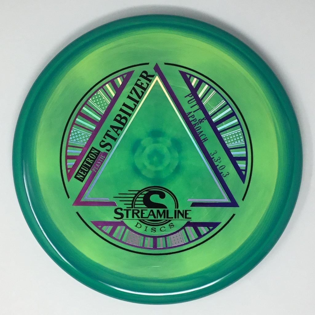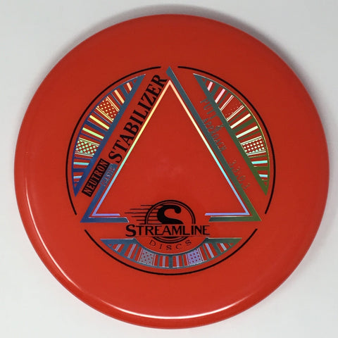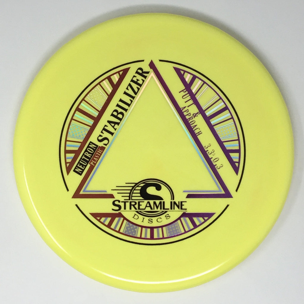 The Stabilizer is a new overstable putter from Streamline Discs, making its debut in Streamline Neutron and Cosmic Neutron plastic. This is the second putter from Streamline Discs and is the overstable compliment to the Streamline Pilot. The Stabilizer has a similar hand feel and depth as the Neutron Pilot, but with a slightly raised shoulder and more pointed nose that produces a flatter and more stable putter. The Stabilizers defining flight characteristic is straight flights with minimal turn, into a strong finishing fade for point and shoot accuracy on the approach.