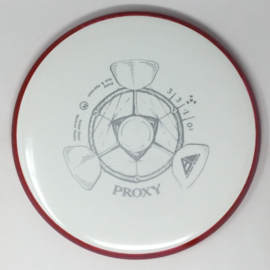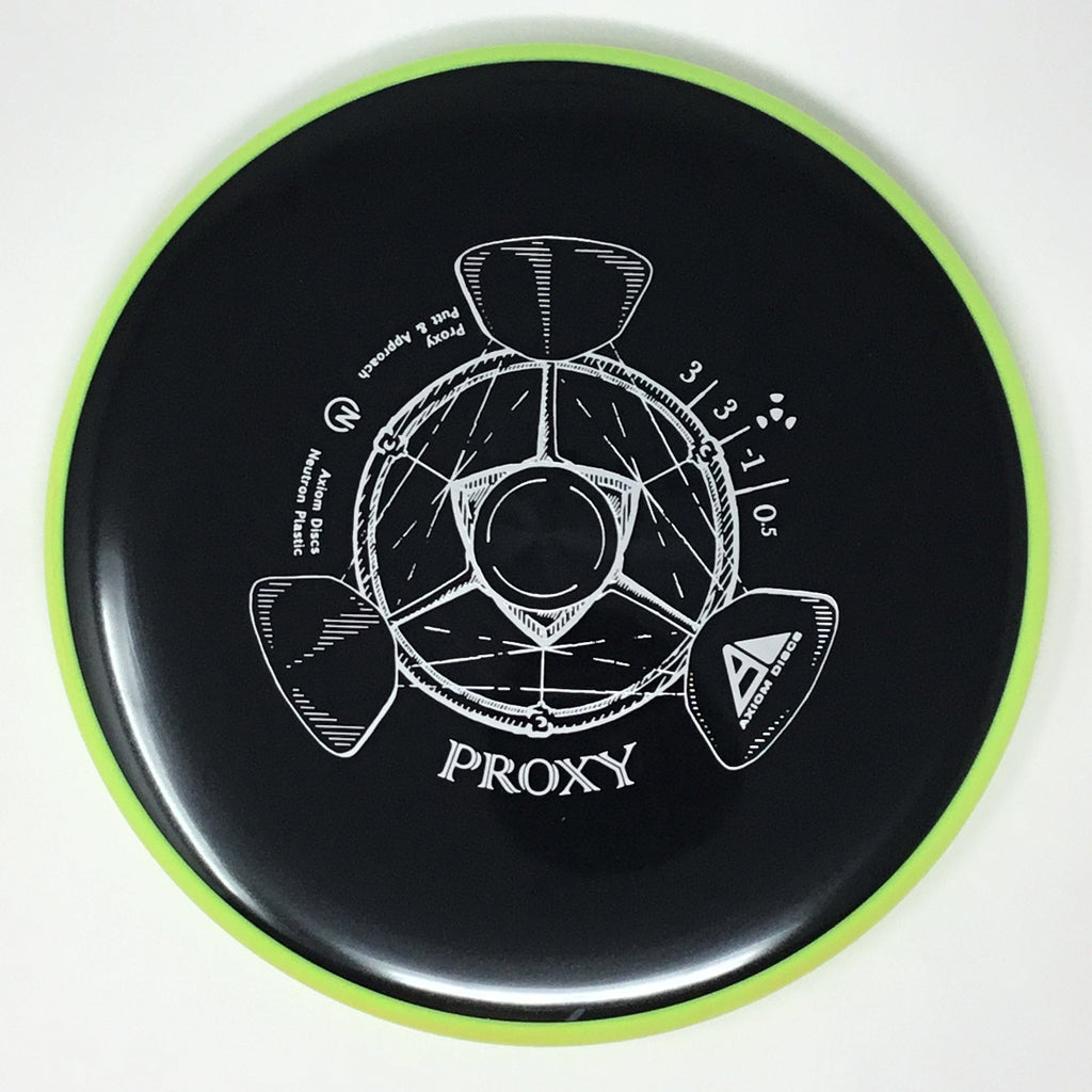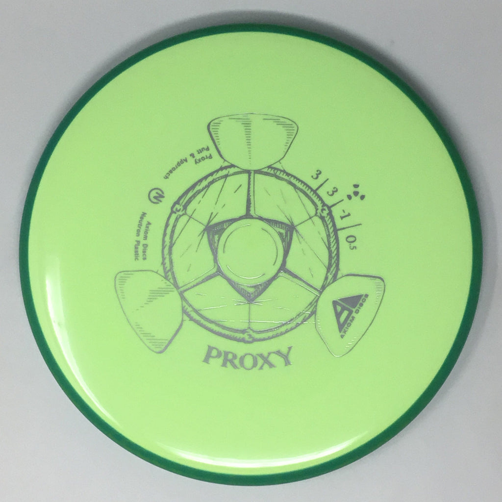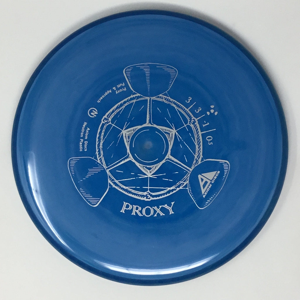 The Proxy is a straight-stable putt and approach disc. The Proxy shares the Envy mold’s core, lending the same low-profile feel and solid grip, along with a short wing width and wide flight plate diameter for superior glide. The Proxy sets itself apart from the Envy with a remarkably straight forward-fading finish. A bit of high-speed turn potential allows the Proxy’s lines to be manipulated over a broad range of power and helps less powerful throwers achieve straight putter drives. The Proxy’s defining flight characteristic is its ability to hold a straight flight at high speeds, but demonstrate the low-speed straight properties of a much more understable model’s ending stage. The Proxy is designed to exhibit the neutral straight-flying characteristic of classic “main” putters. Rather than requiring an extra wind-resistant overstable complement solely for harder throws, the Proxy is able to lock in with a similar high-speed stability as the Envy. Its neutral stability at a wide range of speeds will help the Proxy find its way into every Axiom thrower’s bag.