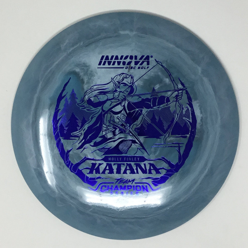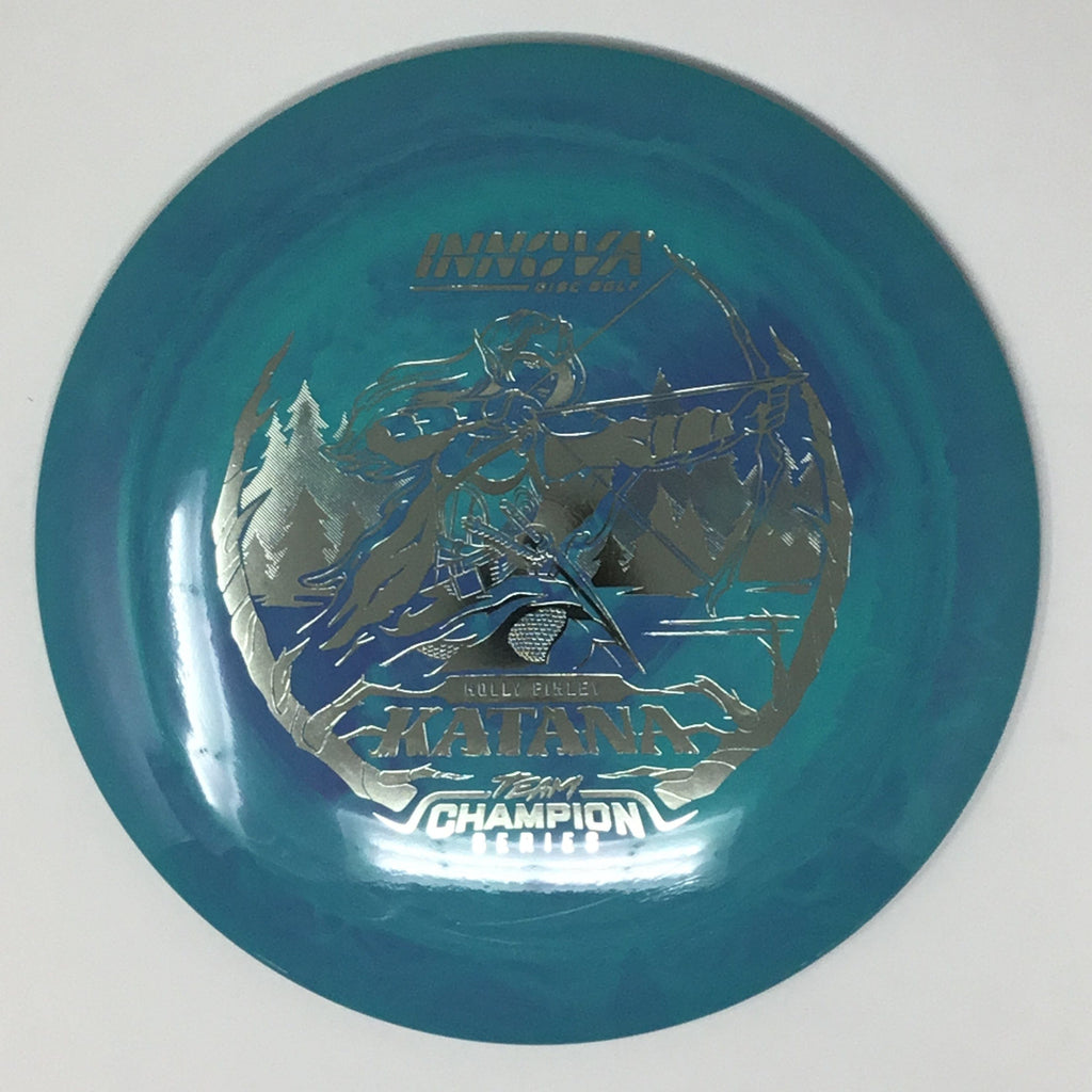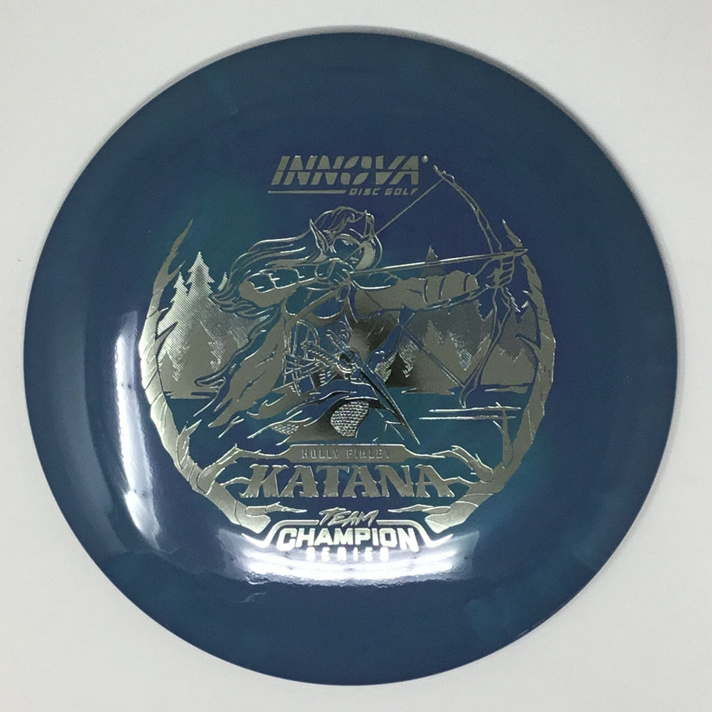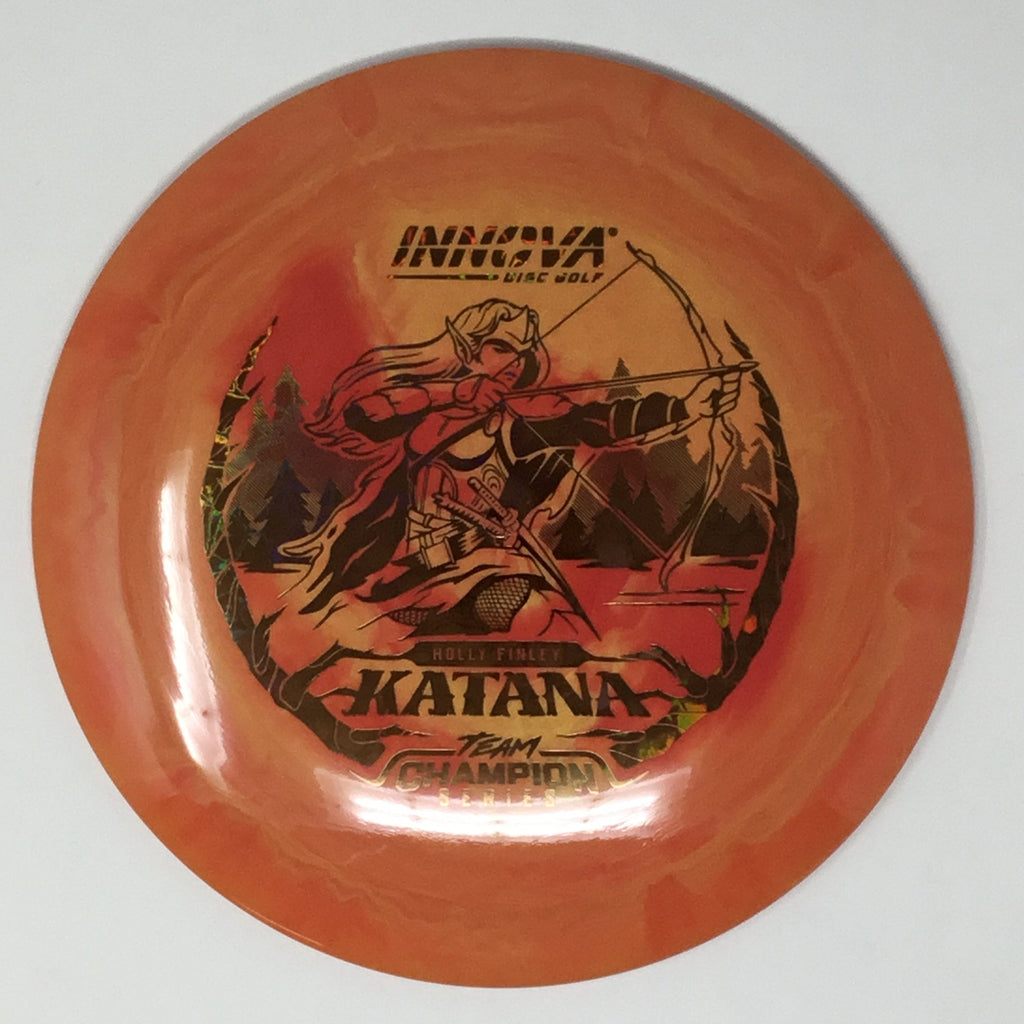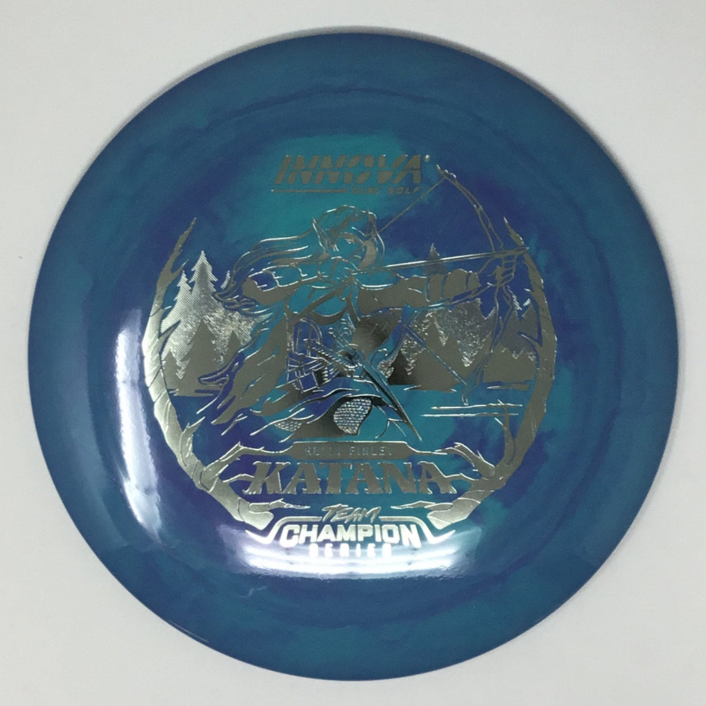 The Katana is built with the finesse thrower in mind. Recommended downwind driver. Hit the angle right and watch it bolt out of sight. The physical characteristics resemble a Boss with the flight characteristics of a Sidewinder on steroids. Master the technique of Katana and rule the course. Champion Katanas have slightly different flight characteristics at (13 / 5 / -2 / 3).