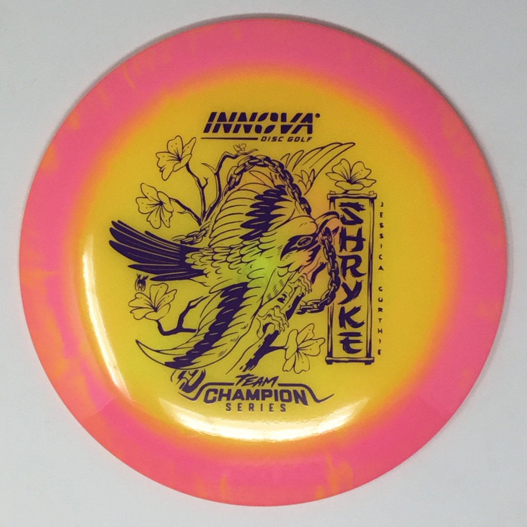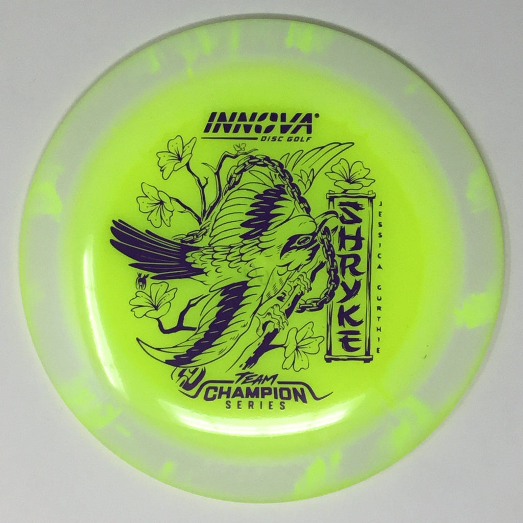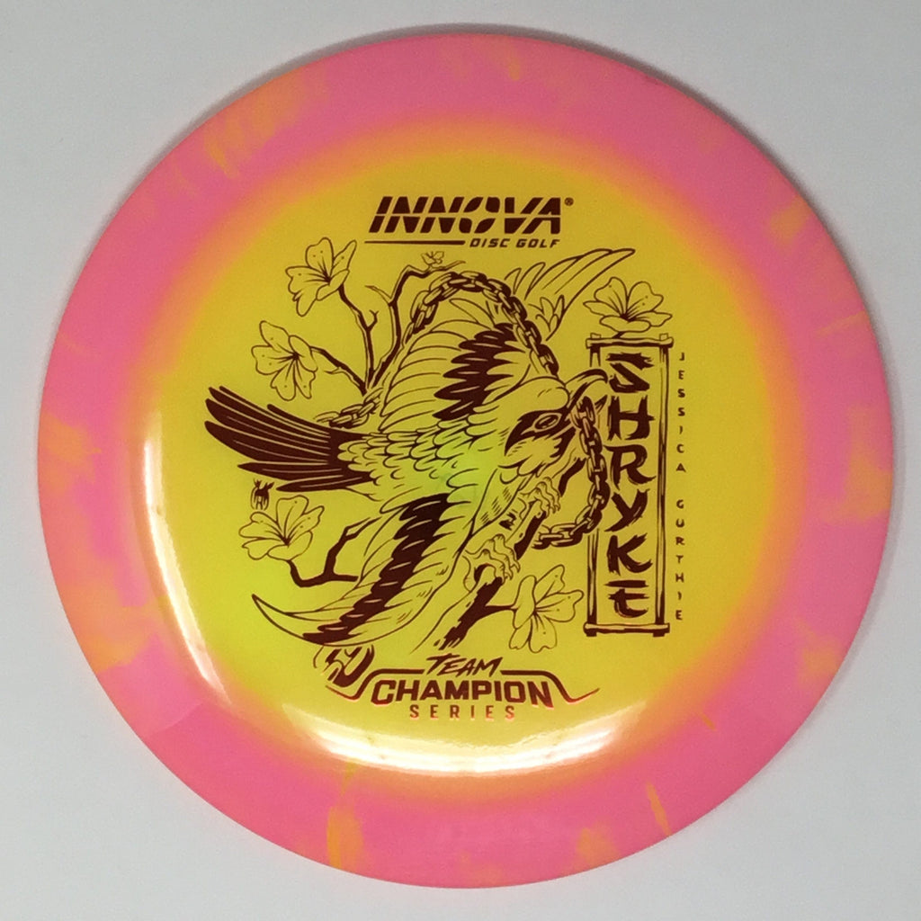 The Shryke is an easy to throw, very long range driver for a wide variety of players. A mild high speed turn puts the Shryke in glide mode, which along with its high aerodynamic speed, give it incredible distance. The low speed fade is also mild, which makes it easy to keep on the fairway. The Shryke is similar to the popular Tern but faster and slightly more high speed stable.