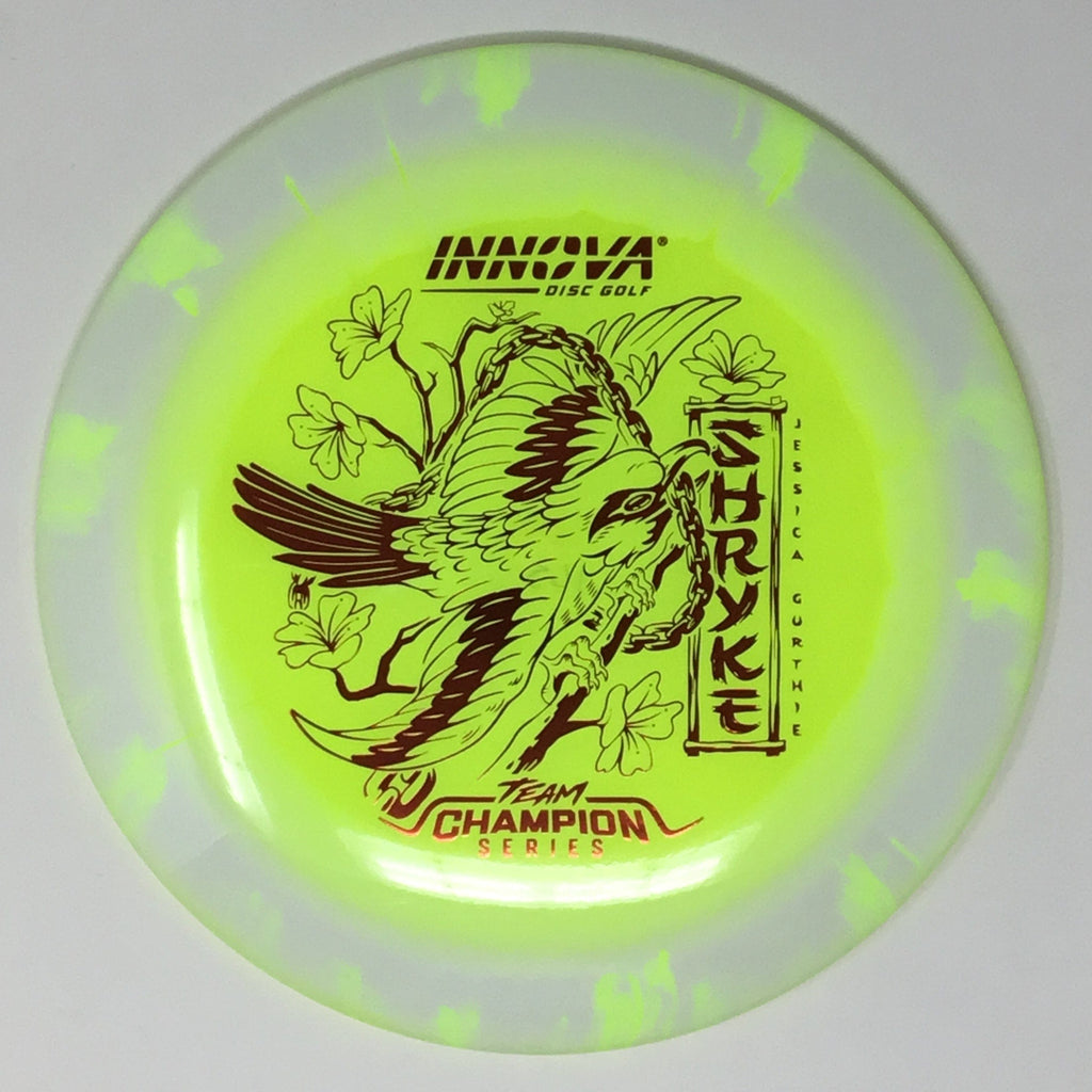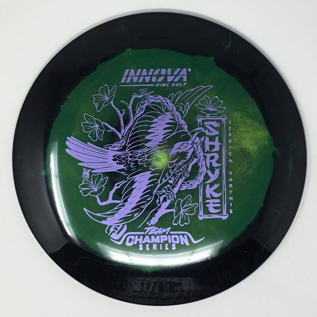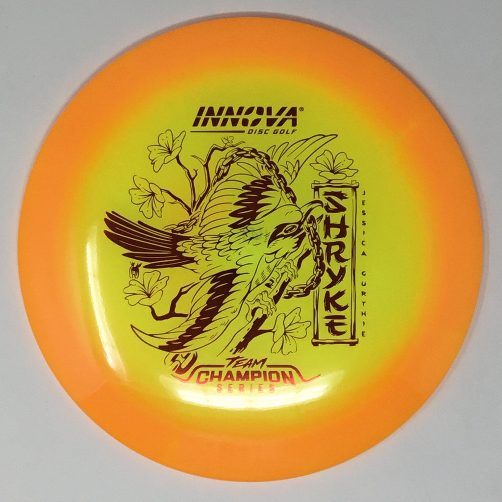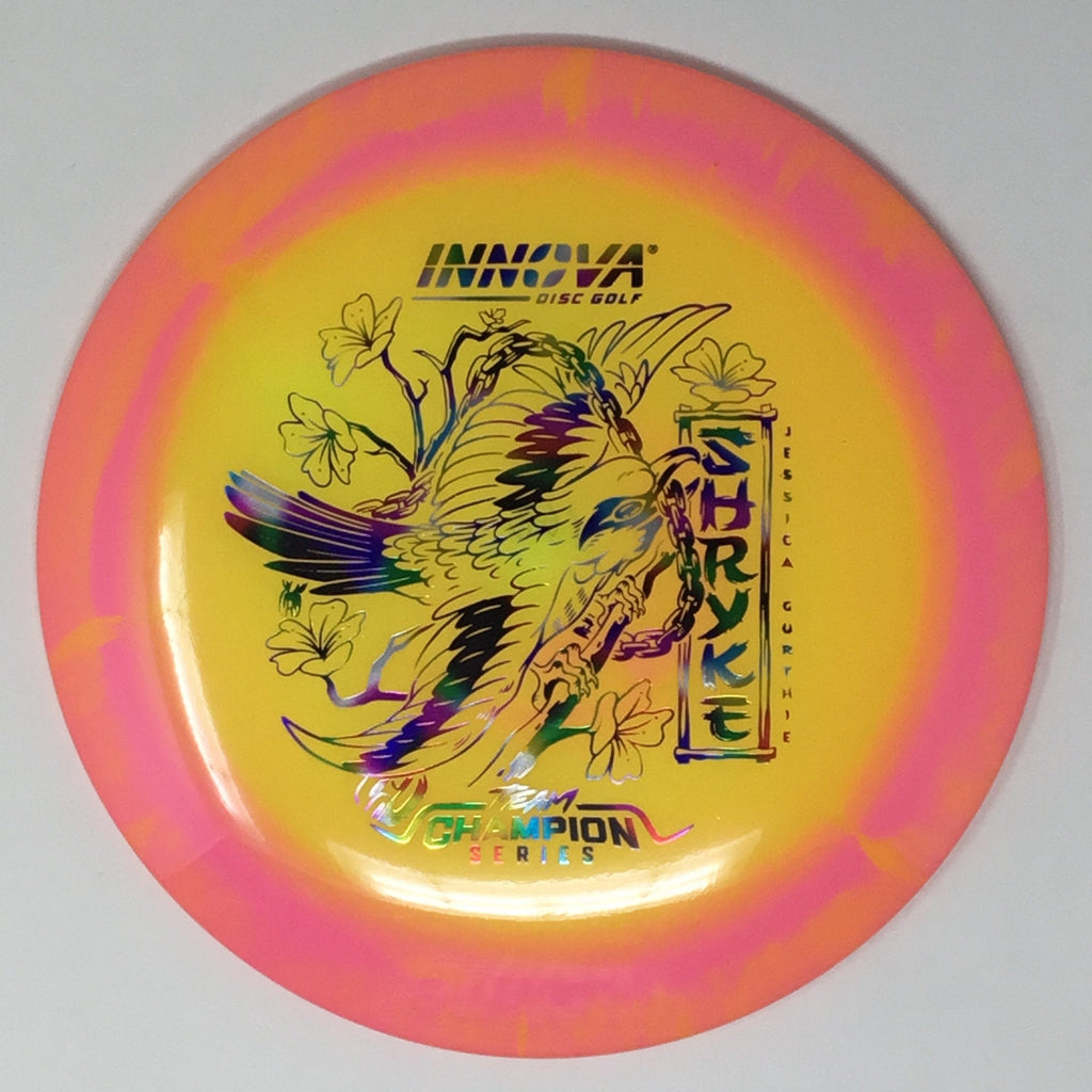 The Shryke is an easy to throw, very long range driver for a wide variety of players. A mild high speed turn puts the Shryke in glide mode, which along with its high aerodynamic speed, give it incredible distance. The low speed fade is also mild, which makes it easy to keep on the fairway. The Shryke is similar to the popular Tern but faster and slightly more high speed stable.