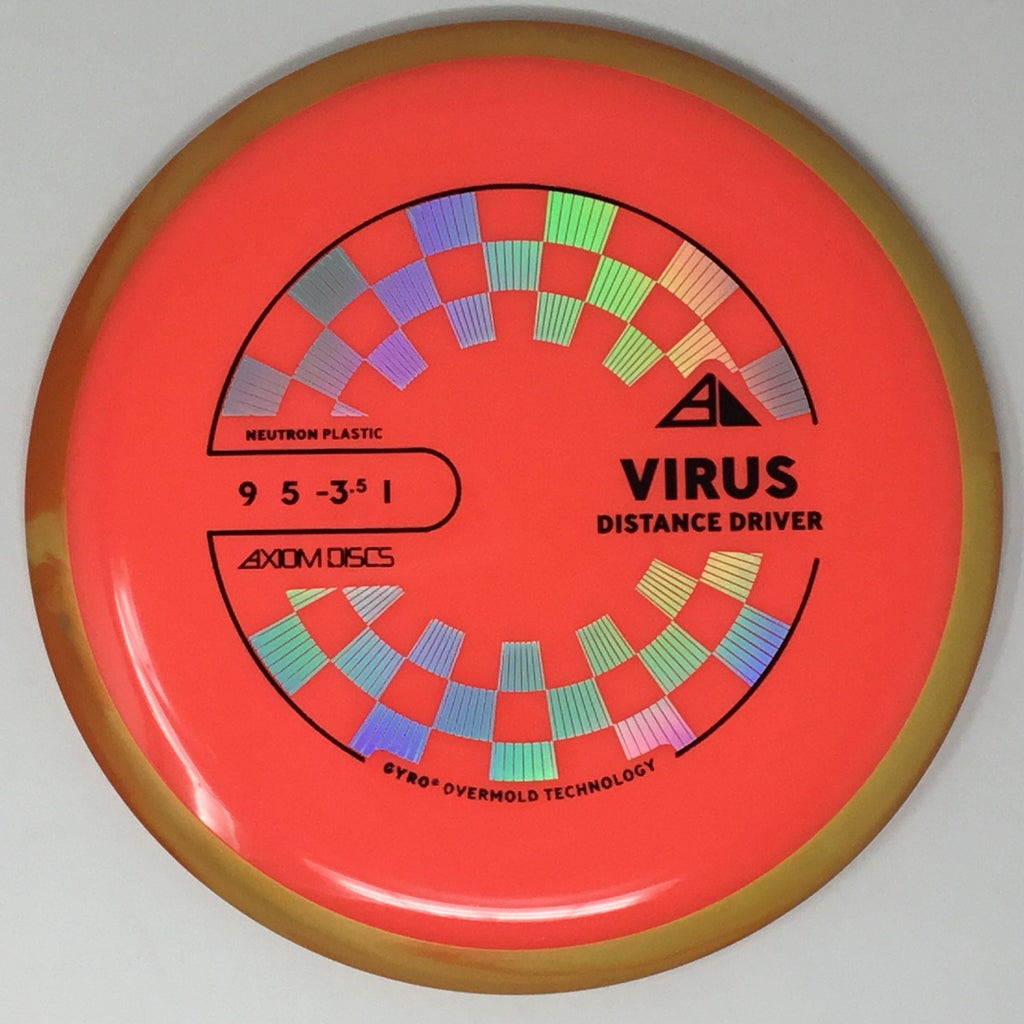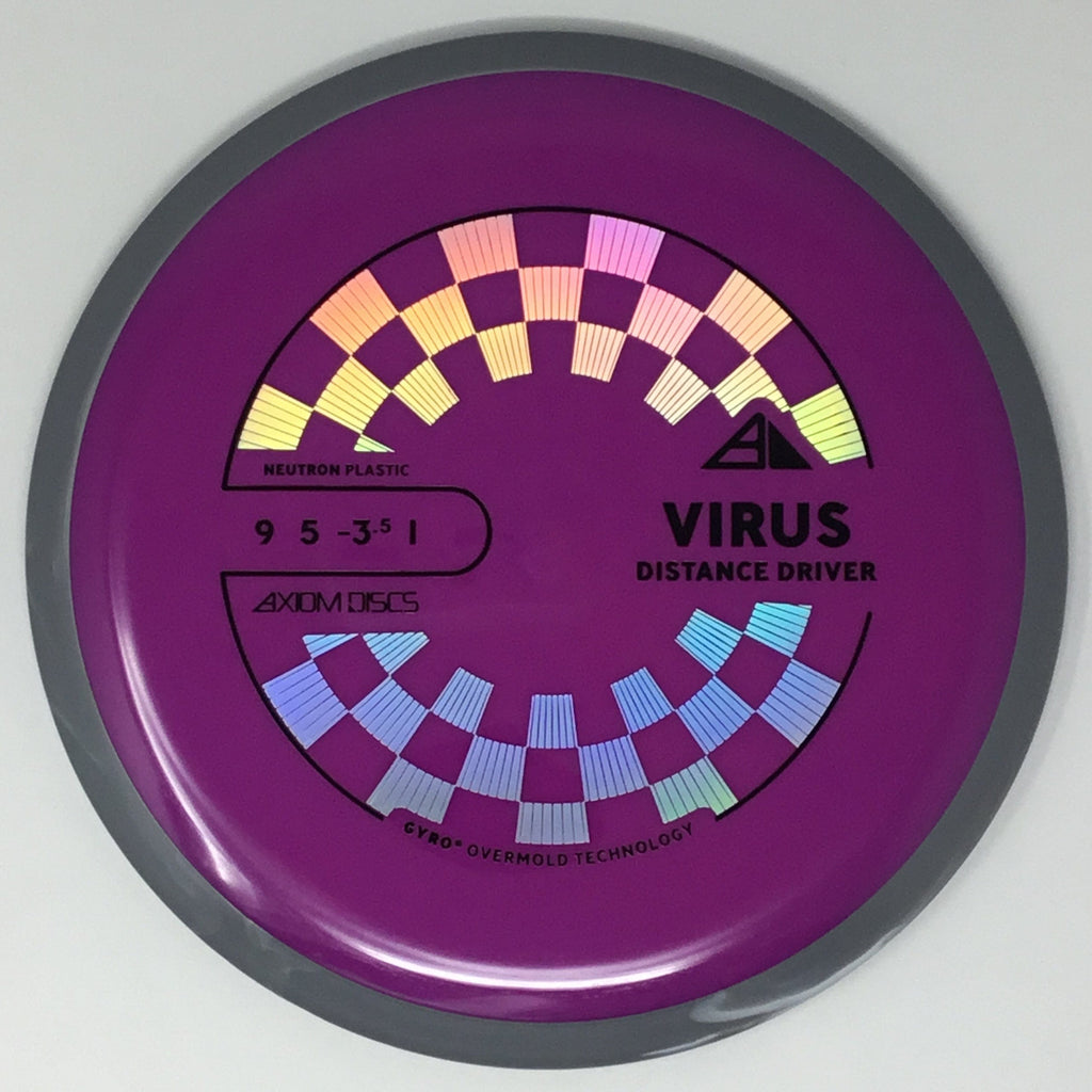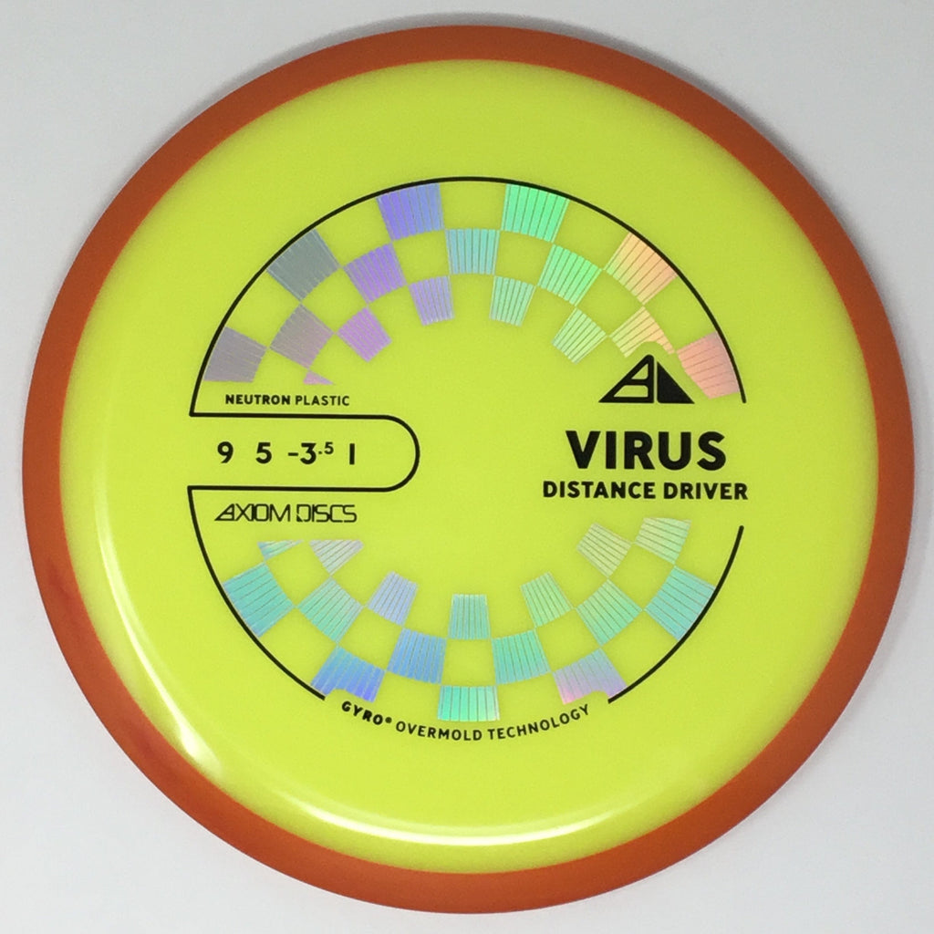 The Virus is an understable distance driver. The Virus is Axiom’s easiest to throw distance driver, with a glide and responsive understability that keeps it in the air. Power throwers will be able to flex huge turnover shots with straight forward fade. Average throwers will be able to extend and shape lines using the Virus’ turn and gentle fade. Compared to the MVP lineup, the Virus resembles a worn-in Impulse.